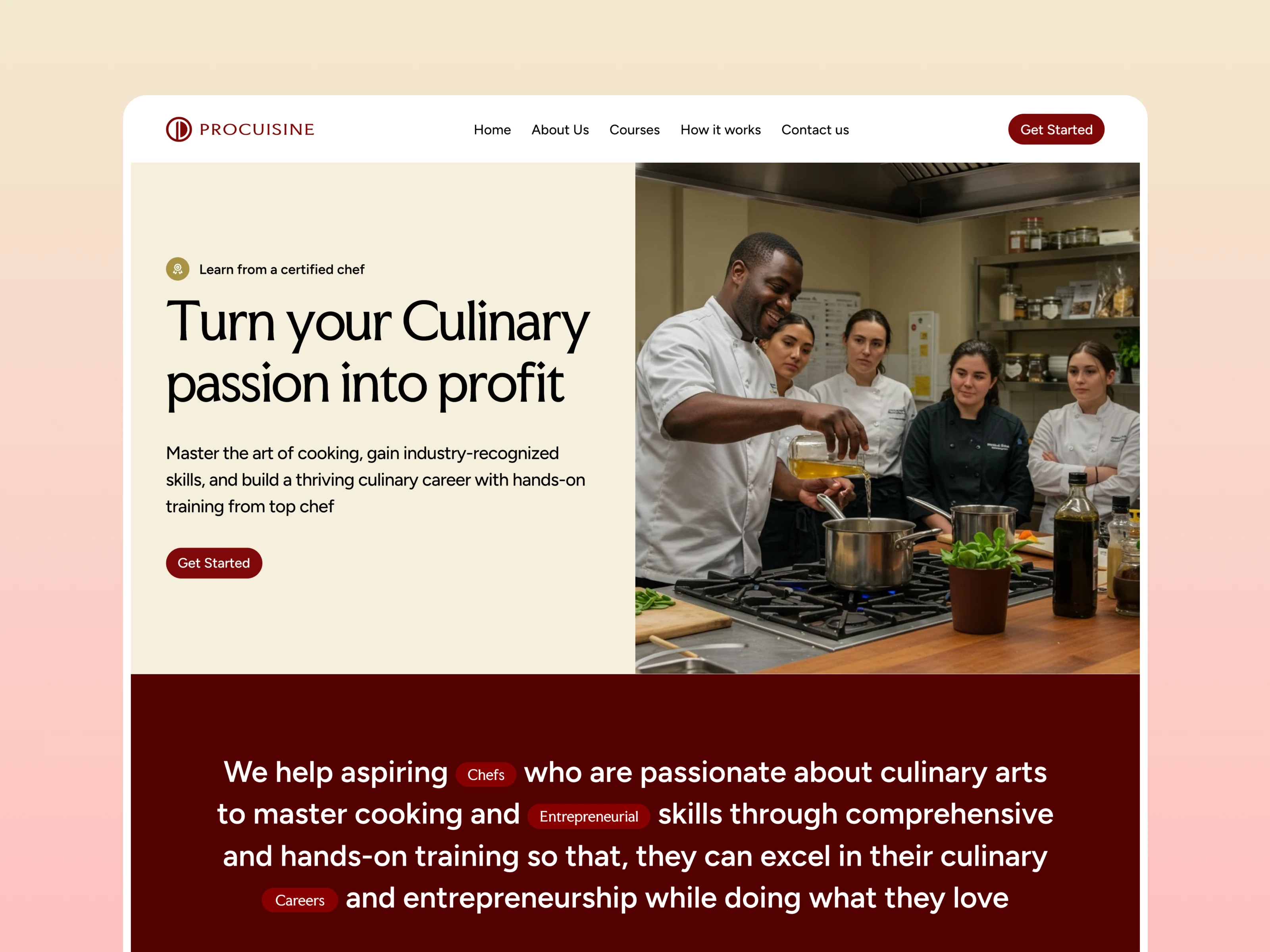 The homepage is structured into eight key sections, thoughtfully designed to guide users through the Procuisine experience. These include: a Hero section, Brand Message, Know Your Course (KYC) section, Call to Solution, Courses Overview, Testimonials, Instructor Highlights, Enrollment Process, a clear Call to Action (CTA), and a Footer. The layout is fully responsive across tablet and mobile devices.