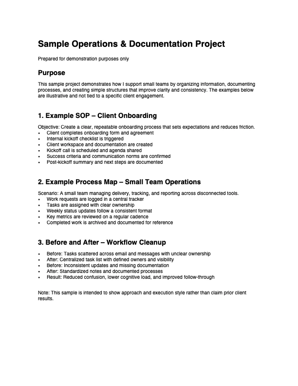 Sample operations project showing how I reduce friction by organizing workflows, documenting processes, and creating clear, repeatable systems for small teams.