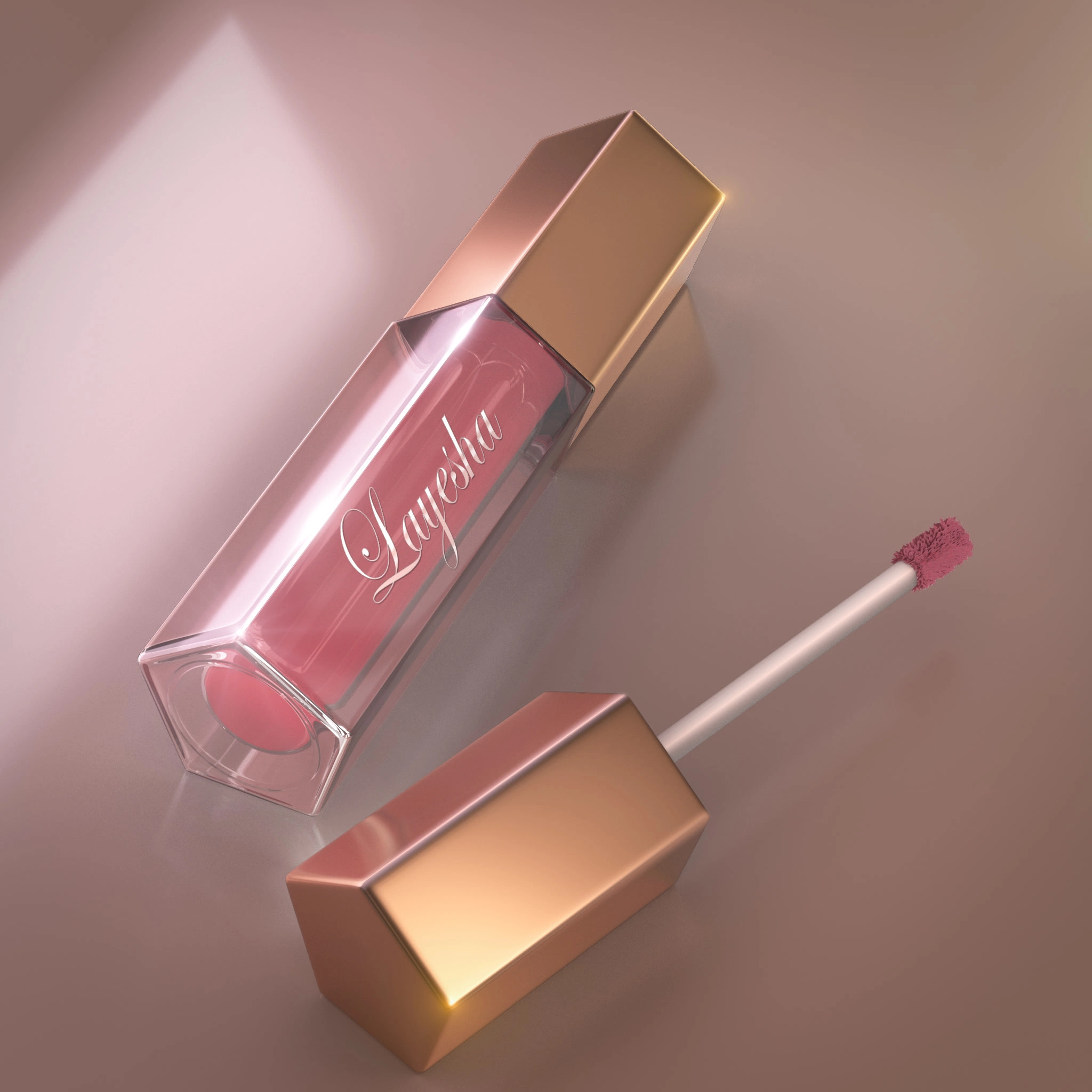 A 3D product render of a lip gloss presents the product with glossy, high-definition realism, capturing the shine of the bottle, the reflective cap, and the smooth texture of the applicator. The render highlights luminous lighting, transparent materials, and rich, vibrant color inside the container to create a luxurious, eye-catching finish. Perfect for advertisements, social media, and e-commerce visuals, the design emphasizes elegance, clarity, and premium cosmetic appeal.