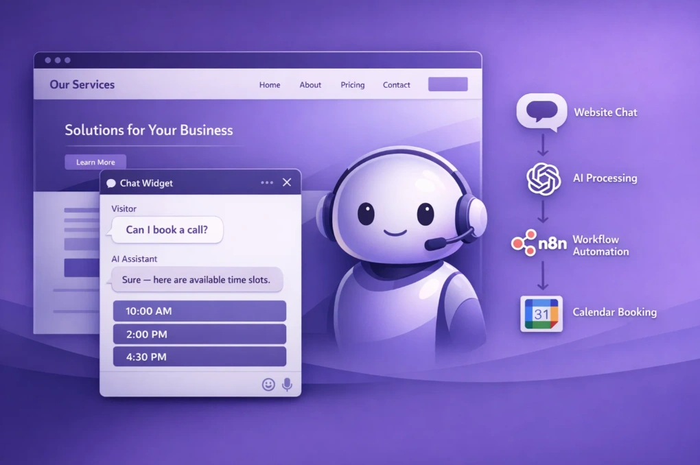 Built a 24/7 AI website chatbot that qualifies leads, books calls via Google Calendar, and increases conversions without manual sales involvement.