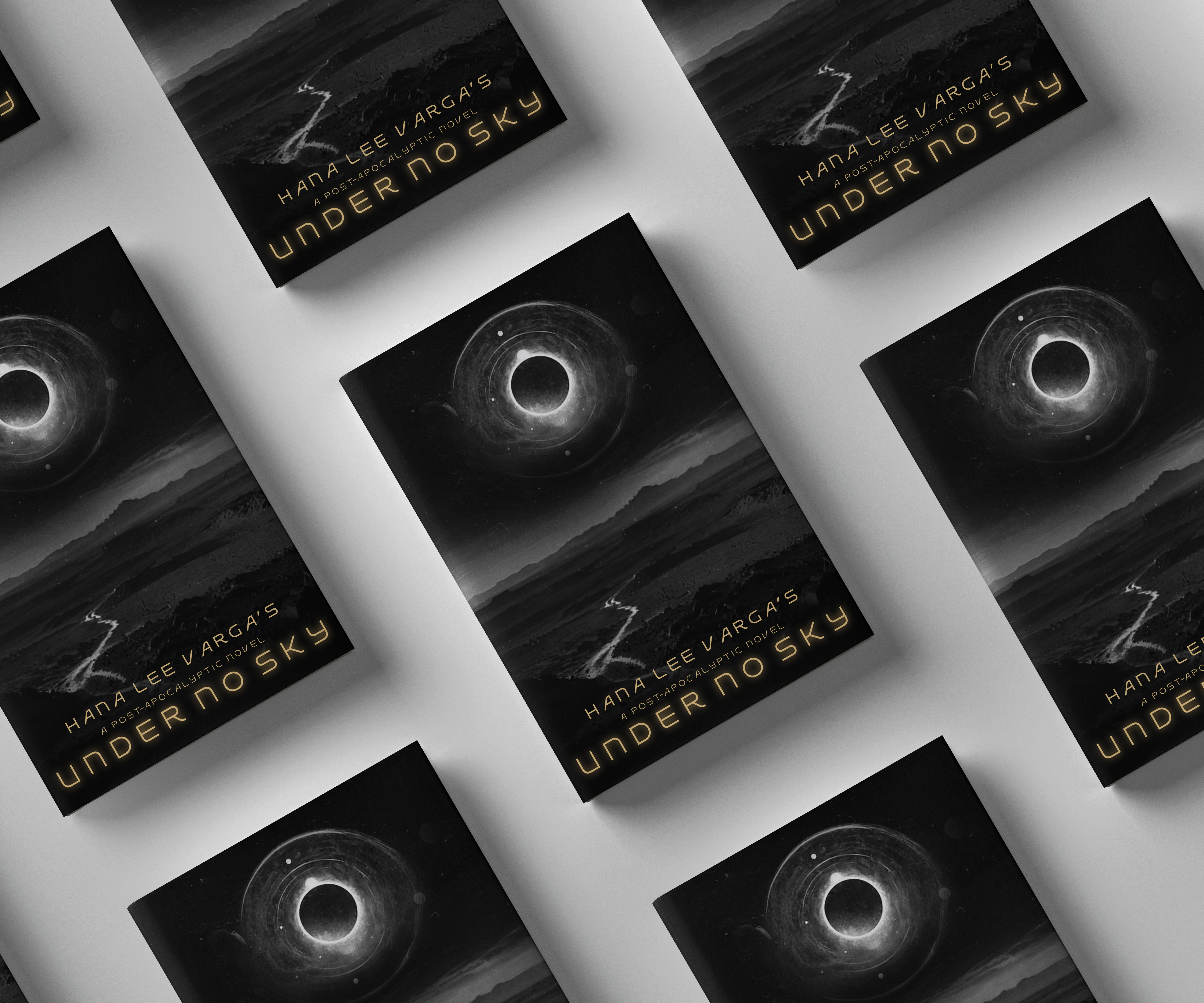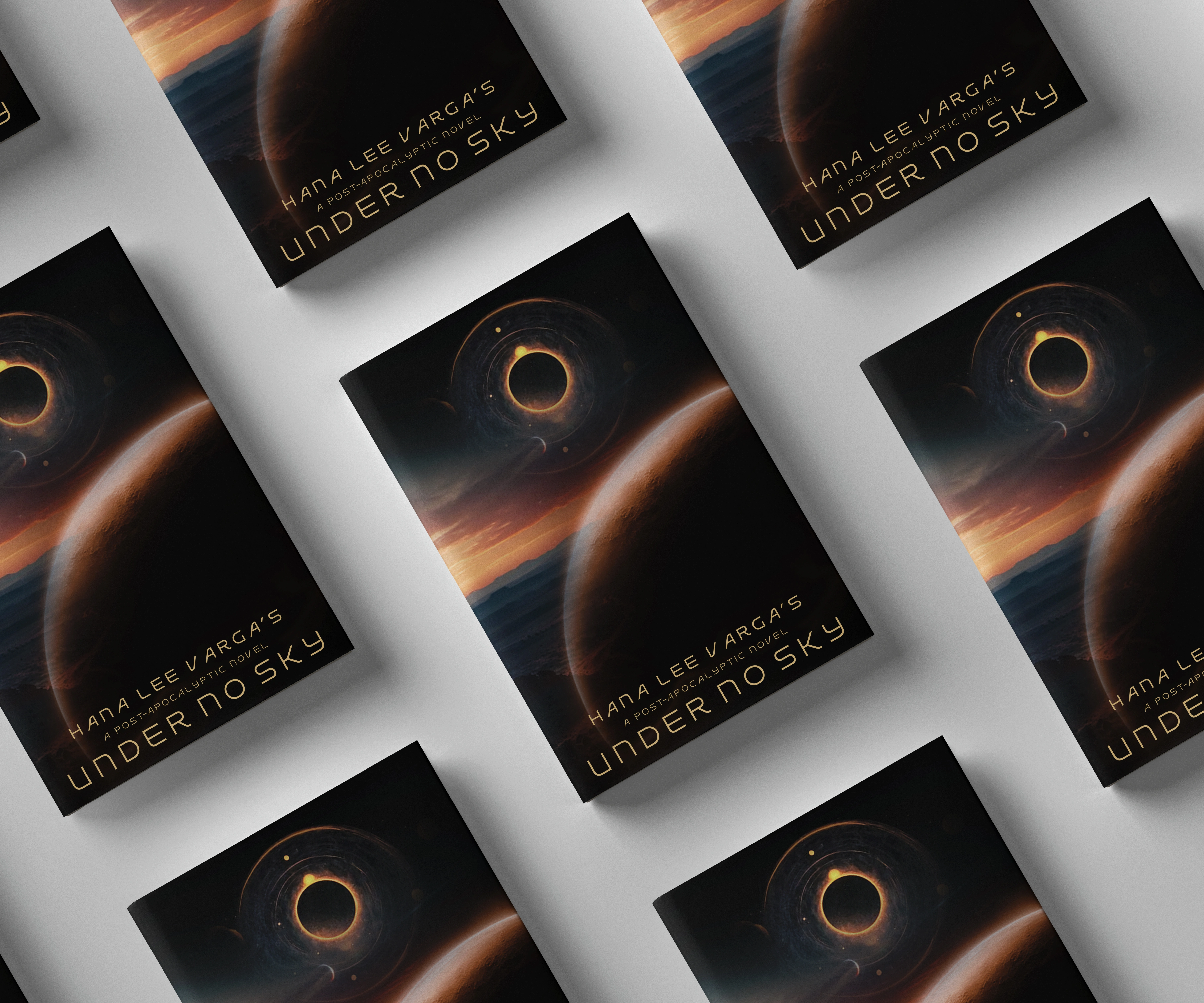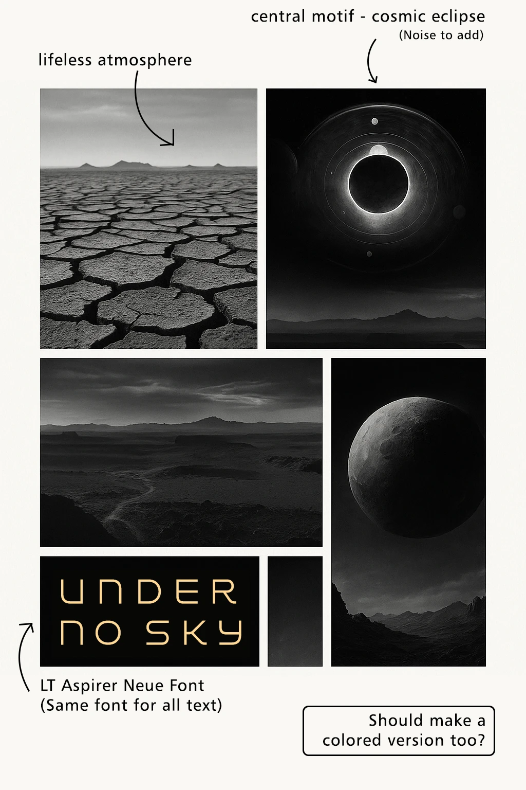 “Under No Sky” is a conceptual book cover design crafted for a post-apocalyptic science fiction novel. The visual narrative aims to reflect a barren, dystopian world where the sun no longer rises—and a lone path winds through forgotten terrain. The absence of sky is not only literal, but symbolic of hopelessness, loss, and survival.