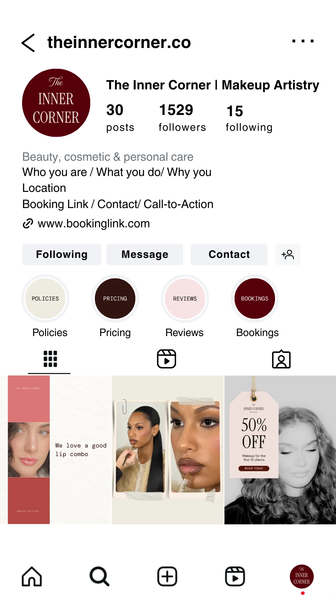 Developed brand identity and social media design for The Inner Corner, a Melbourne-based makeup artistry business.