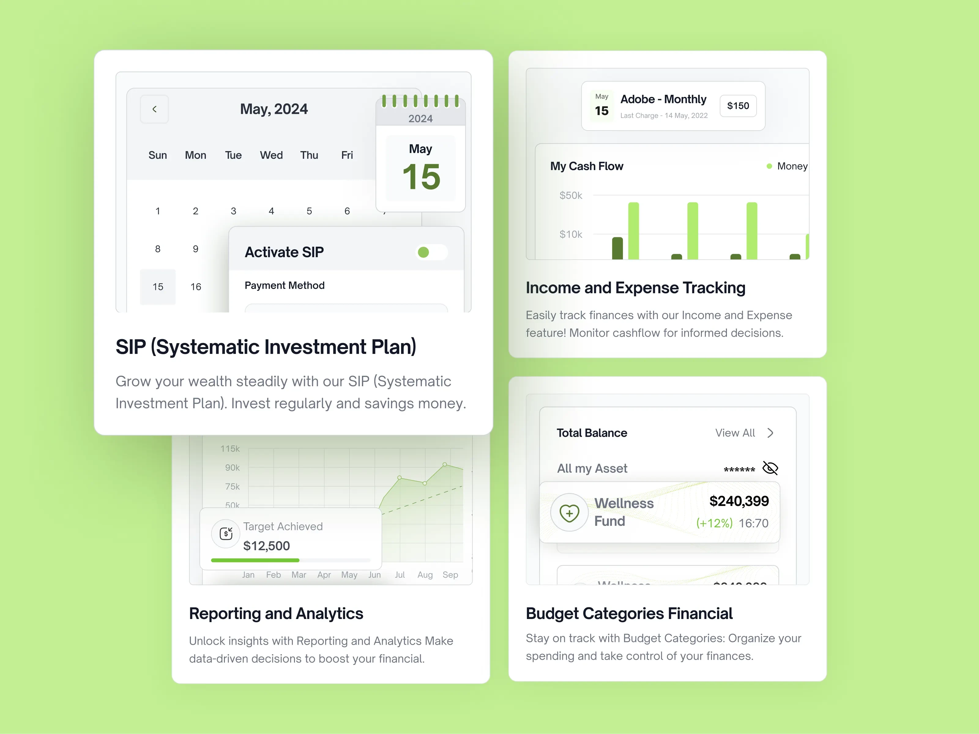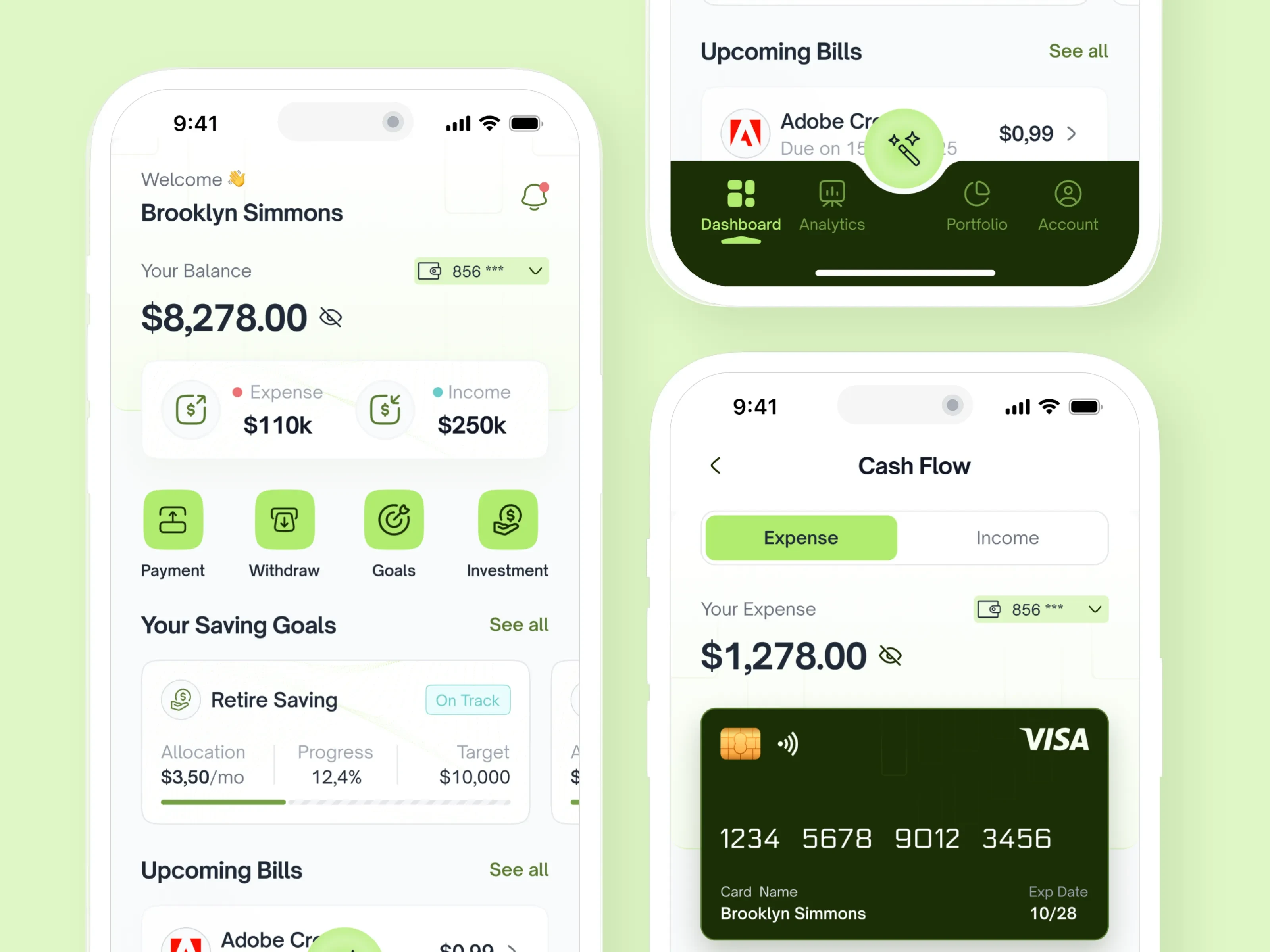 Led UI design for an AI finance app, including mobile, dashboard, and landing page—focused on clarity, budgeting tools, and wealth-tracking flows.