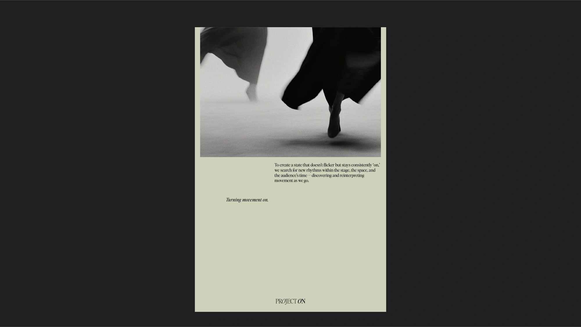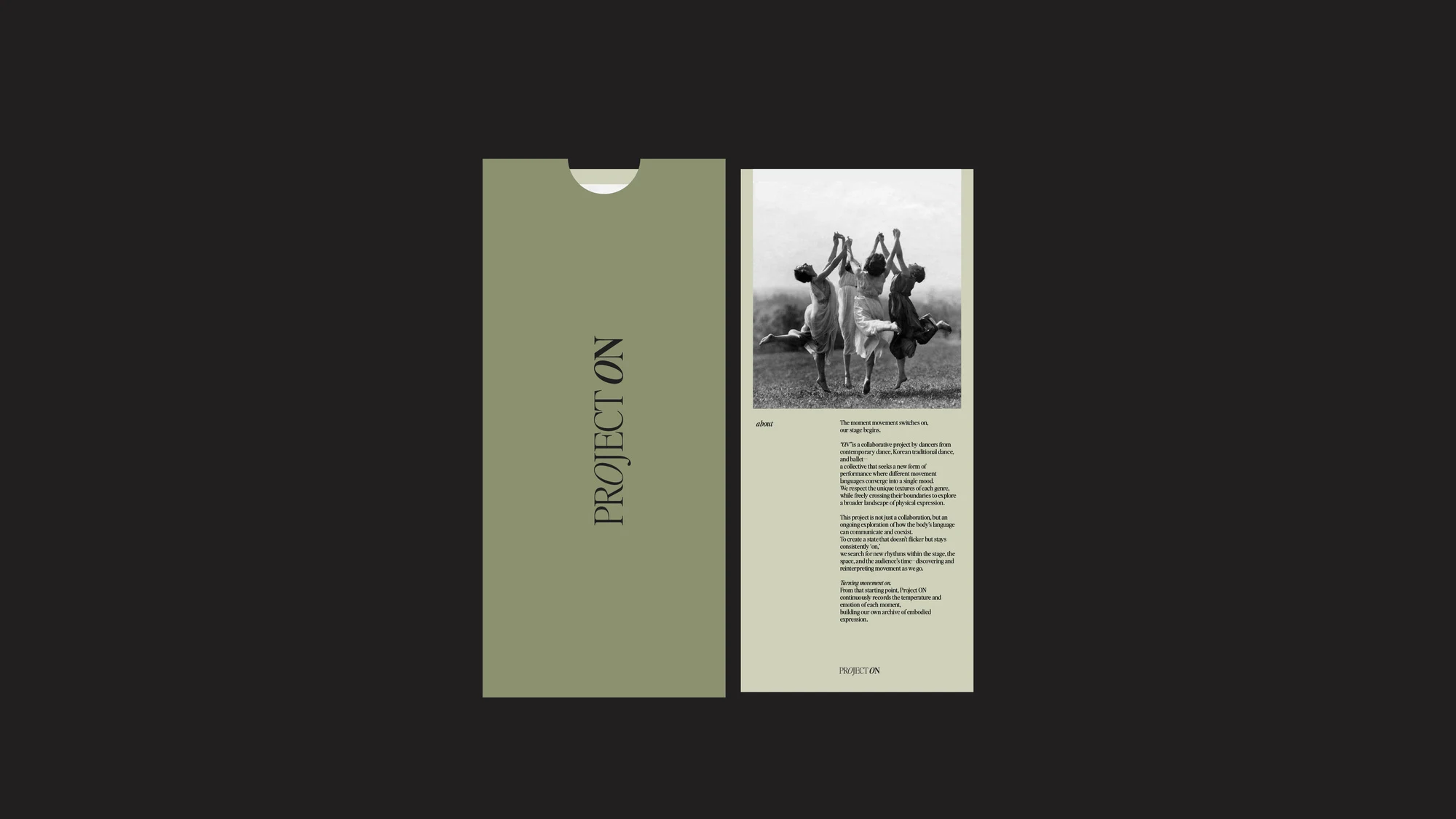 The brand identity for Project ON was developed for a collective of young dancers working across contemporary dance, Korean dance, and ballet. Each genre carries its own distinct texture, yet the project moves fluidly across these boundaries, unfolding a wider range of movement.