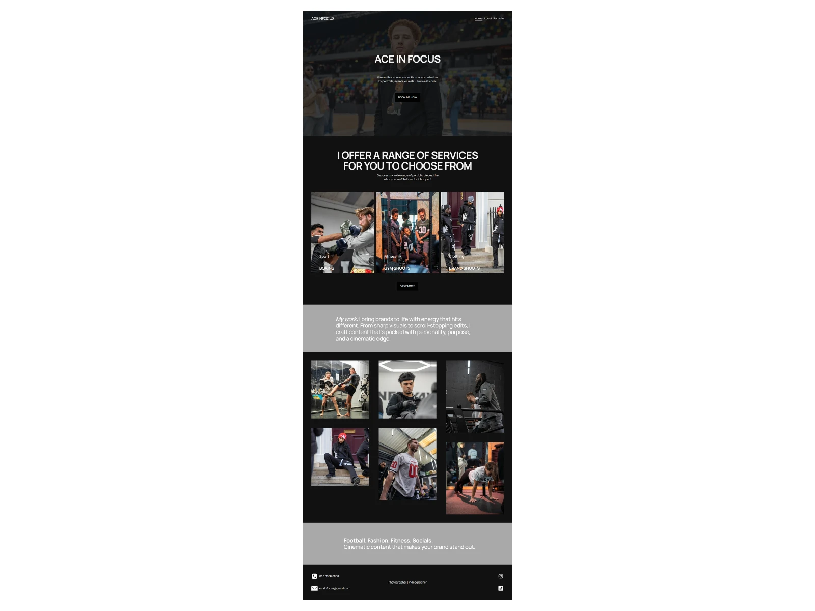 The homepage is designed to reflect his style - bold, clean, and purposeful. From the hero section to the content grid, every part of this layout is crafted to communicate clarity, energy, and intention. It highlights the range of services I offer - from dynamic boxing shoots to stylized brand sessions - with a cinematic edge that sets each project apart.