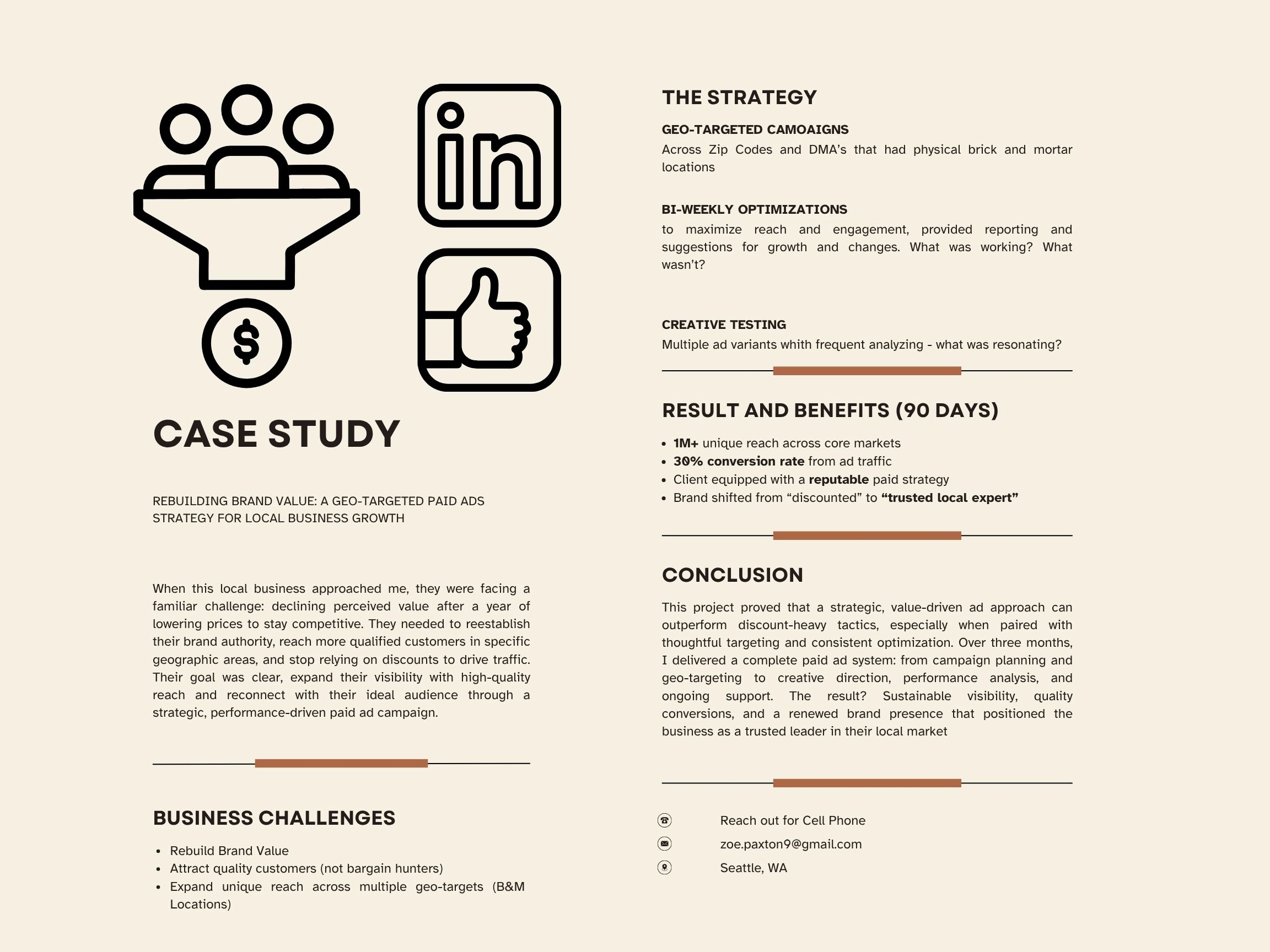 Planned, executed, and optimized a 3-month paid media campaign for a local service brand - driving 1M+ reach and 30% conversion across key markets.