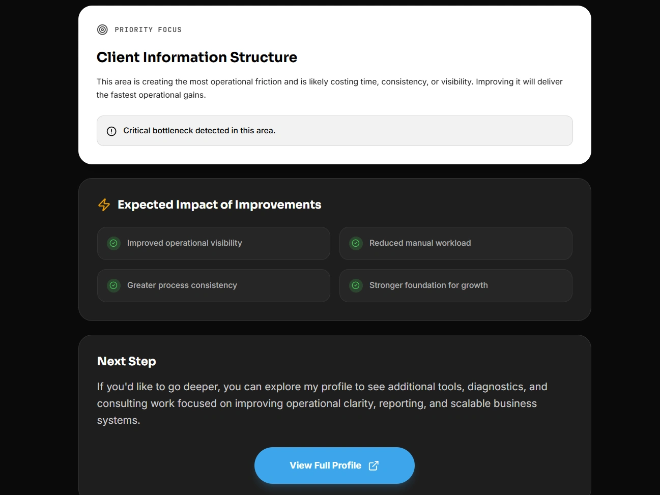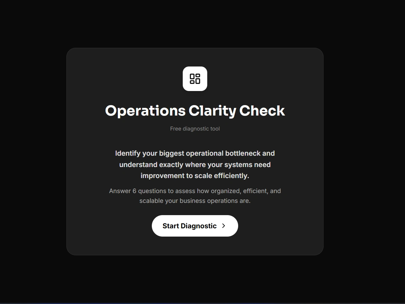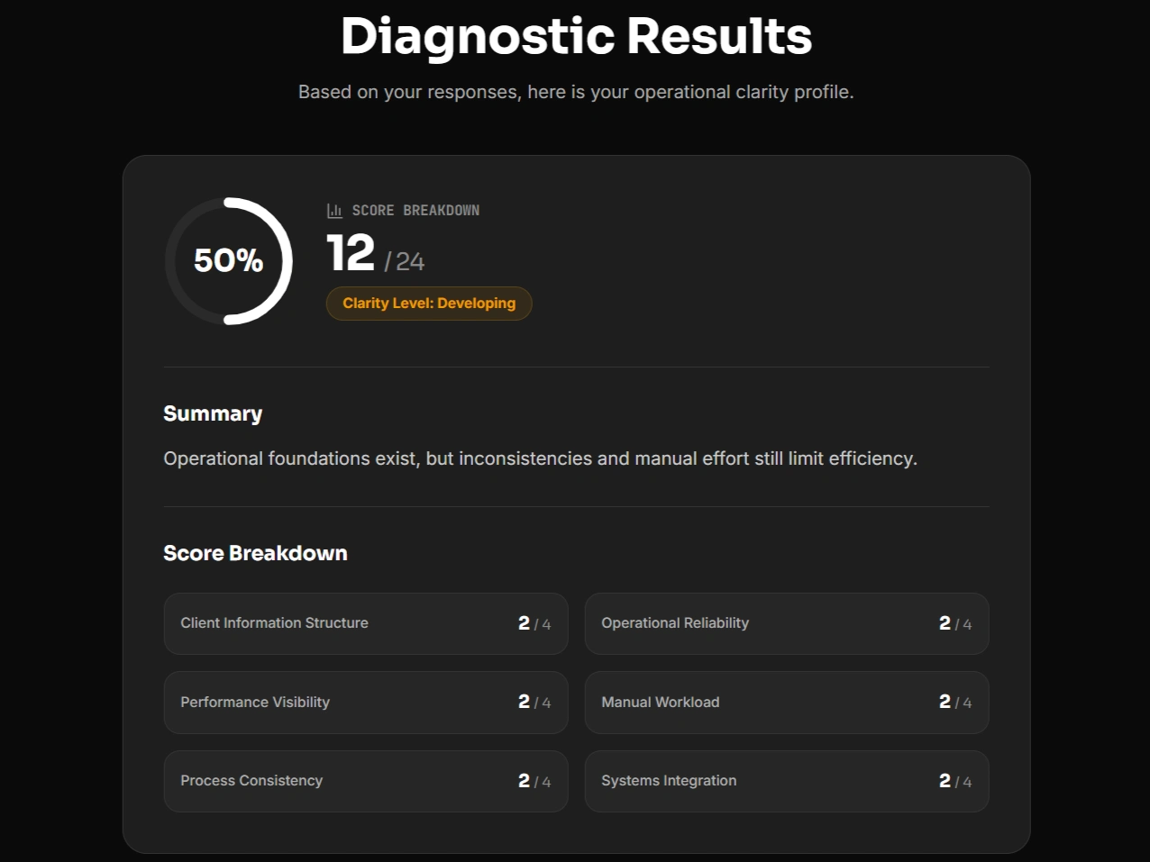 I built Operations Clarity Check to provide a fast, structured way to evaluate operational clarity and identify the single highest-impact improvement area.