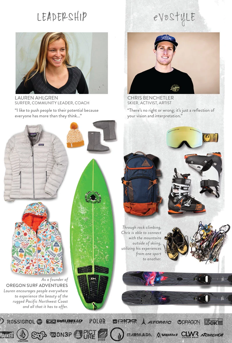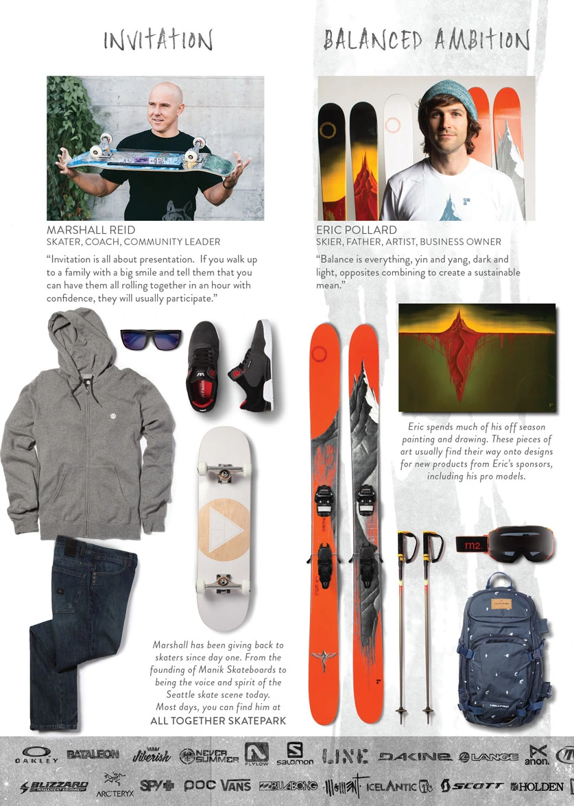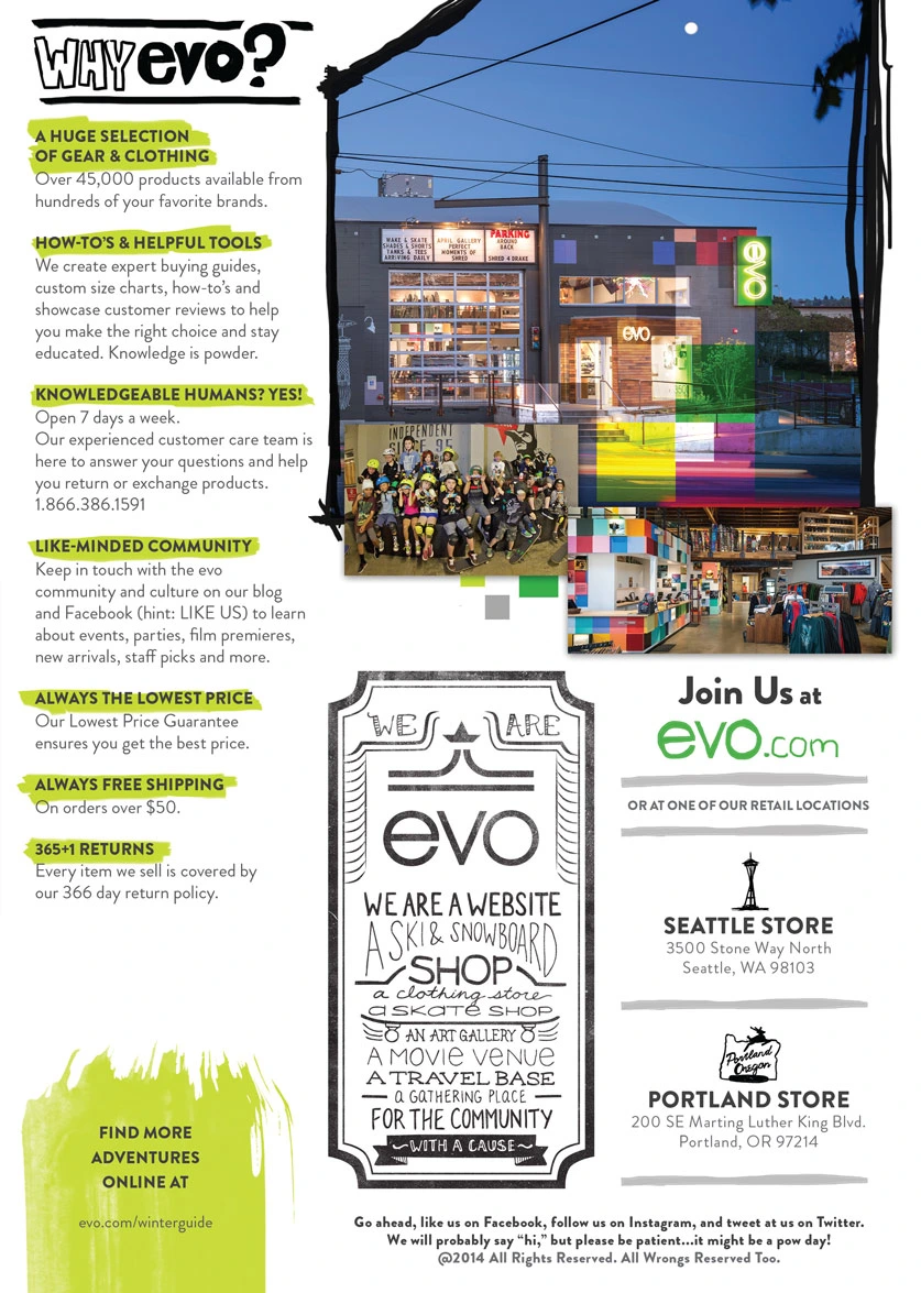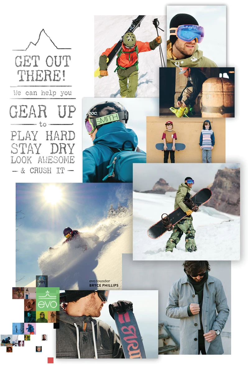 The piece is a true representation of the evo brand today. The models used in the interior product shots were all evo employees while each of the founding principles is represented by an evo Collective member that represents it well. The piece was featured in all major ski and snowboard magazines including Powder, Transworld Snowboarding, and Snowboard Mag. I also was part of the team that encouraged evo reaching out to a broader audience seeing the piece get placement in Outdoor Magazine.