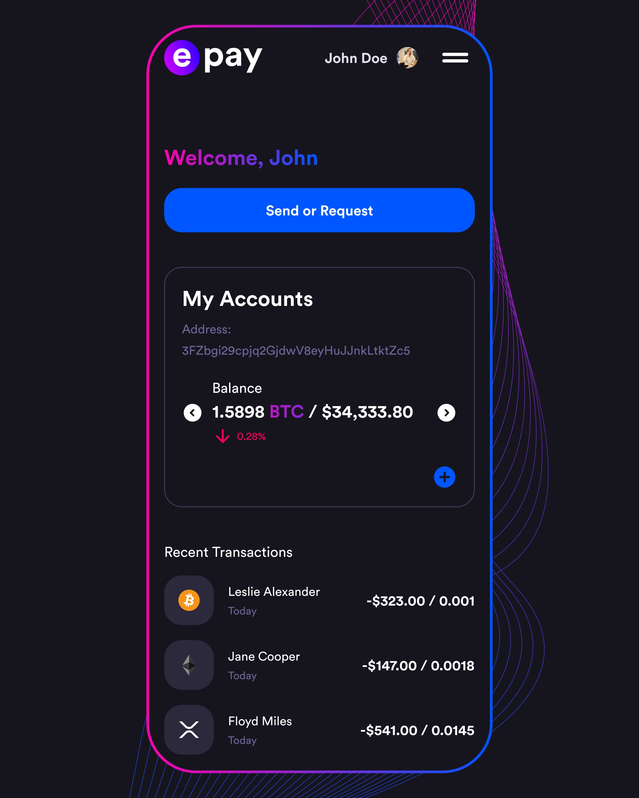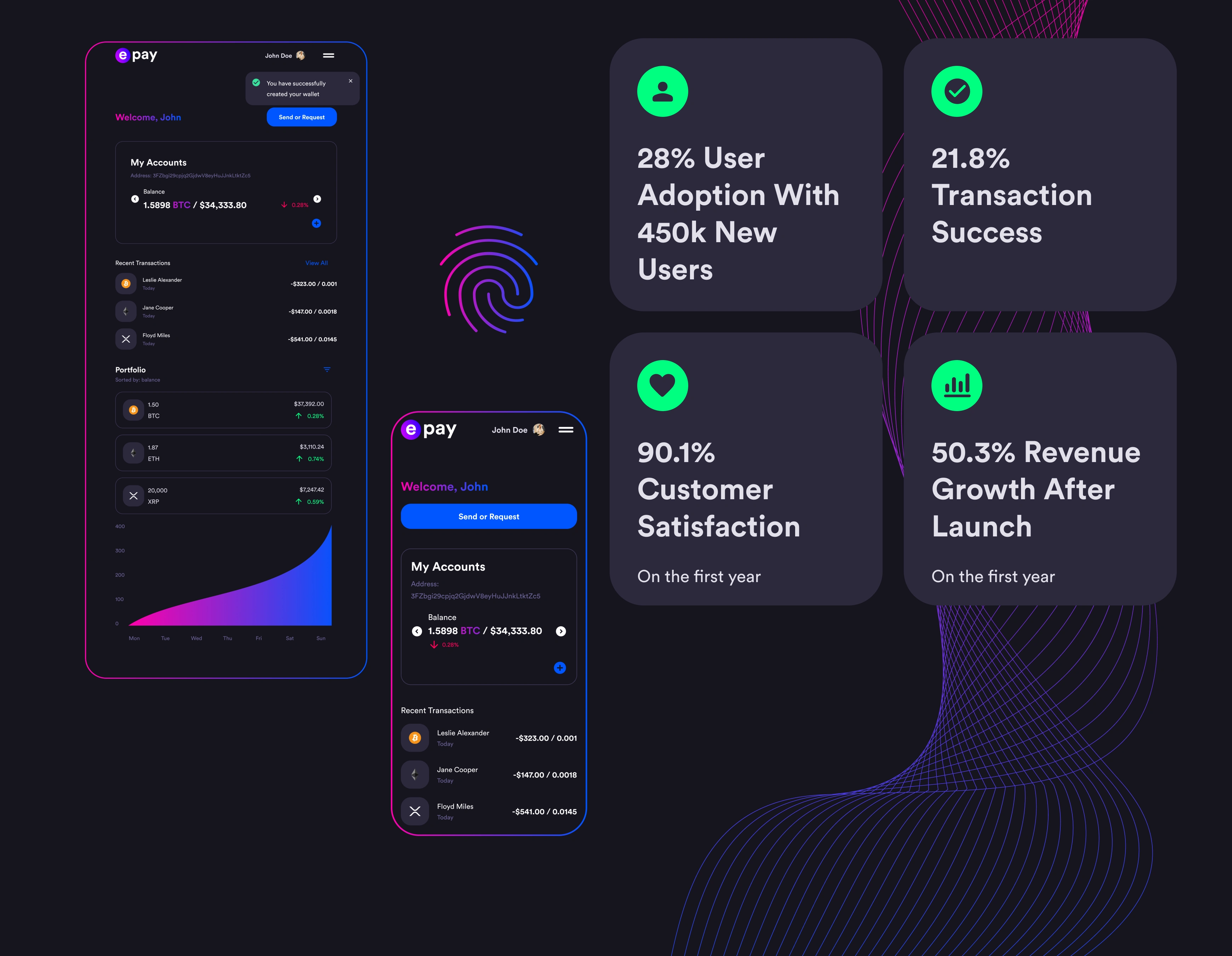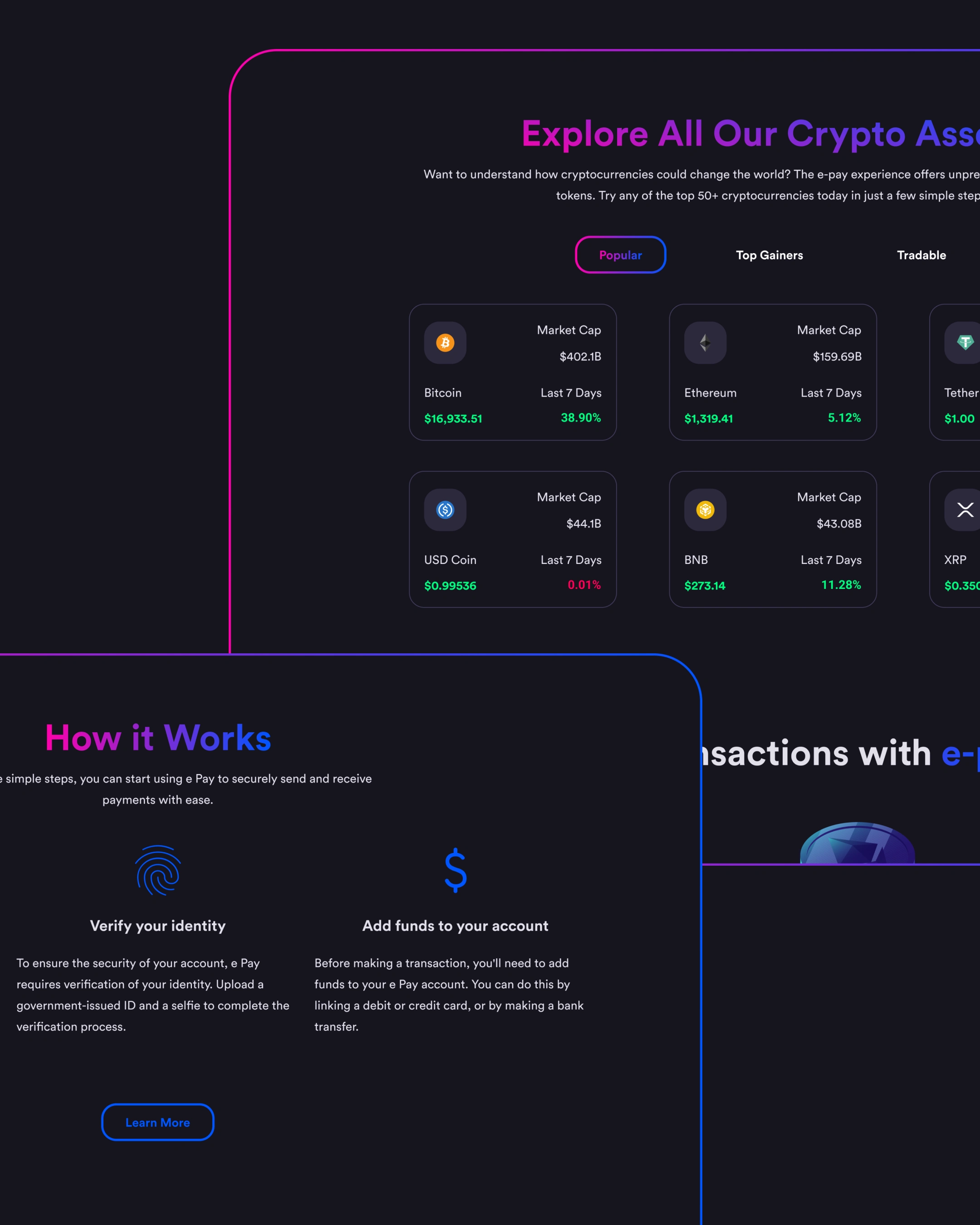 e-Pay is a cryptocurrency payment platform designed to make digital transactions as simple and reliable as traditional payments. I worked on creating a clean, trustworthy interface that balances modern aesthetics with security-first design.