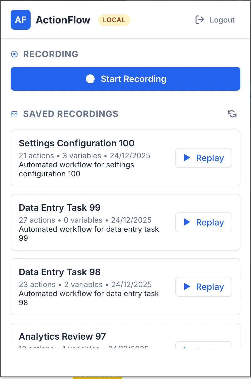 Delivered a sophisticated, full-stack automation ecosystem that bridges the gap between manual work and headless scripts. The final product features a trustworthy, high-performance interface that empowers teams to automate thousands of hours of manual data entry. By prioritizing "empathy for the operator," ActionFlow has evolved from a simple recorder into a robust enterprise tool ready for global scaling and complex SaaS integrations.