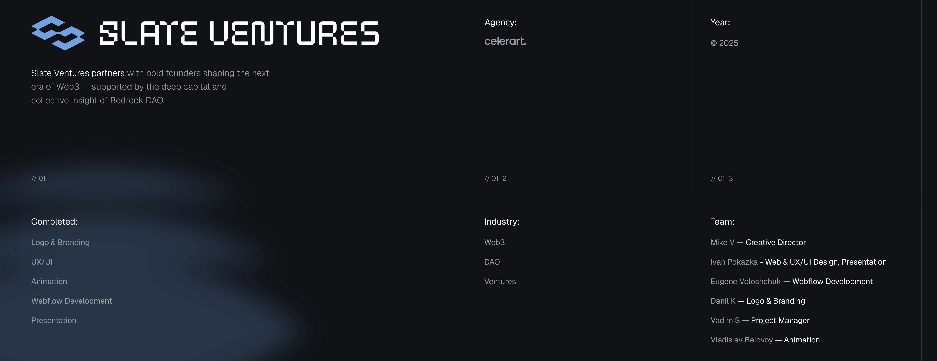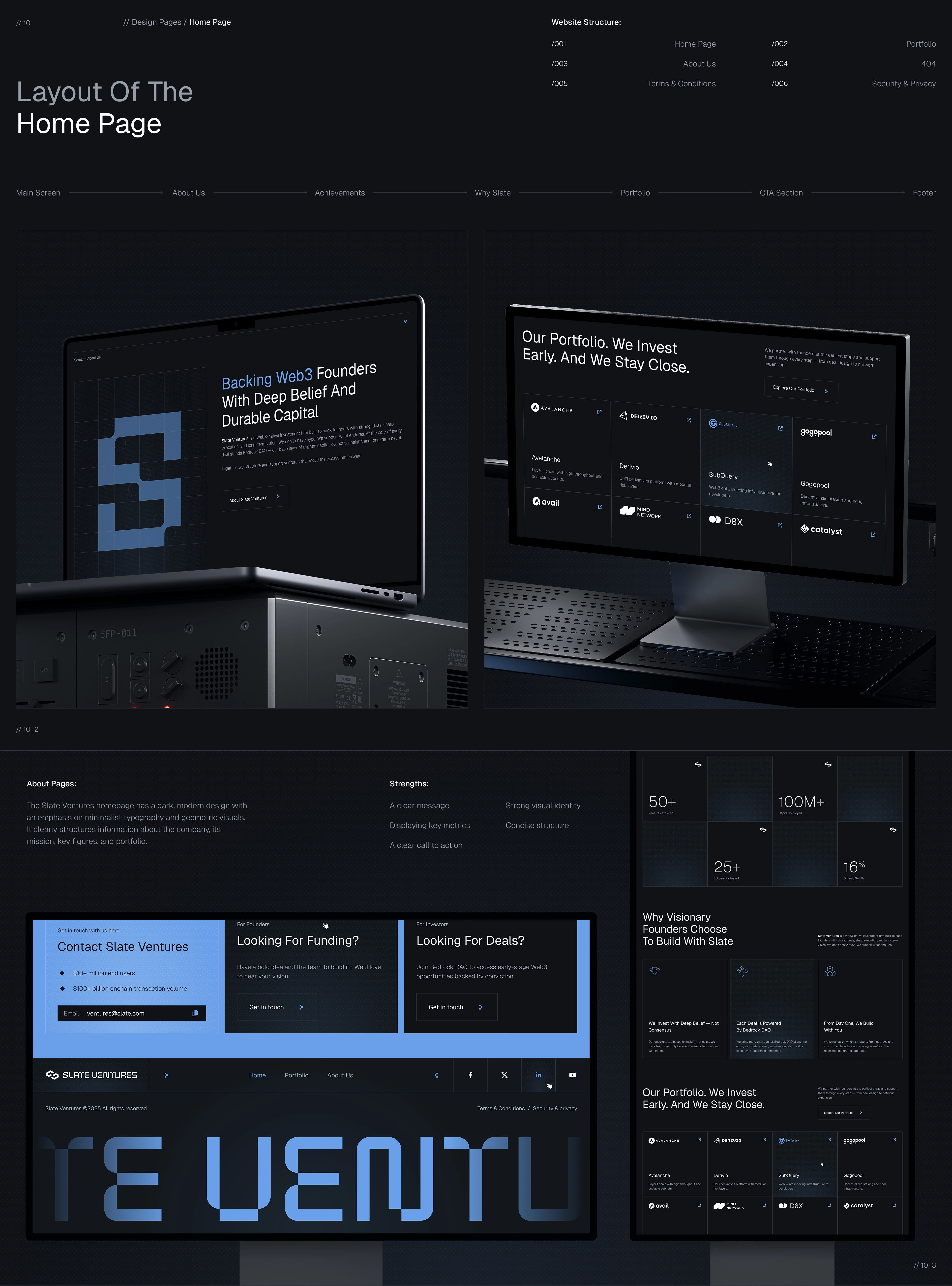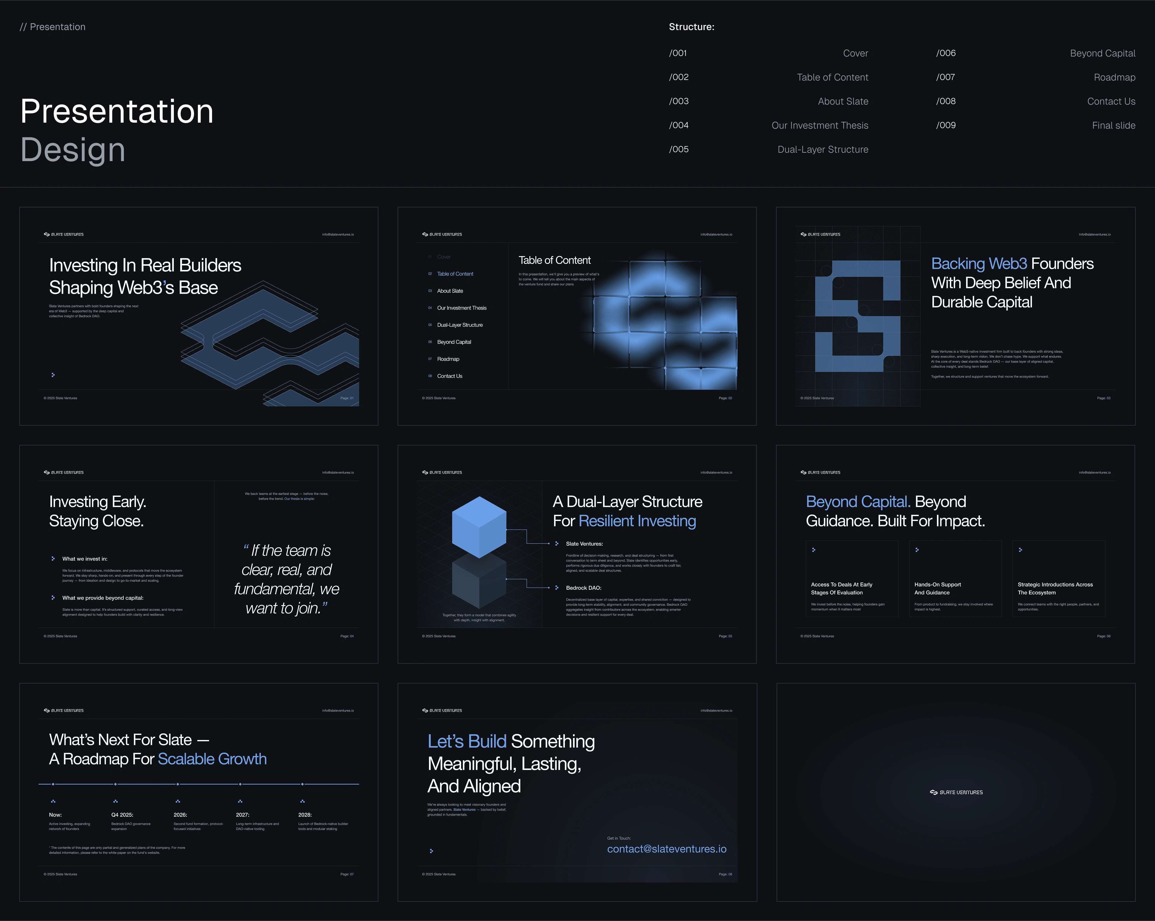 To achieve this, we designed a bespoke visual and interaction system from scratch. We defined a clean, forward-looking design language, carefully structured the homepage narrative, and refined user flows to ensure the experience felt intuitive, credible, and deliberate. Particular attention was paid to clarity, hierarchy, and pacing—helping users quickly grasp who Slate Ventures is, how it operates with Bedrock DAO, and what it stands for.