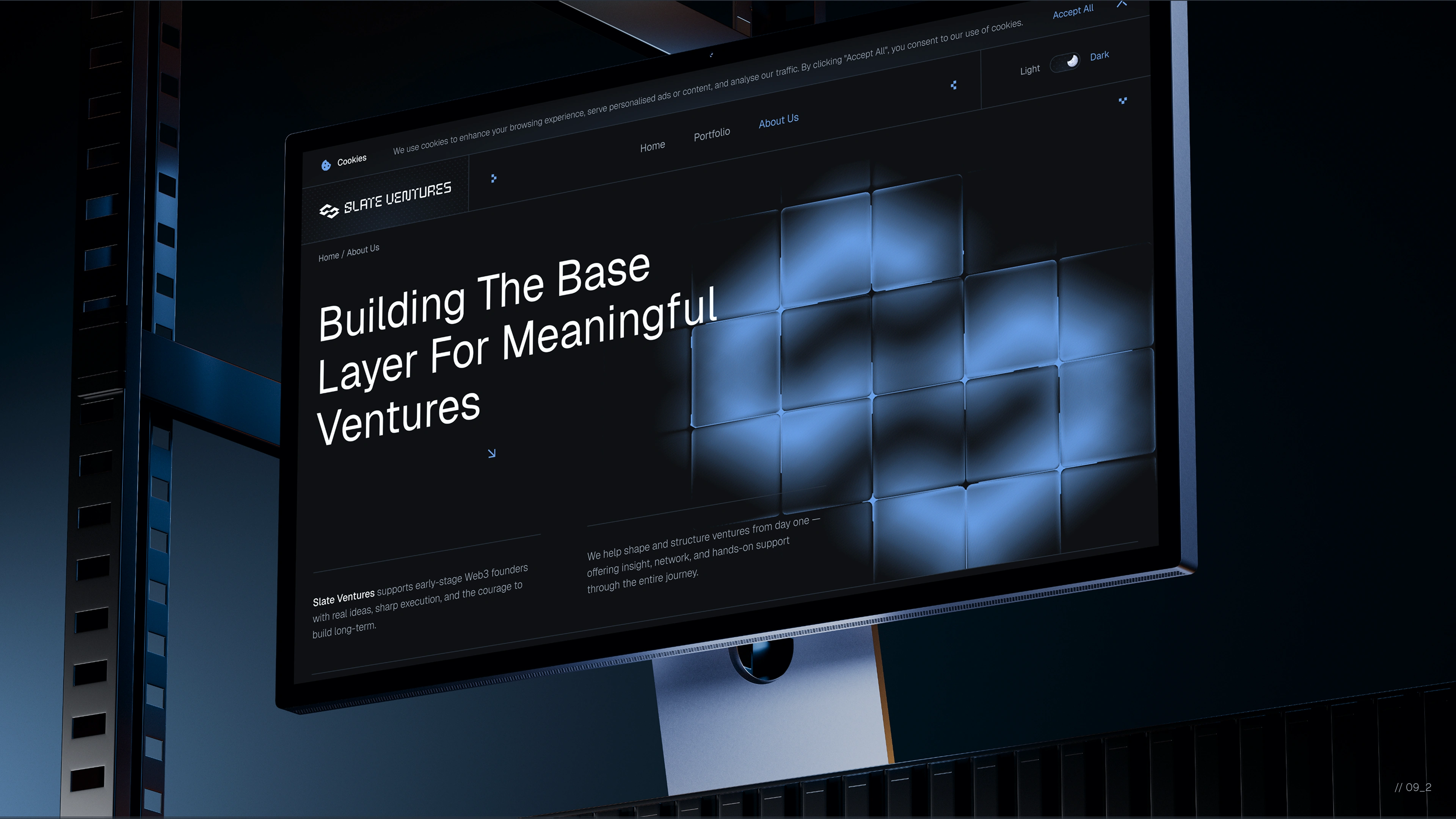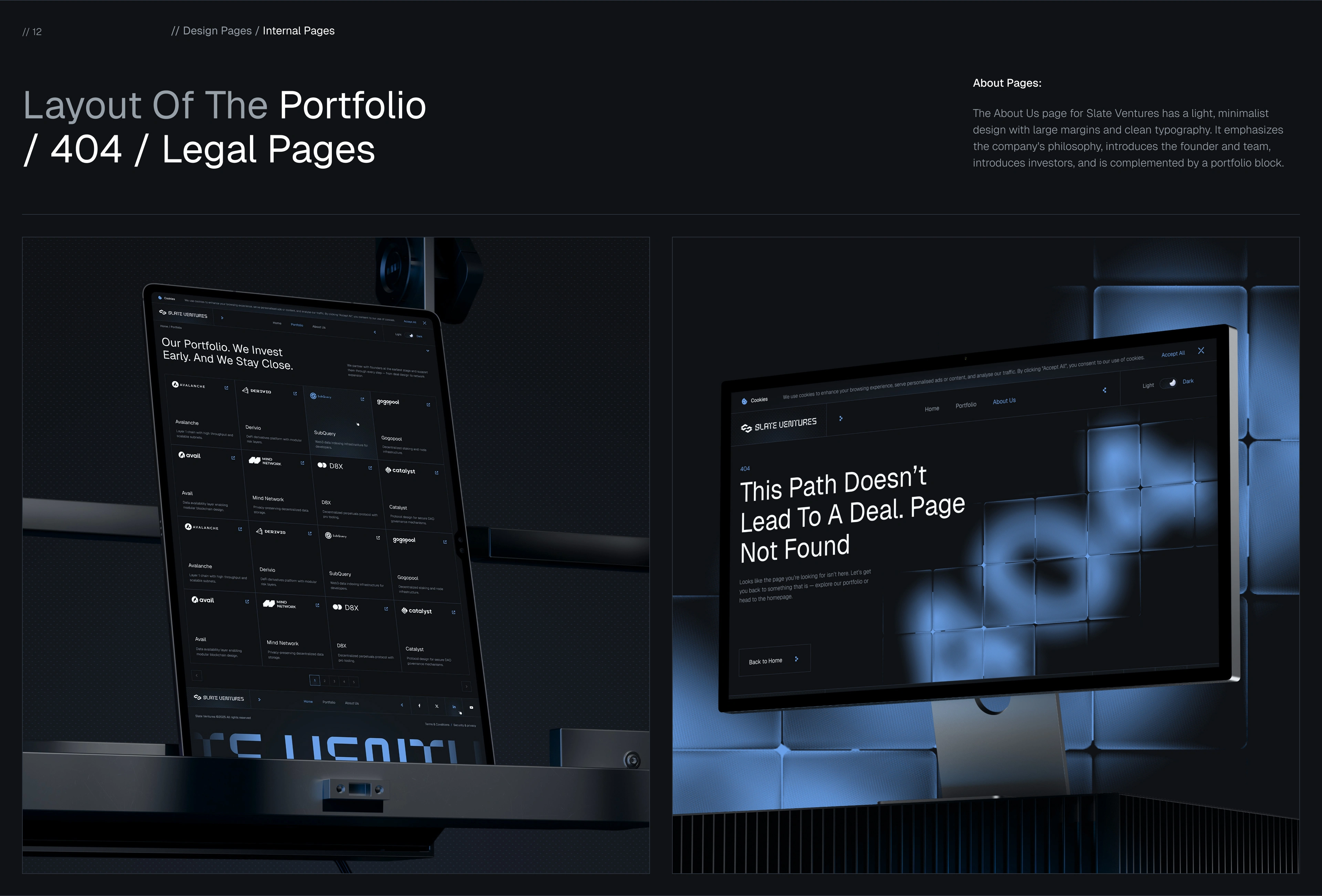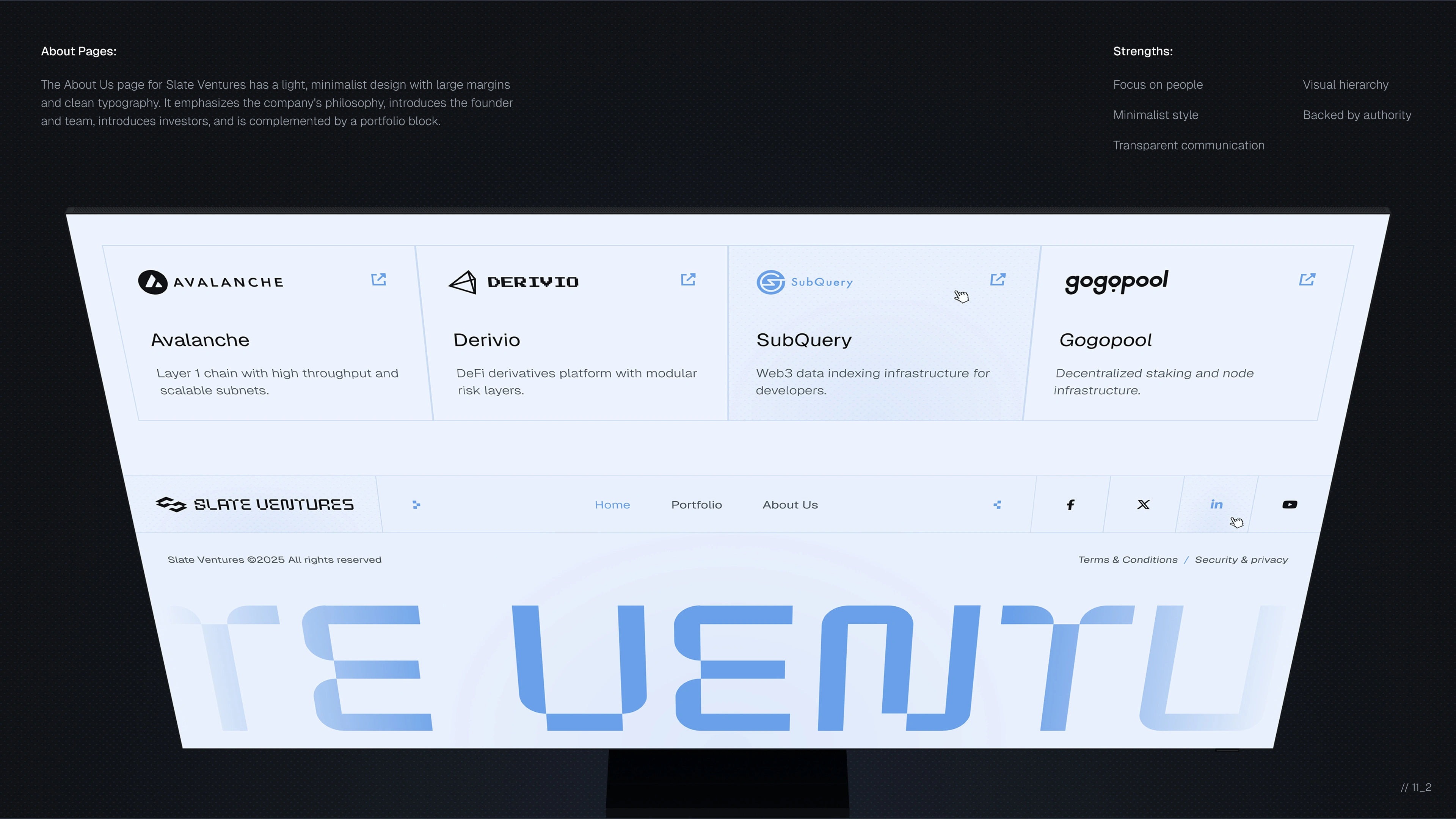 To achieve this, we designed a bespoke visual and interaction system from scratch. We defined a clean, forward-looking design language, carefully structured the homepage narrative, and refined user flows to ensure the experience felt intuitive, credible, and deliberate. Particular attention was paid to clarity, hierarchy, and pacing—helping users quickly grasp who Slate Ventures is, how it operates with Bedrock DAO, and what it stands for.
