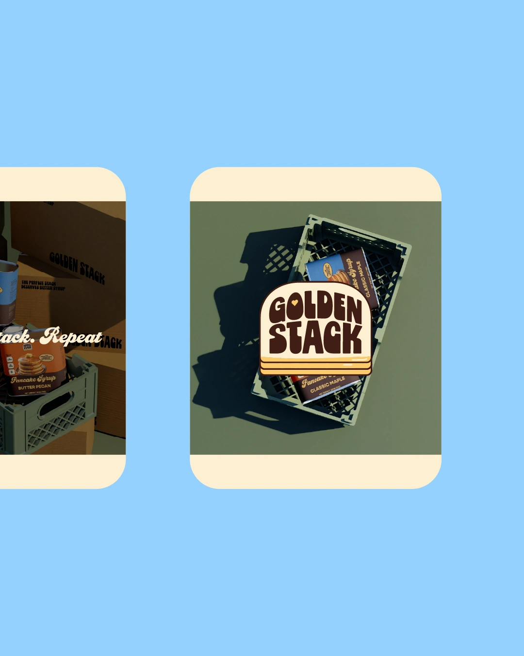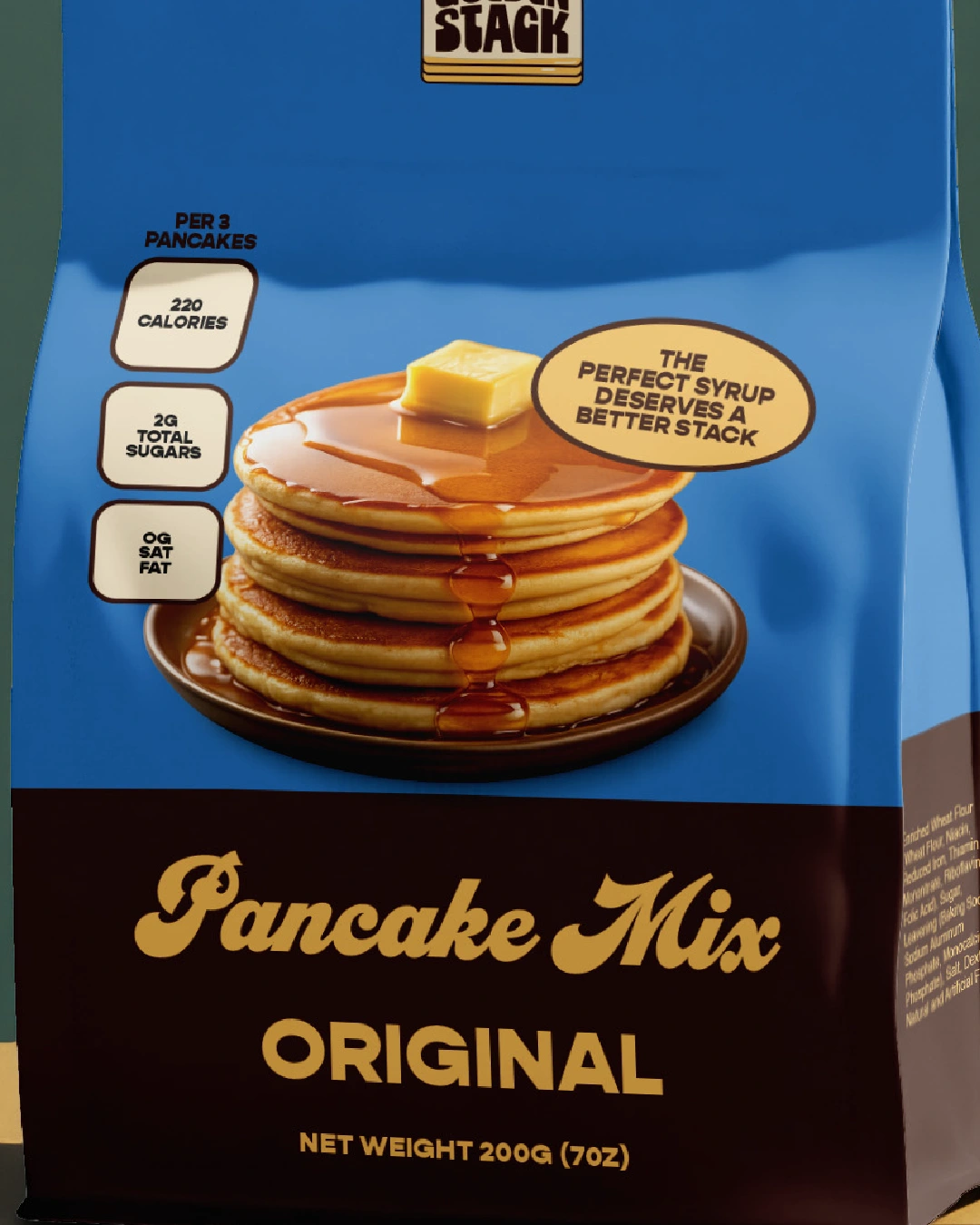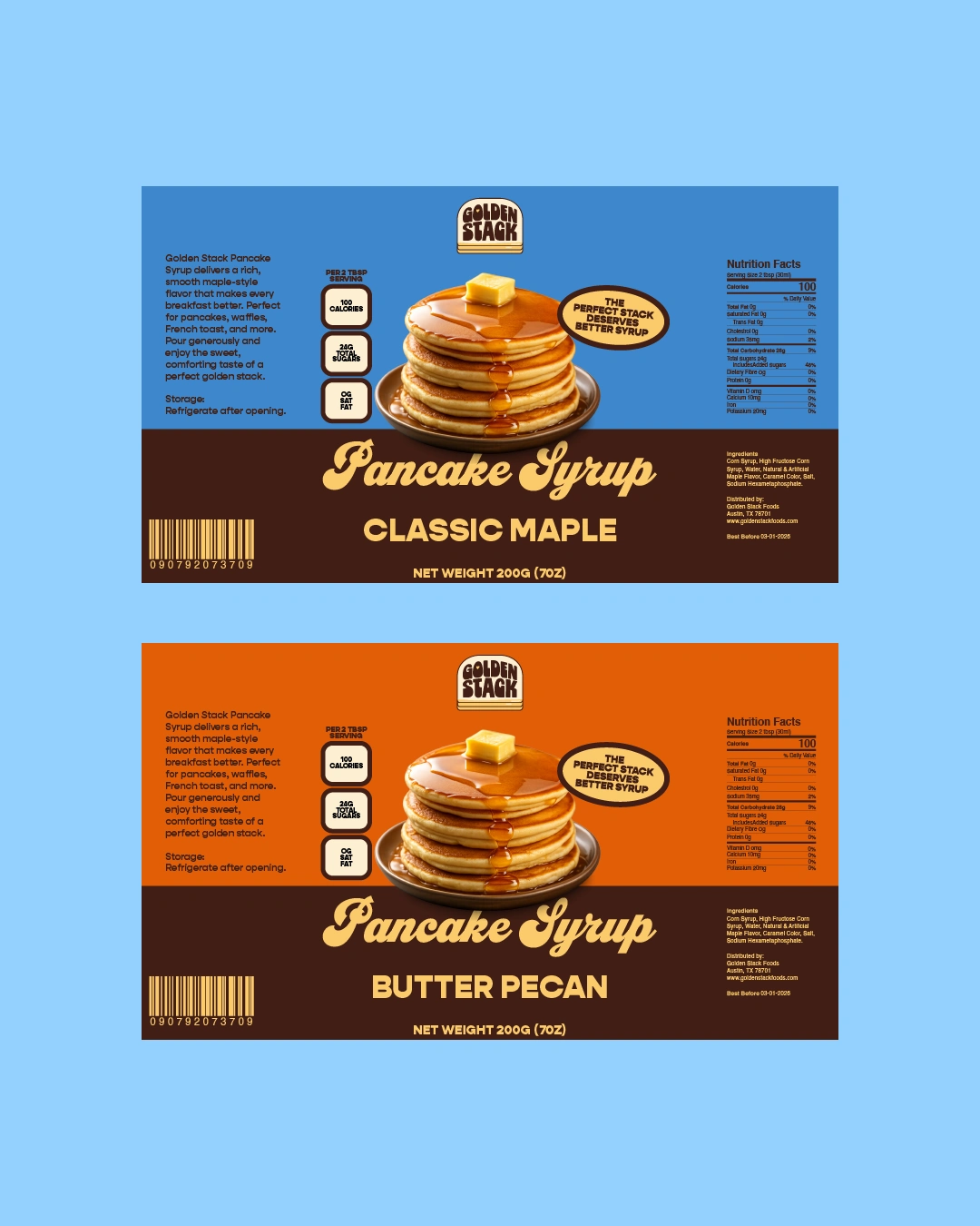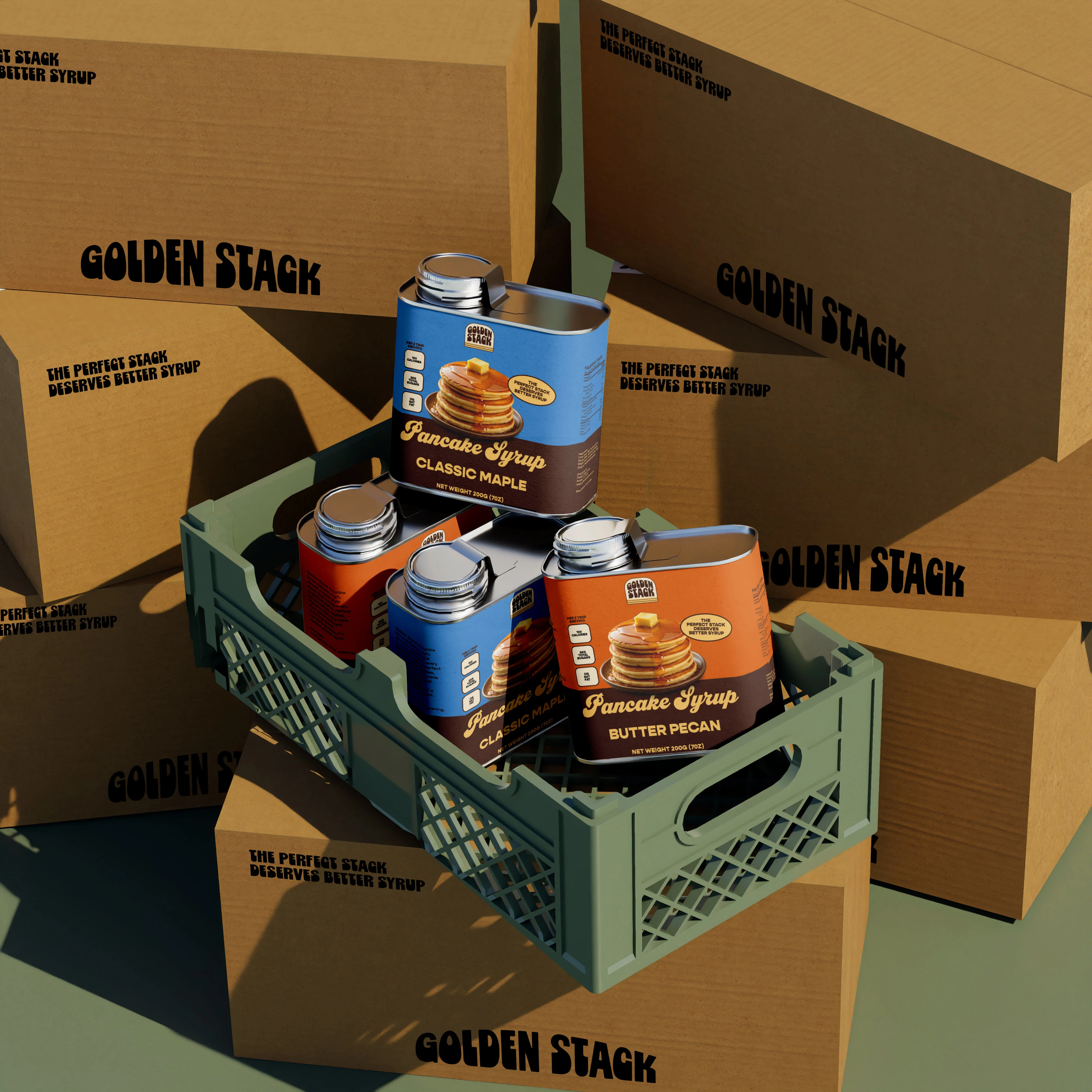 The packaging is designed to feel warm, nostalgic, and instantly recognizable on the shelf. A rich color palette, bold typography, and the signature pancake stack illustration create a strong visual identity that highlights the comfort of breakfast while keeping the design playful and appetizing.