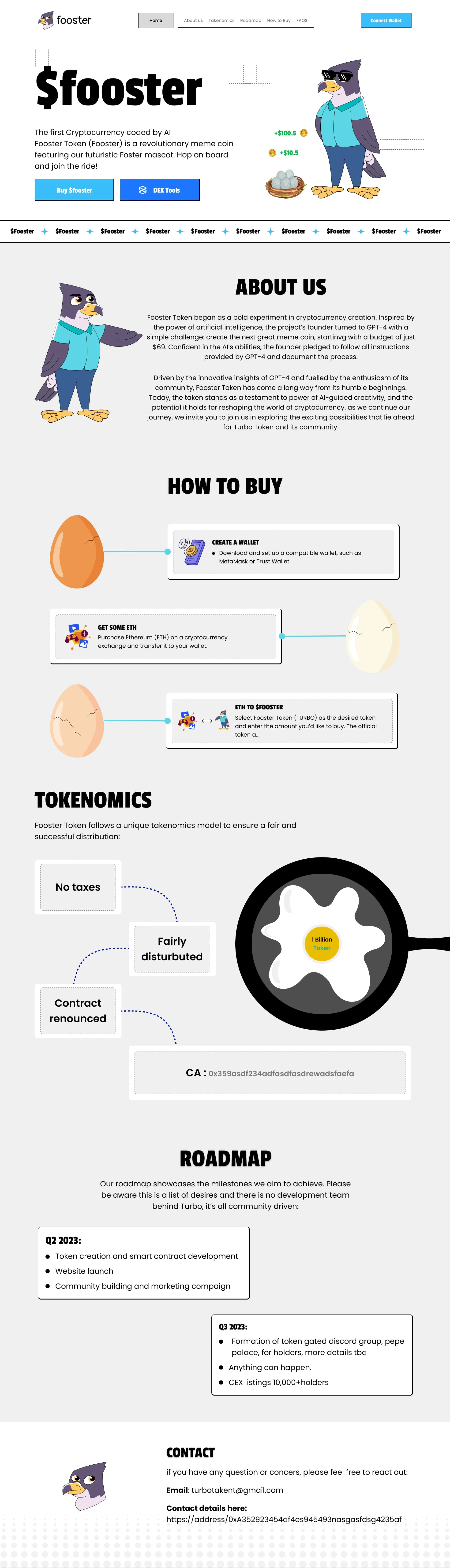 Fooster Meme Coin's website is a fun, interactive platform designed to celebrate meme culture with a playful duck theme. Featuring a quirky duck mascot and a vi