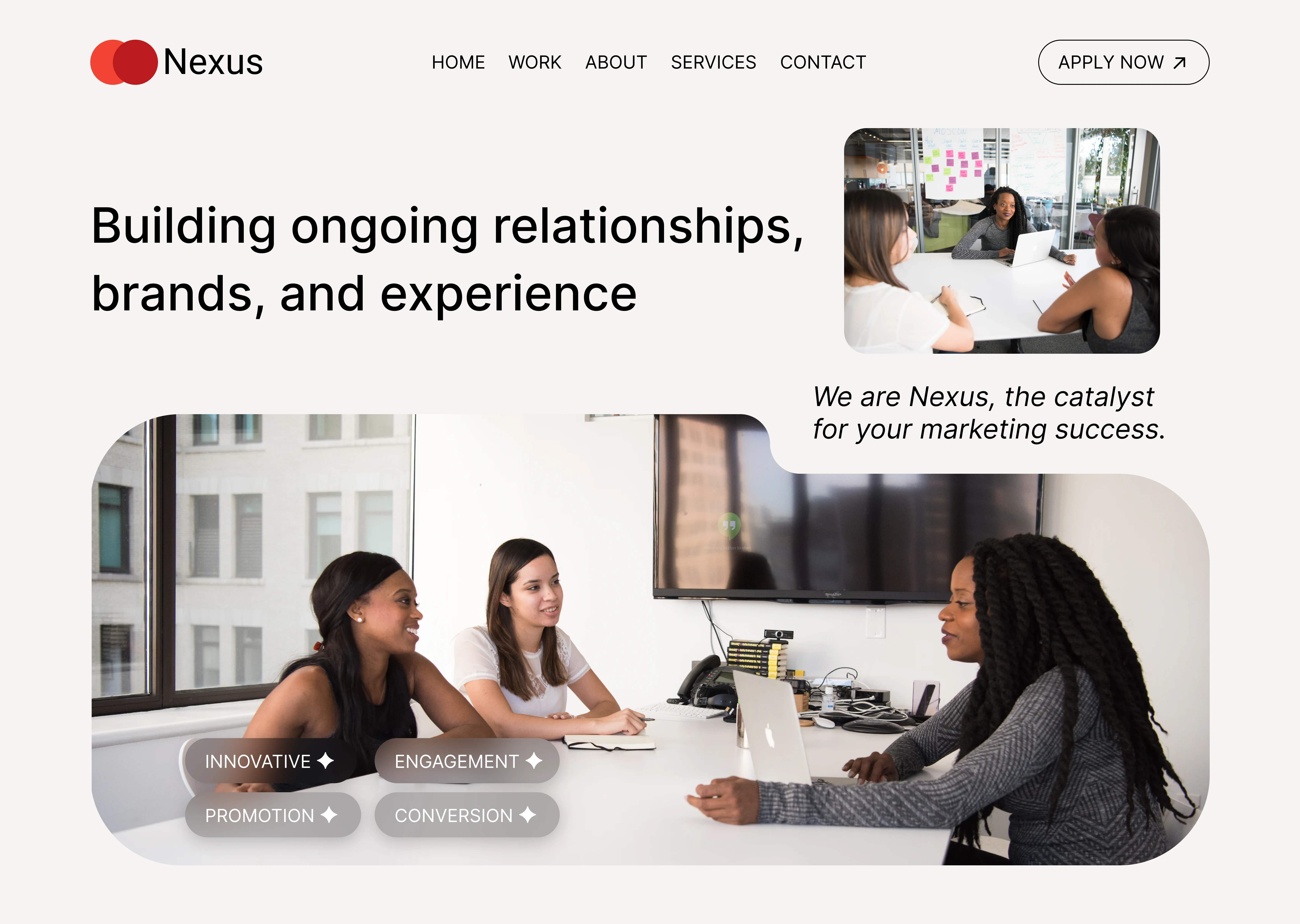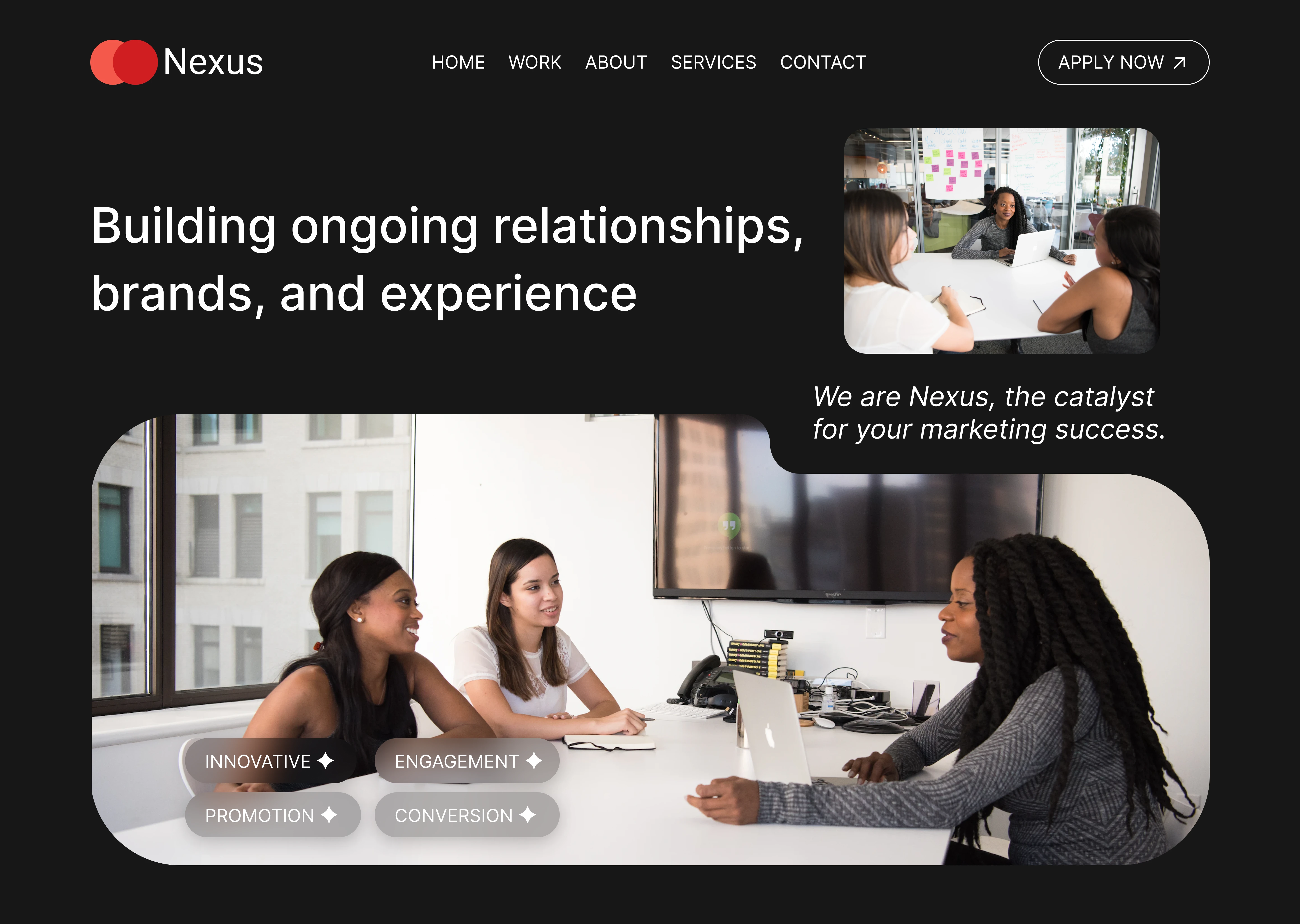 The website hero section for Nexus Marketing Agency effectively represents the brand, delivering a visually impactful and user-friendly experience. It communicates Nexus's unique value proposition, showcases their range of services, and integrates social elements for enhanced online engagement, contributing to a positive brand image and potential client conversions.