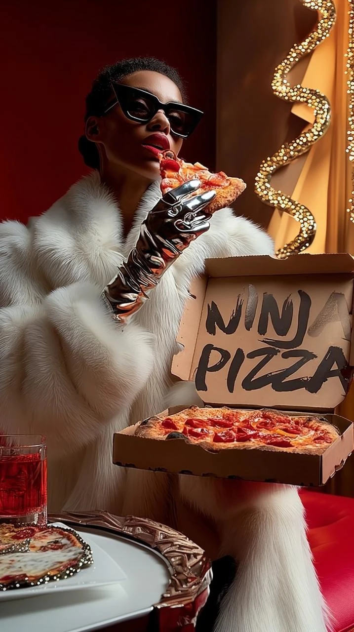 The visual features a confident, stylish character in a luxury setting, emphasizing attitude, personality, and brand boldness. The pizza box with handwritten branding reinforces authenticity and street-style energy, while the overall scene elevates the product to a premium, iconic level.