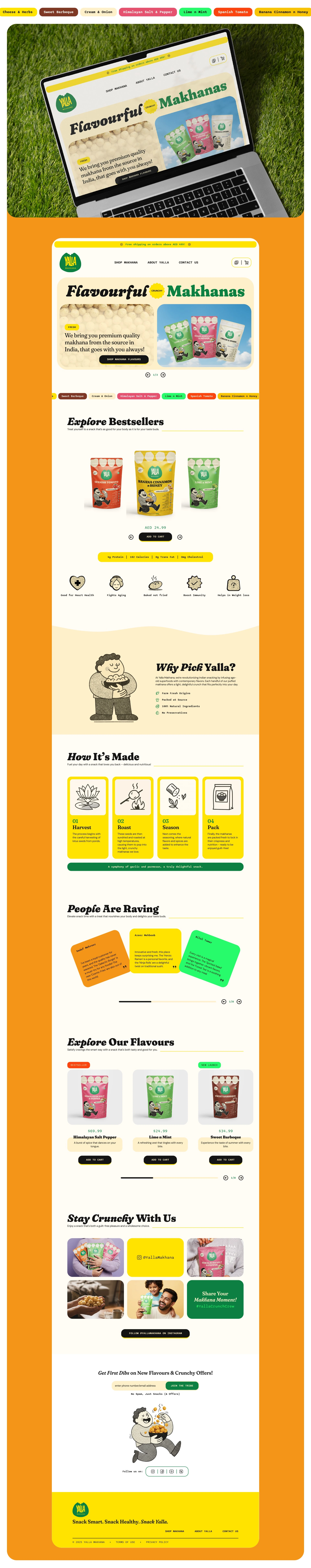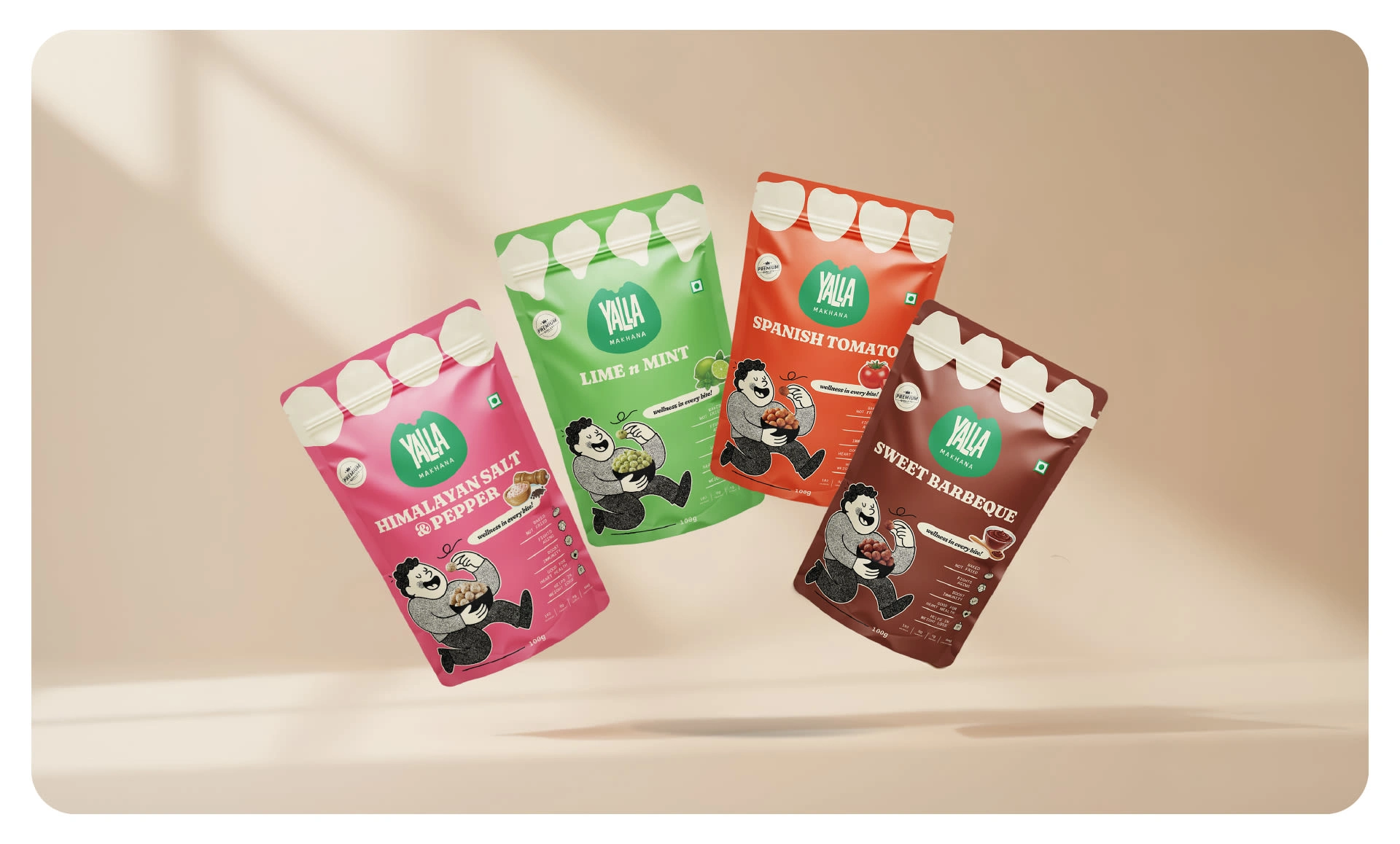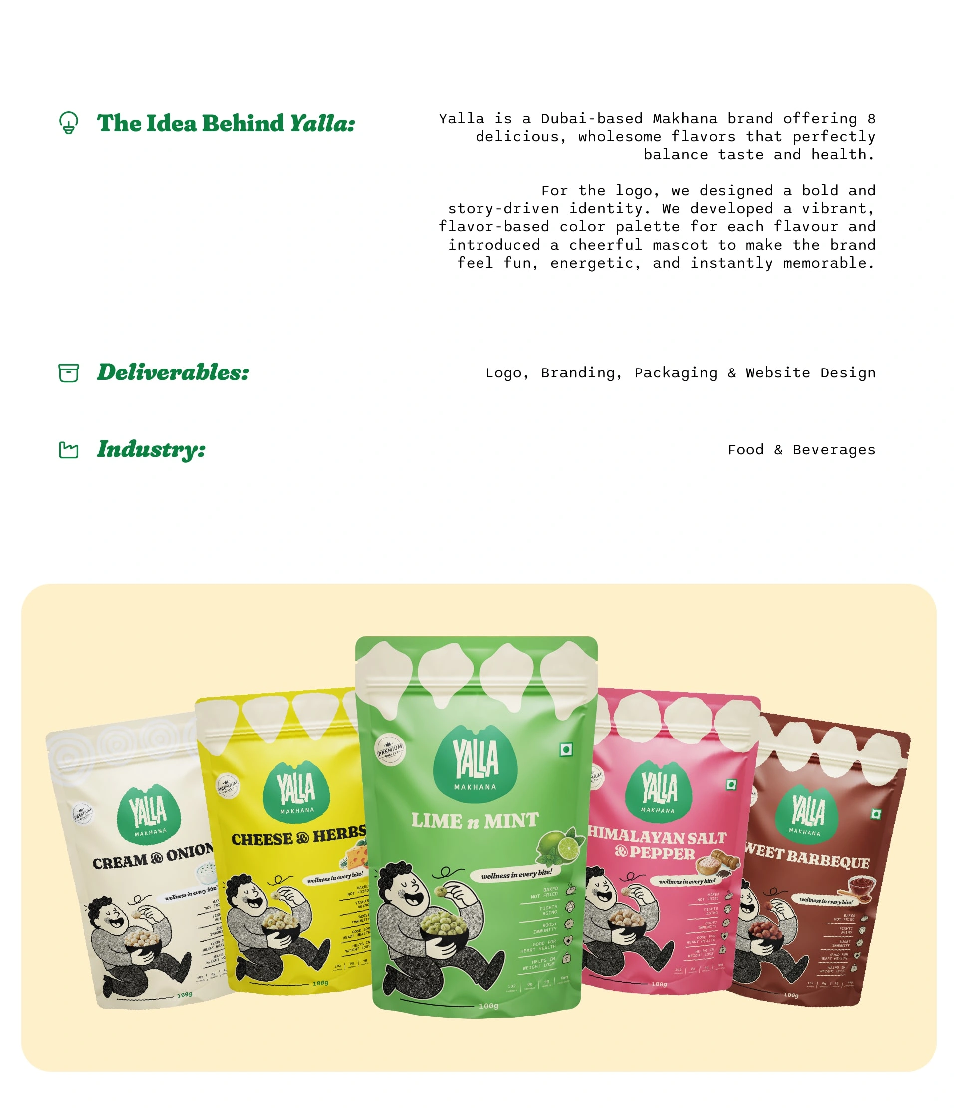 From logo and branding to packaging and UI, we crafted a bold, energetic identity for Yalla: a Dubai-based Makhana brand built to stand out.