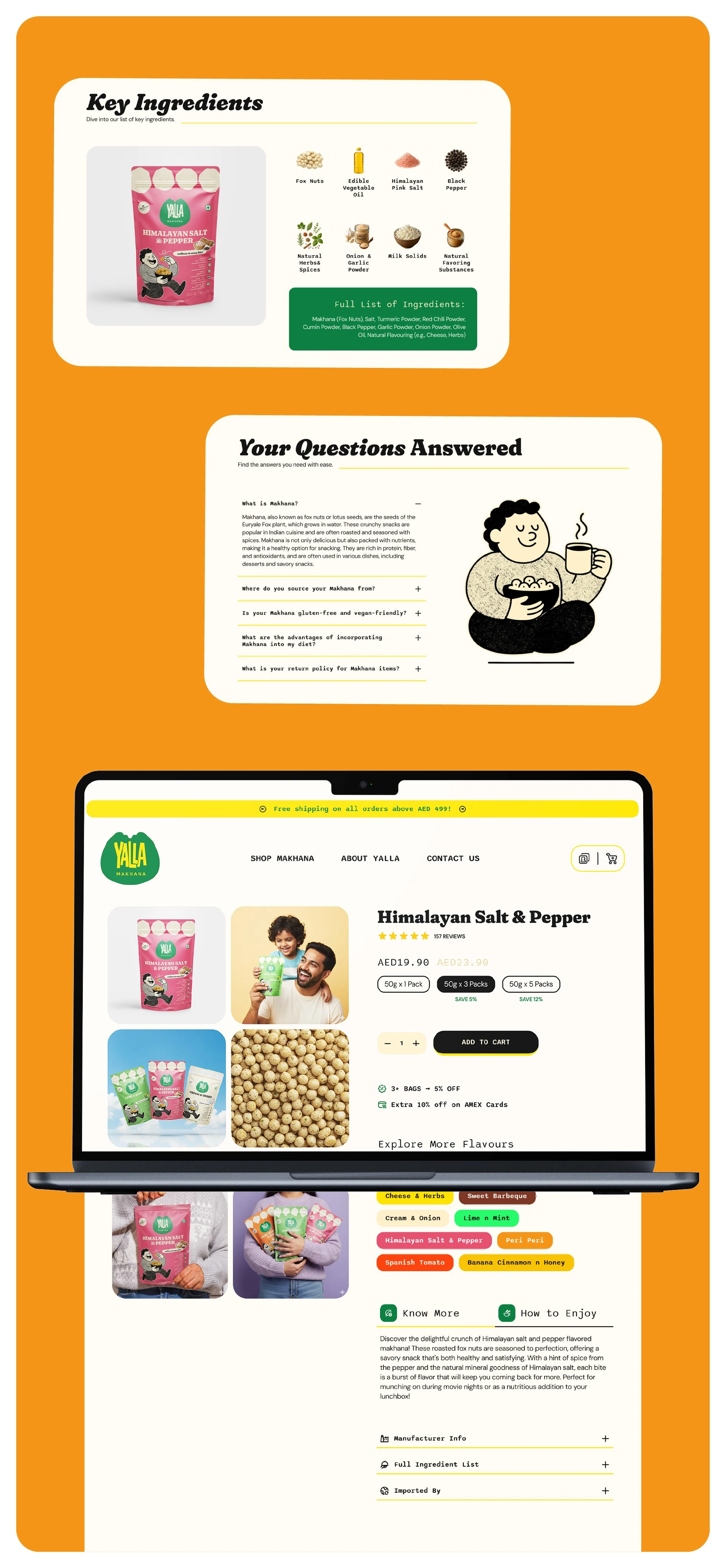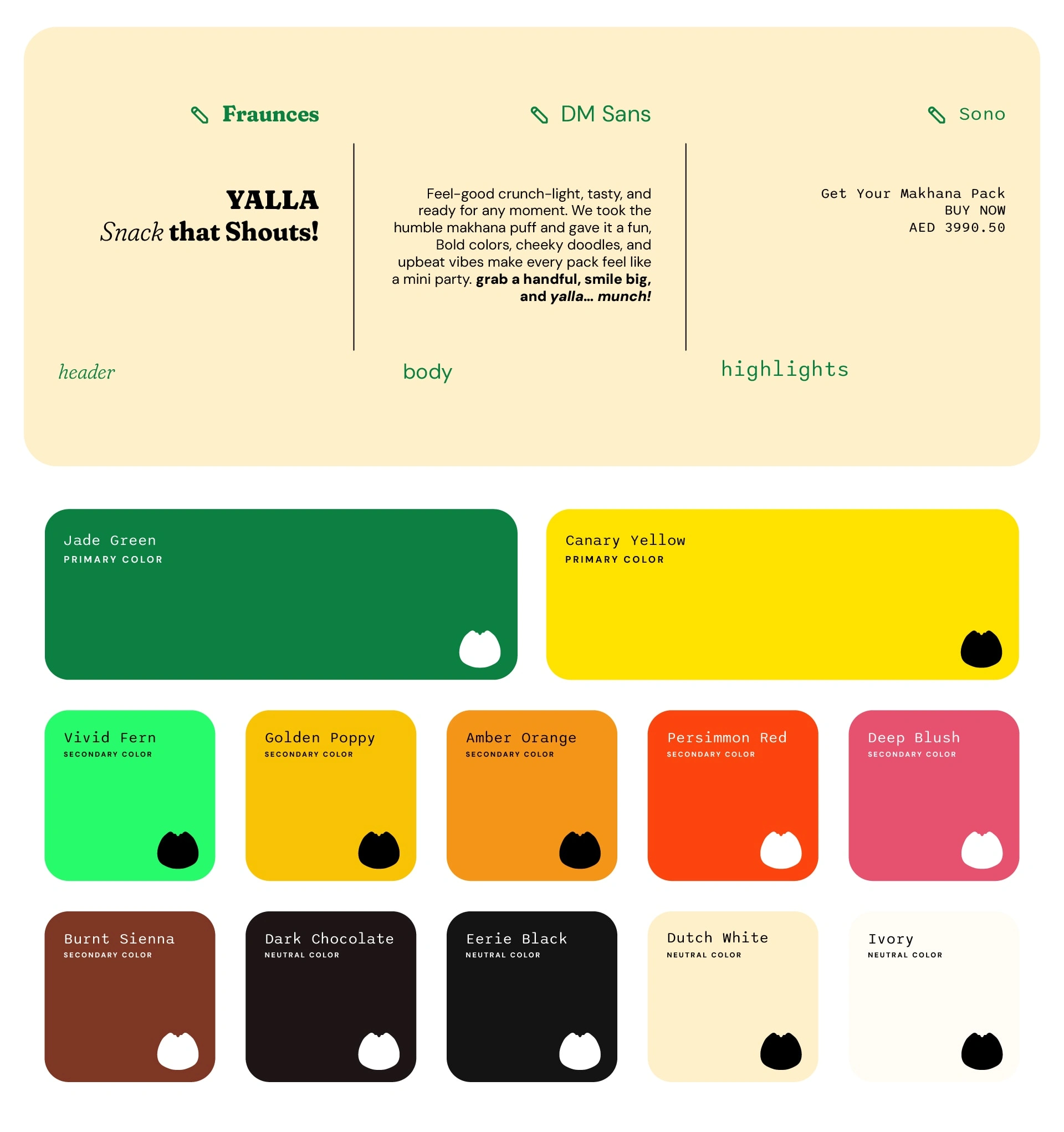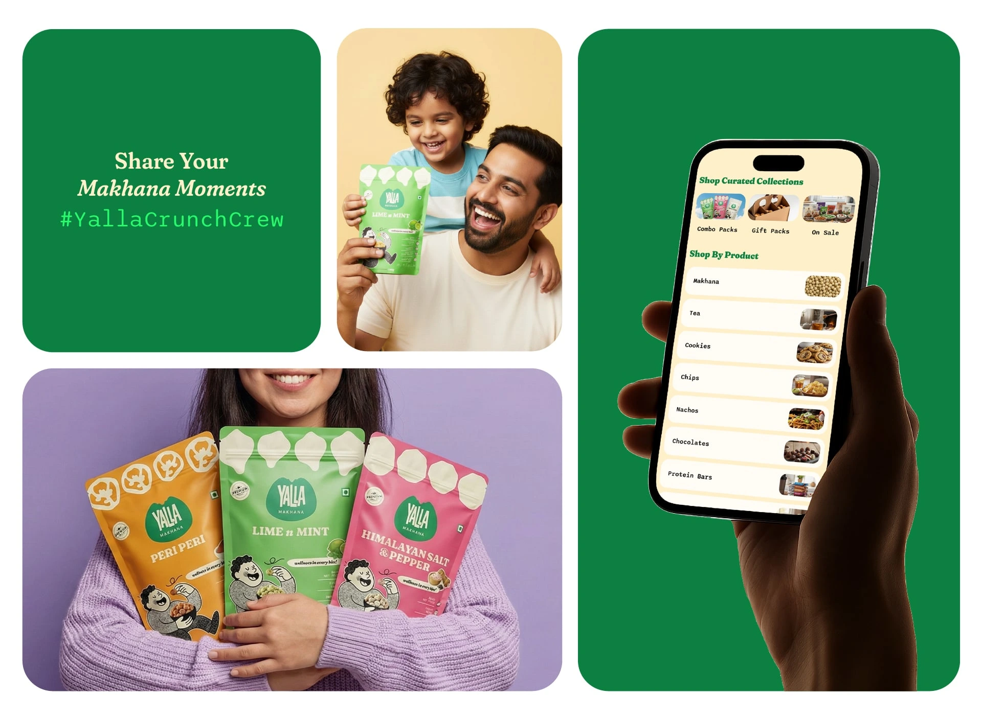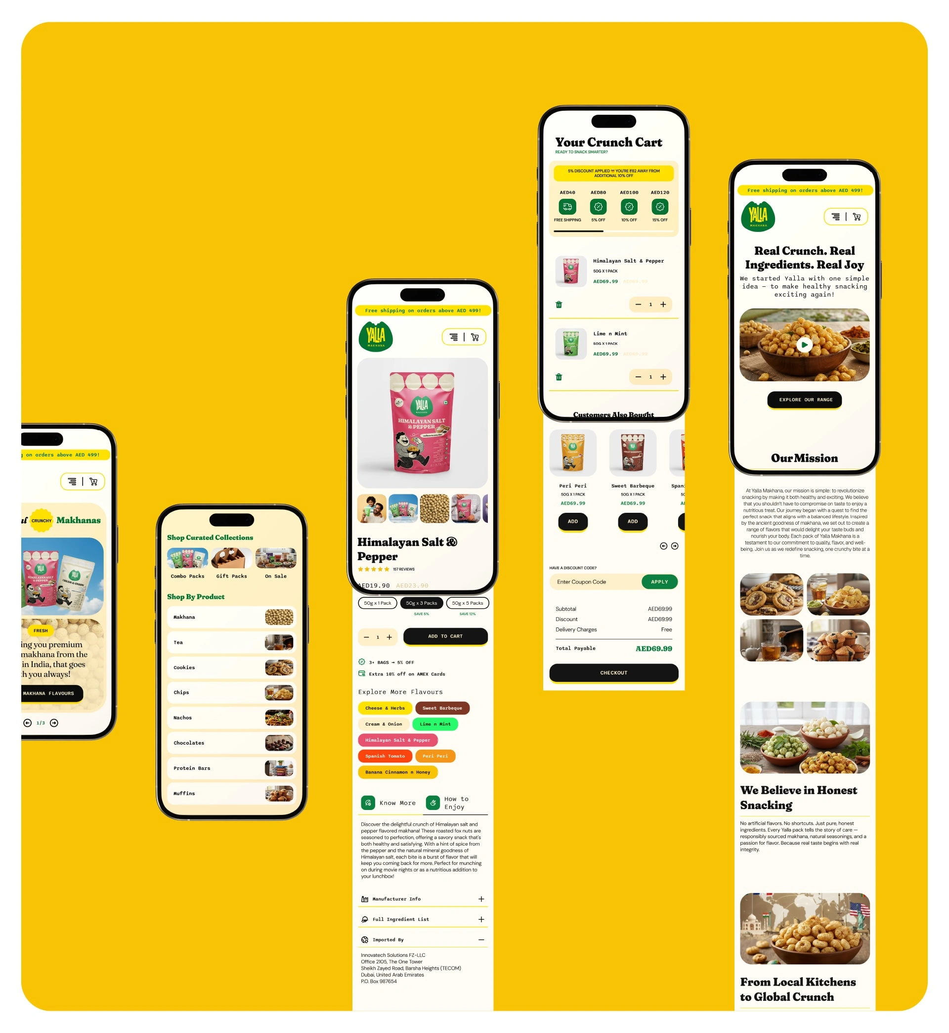 From logo and branding to packaging and UI, we crafted a bold, energetic identity for Yalla: a Dubai-based Makhana brand built to stand out.
