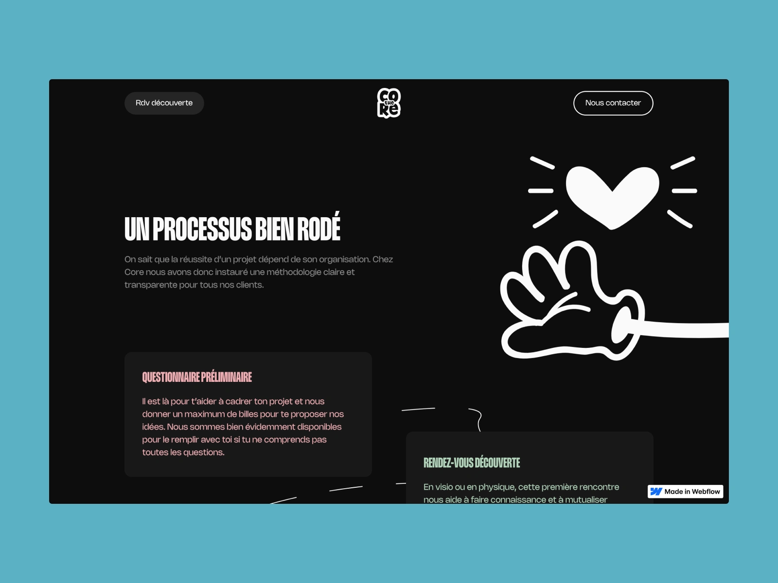 Built on Webflow, this page targets both businesses and individuals looking for a more polished and professional website. One of the project’s highlights is the integration of original micro-interactions — most notably our cartoon-style heart mascot, whose little hands subtly appear through animations across the page.