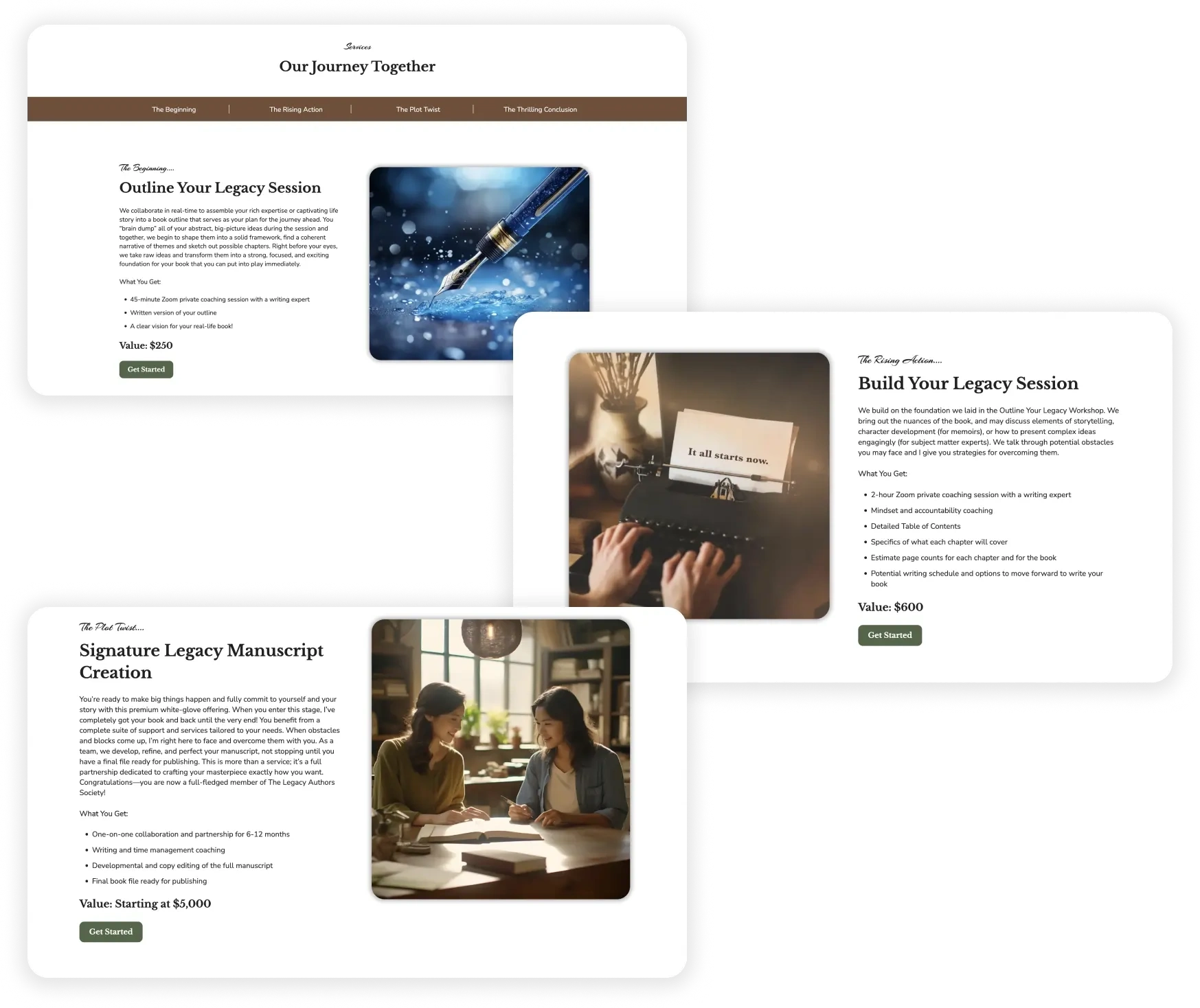 By promoting Sarah's productized services through an easy-to-navigate platform, and aligning the branding with her vision, I was able to deliver a simple one page website that positions The Legacy Author Society as a trusted, professional writing service provider. The site effectively serves as a hub for clients seeking quality authorship and clear, reliable services.
