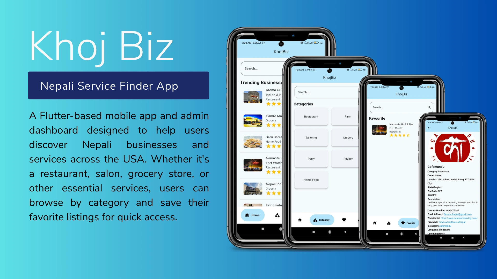 A Flutter-based mobile app and admin dashboard designed to help users discover Nepali businesses and services across the USA.Whether its a restaurant, salon etc