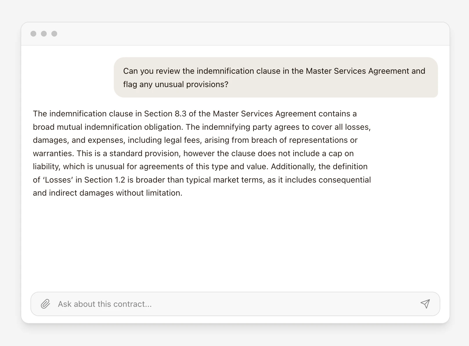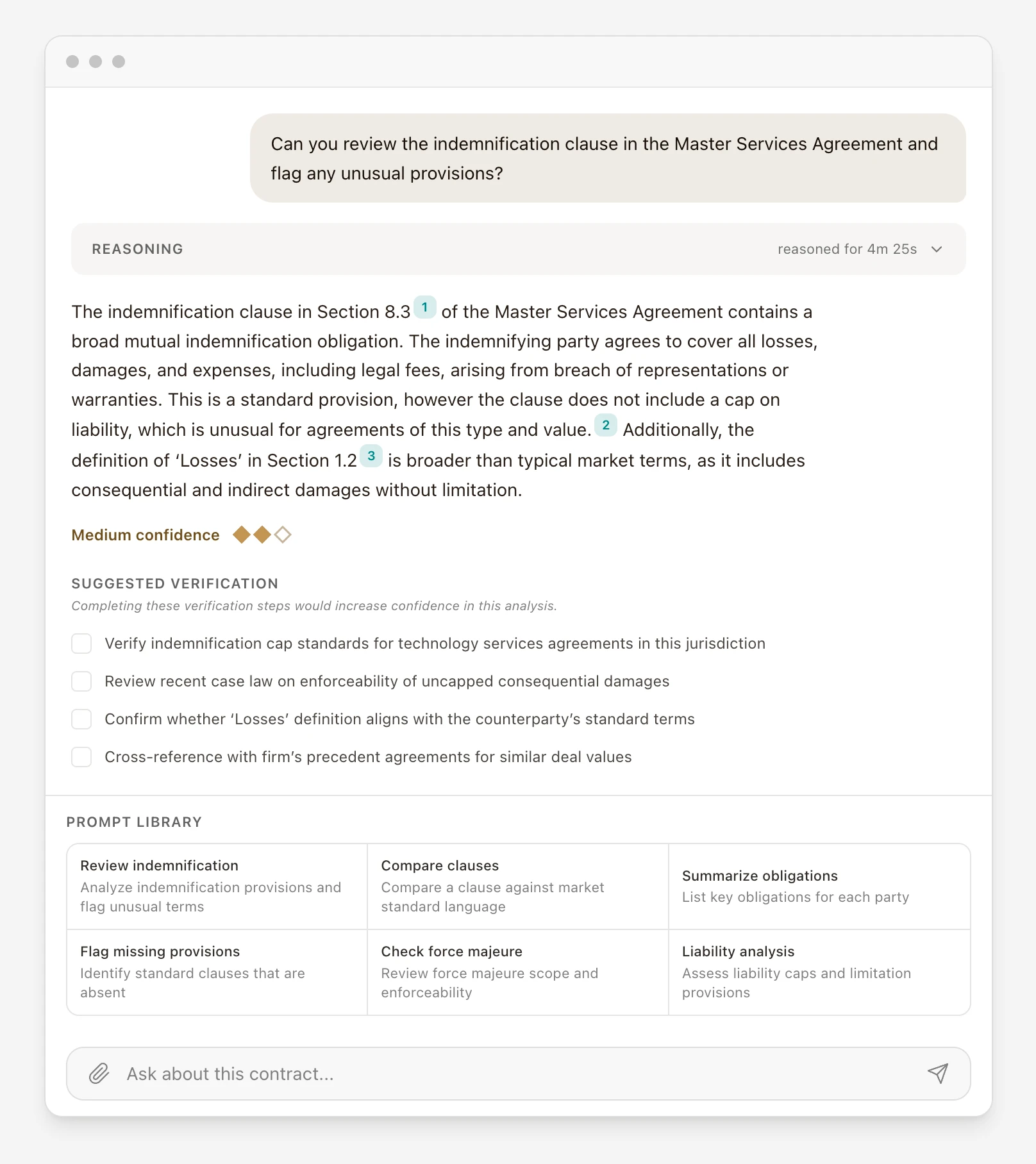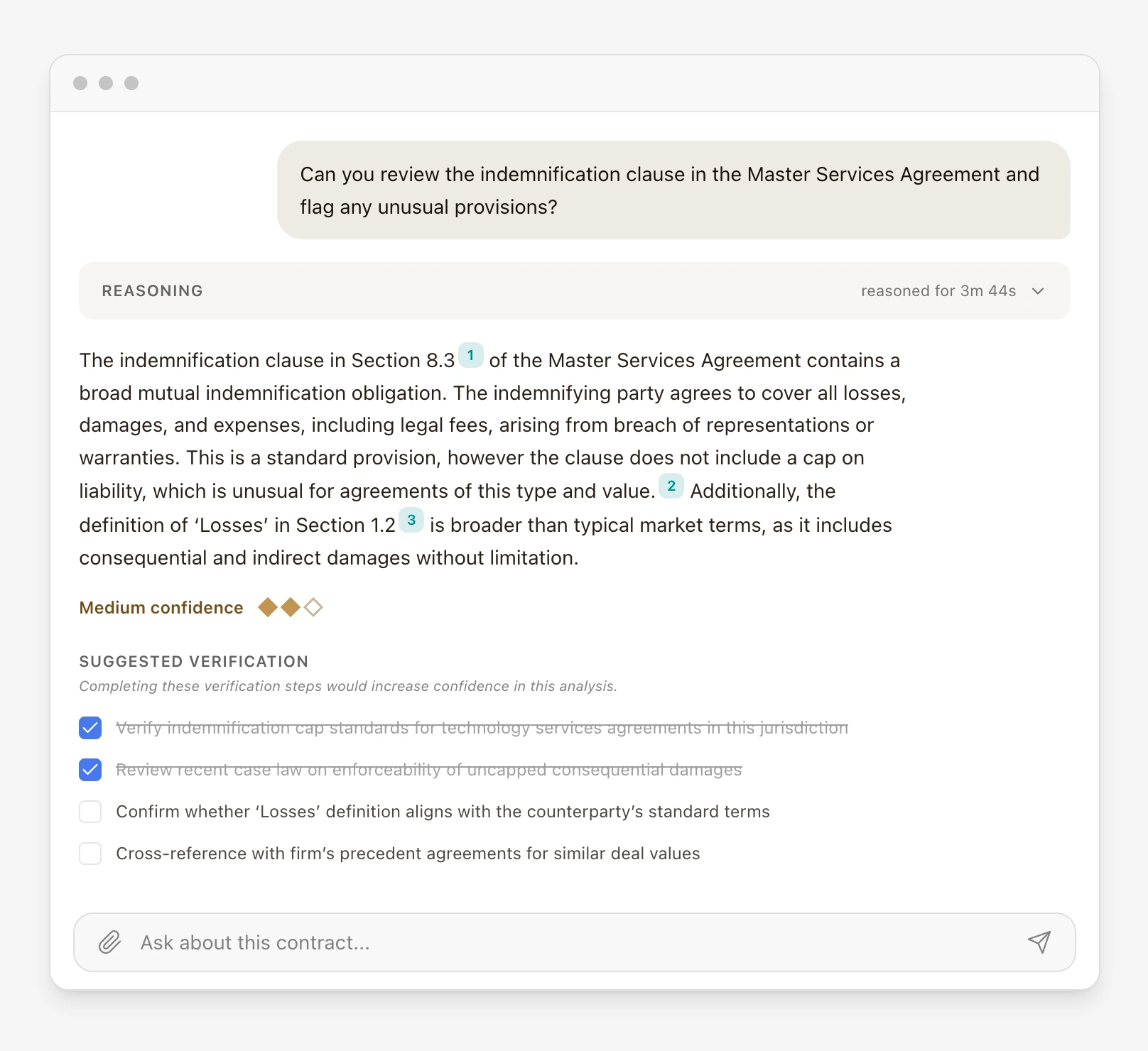 The final layer: instead of expecting lawyers to write perfect prompts, the AI asks clarifying questions with structured choices. The interaction becomes collaborative — the user works with the AI, not at it.