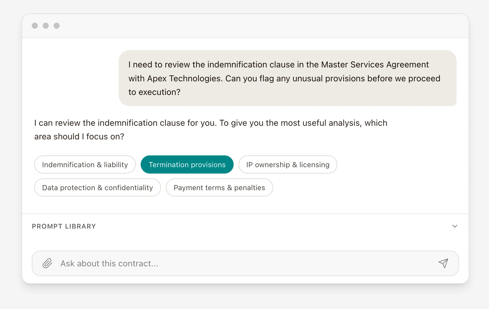 Up to this point, all the trust work was on the output side. Now I shifted to the input. Pre-defined prompts reduce the blank-page anxiety of a chat interface and signal that the tool understands legal workflows.