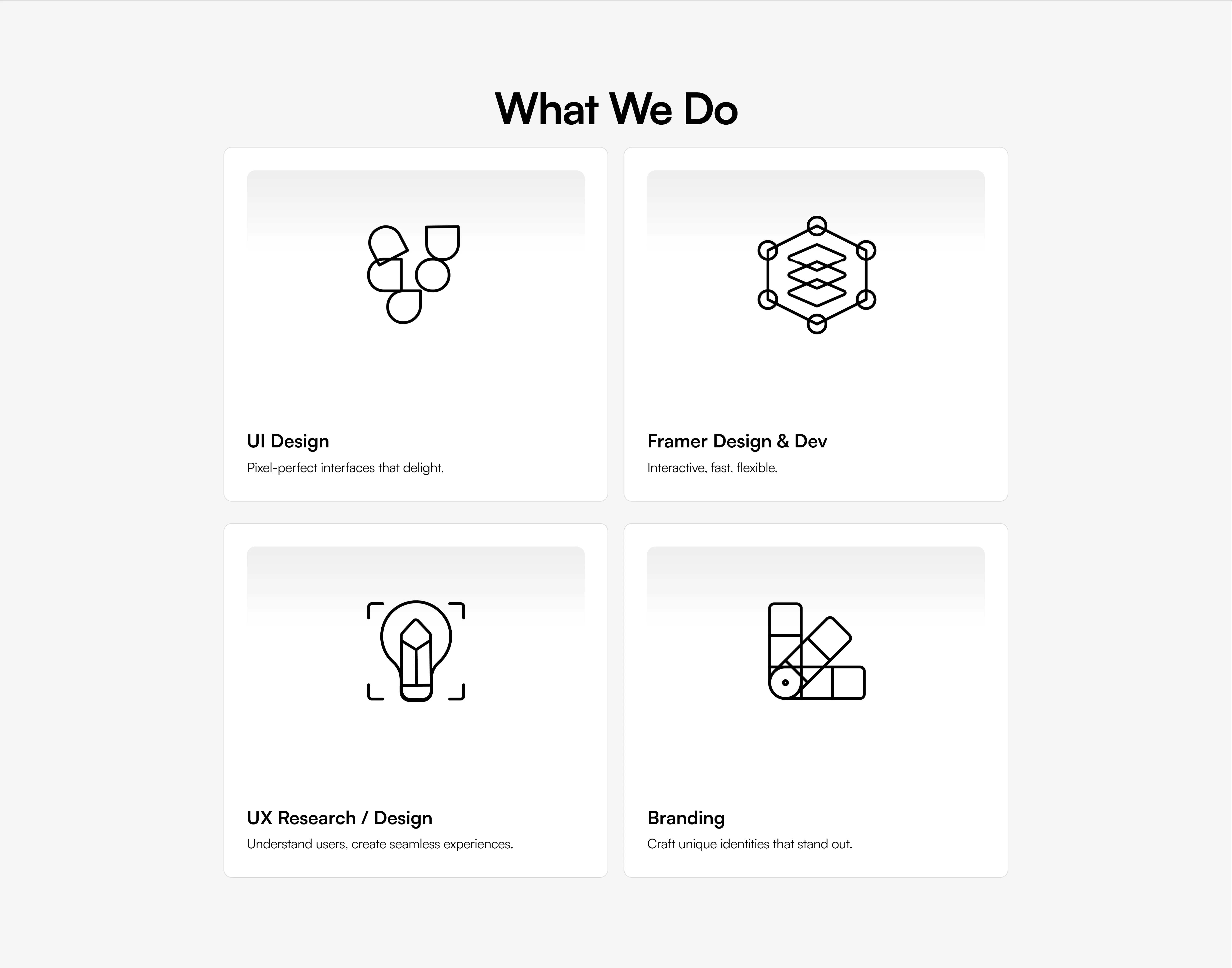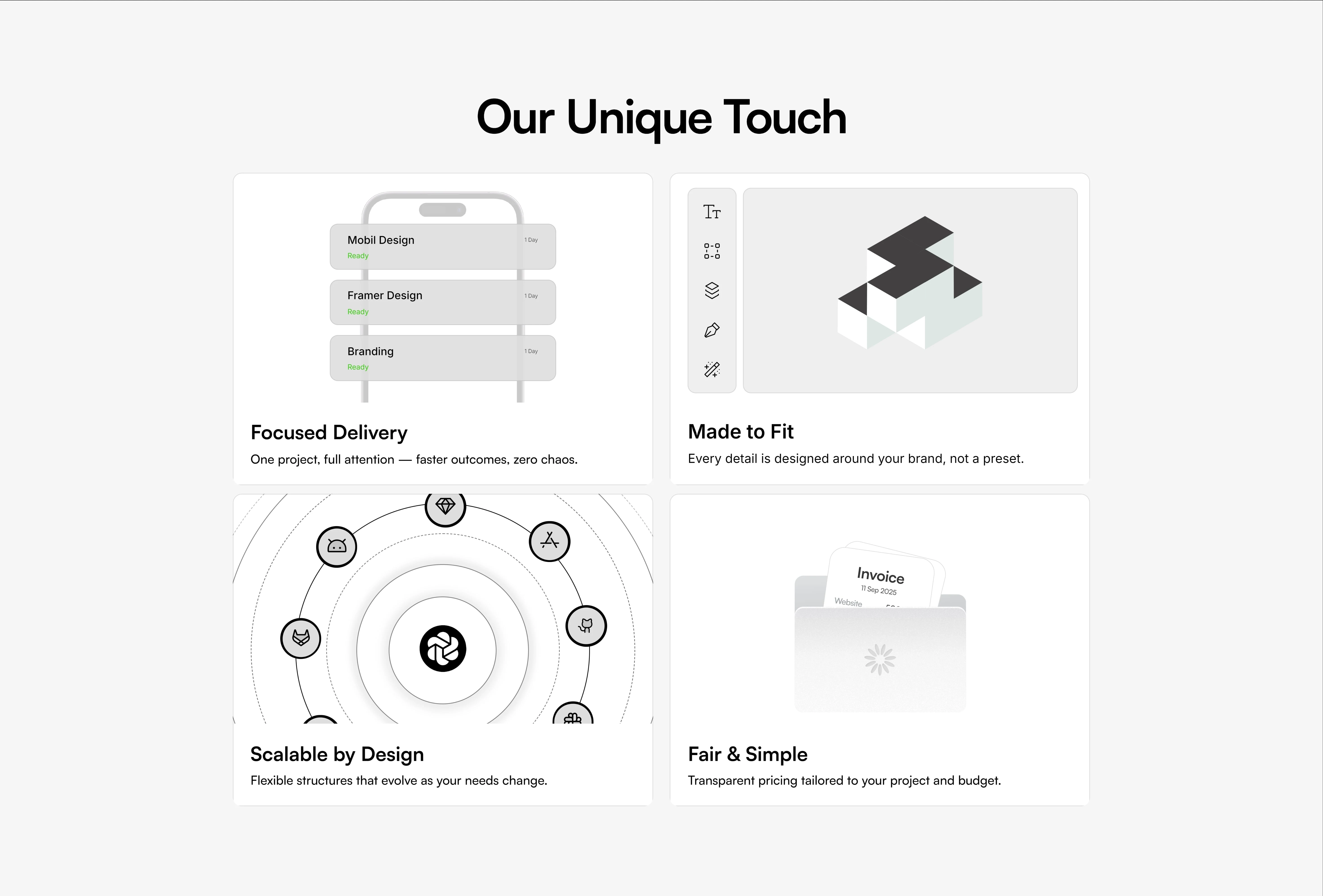 A modern and playful site showcasing services in branding, UX/UI, and Framer development with a focus on clarity, speed, and personality.