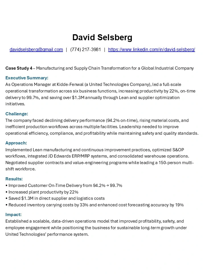 Led Lean transformation improving on-time delivery to 99.7%, boosting productivity 22%, and saving $1.3M through supply chain optimization.