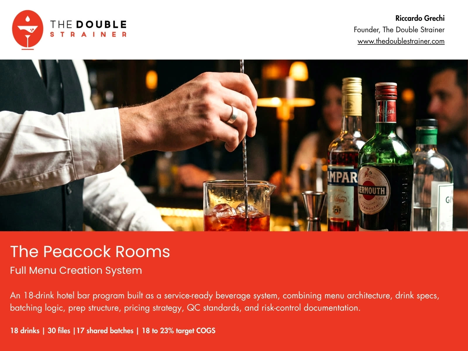 Built an 18-drink hotel bar menu system with cocktails, zero-proof serves, specs, batching, SOPs, costing and QC controls.