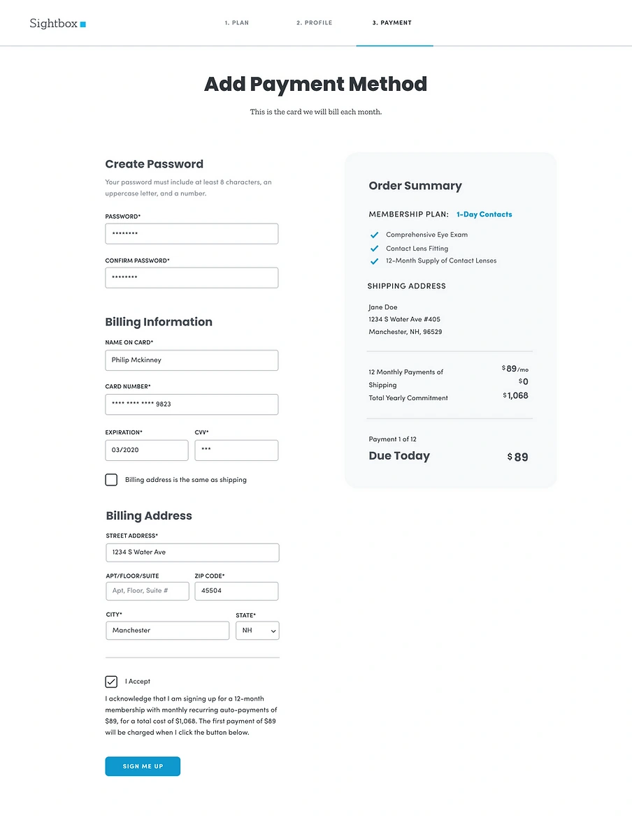To satisfy the requirement to ease confusion of the subscription agreement, we added an "I agree" checkbox with some definitive copy repeating the agreed terms of service.