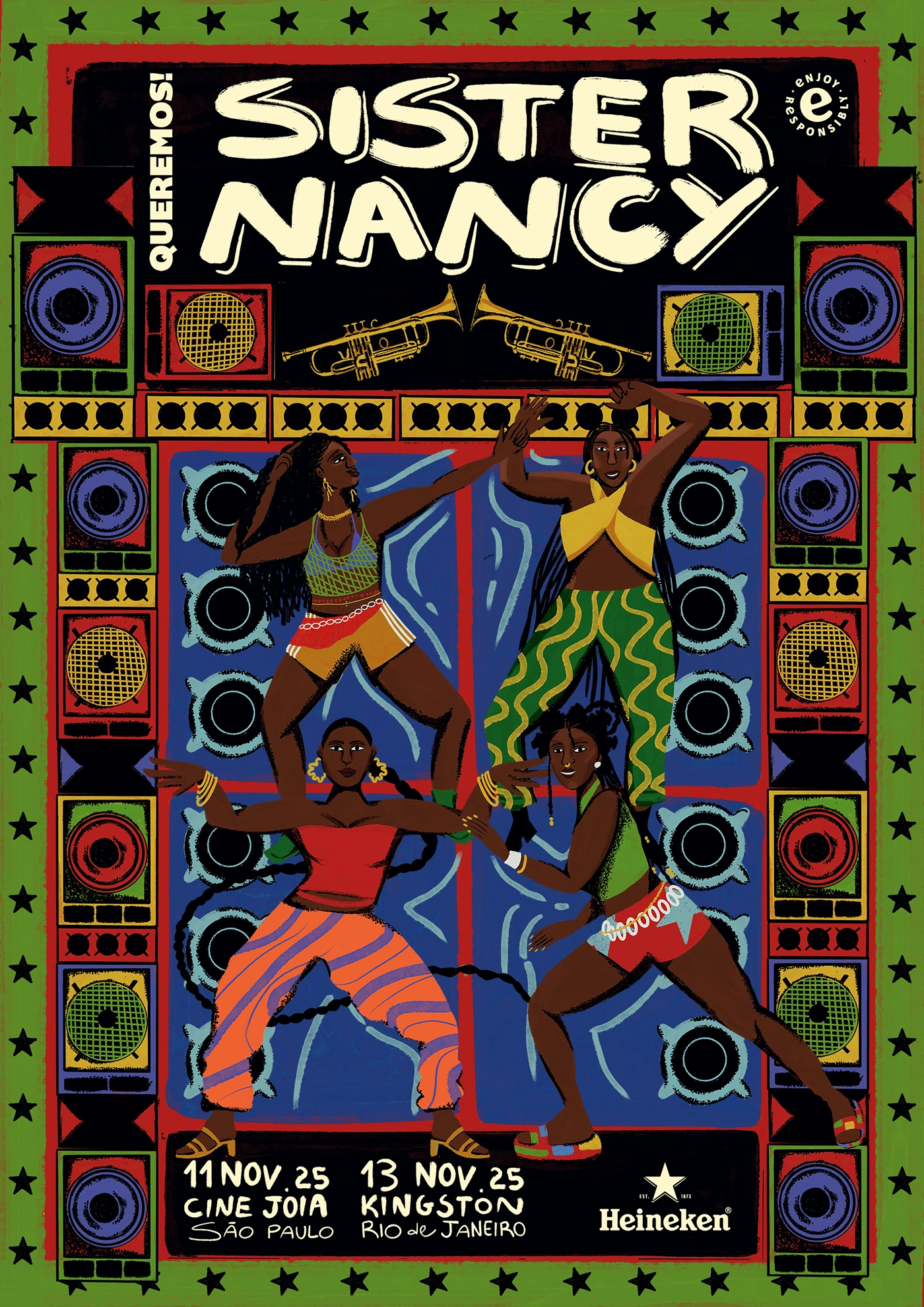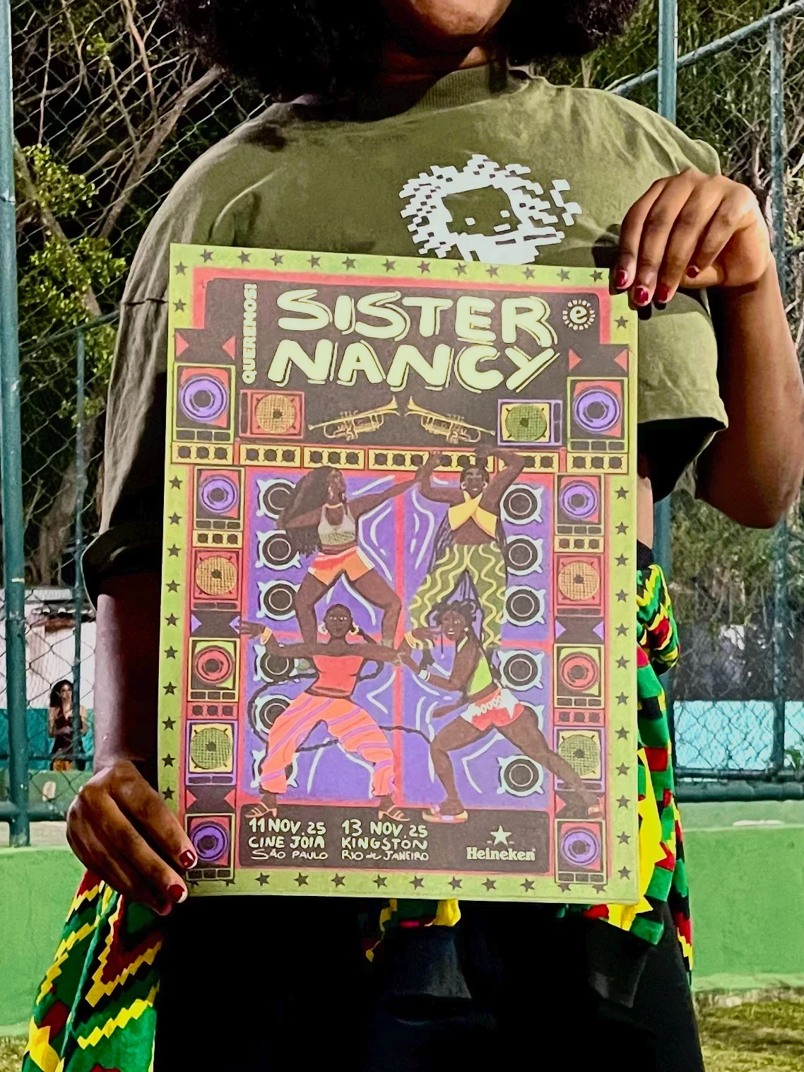 The image is inspired by dancehall dancing queens — women who occupy the center of the dance floor and sound systems, expressing identity, power, and autonomy through their bodies, movement, and style. These dancers are key figures within reggae and dancehall culture, affirming female protagonism in a space of sound, celebration, and resistance.