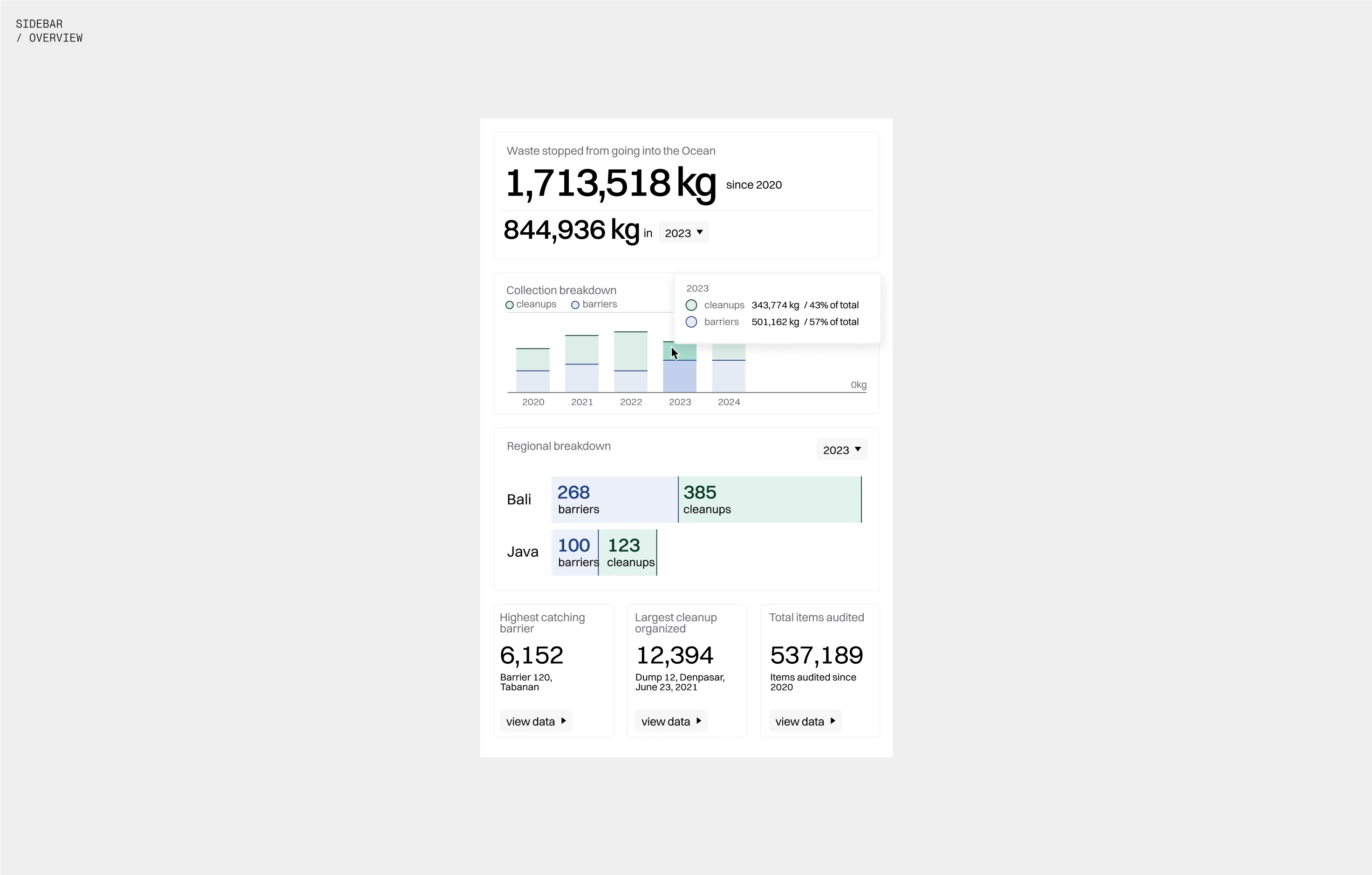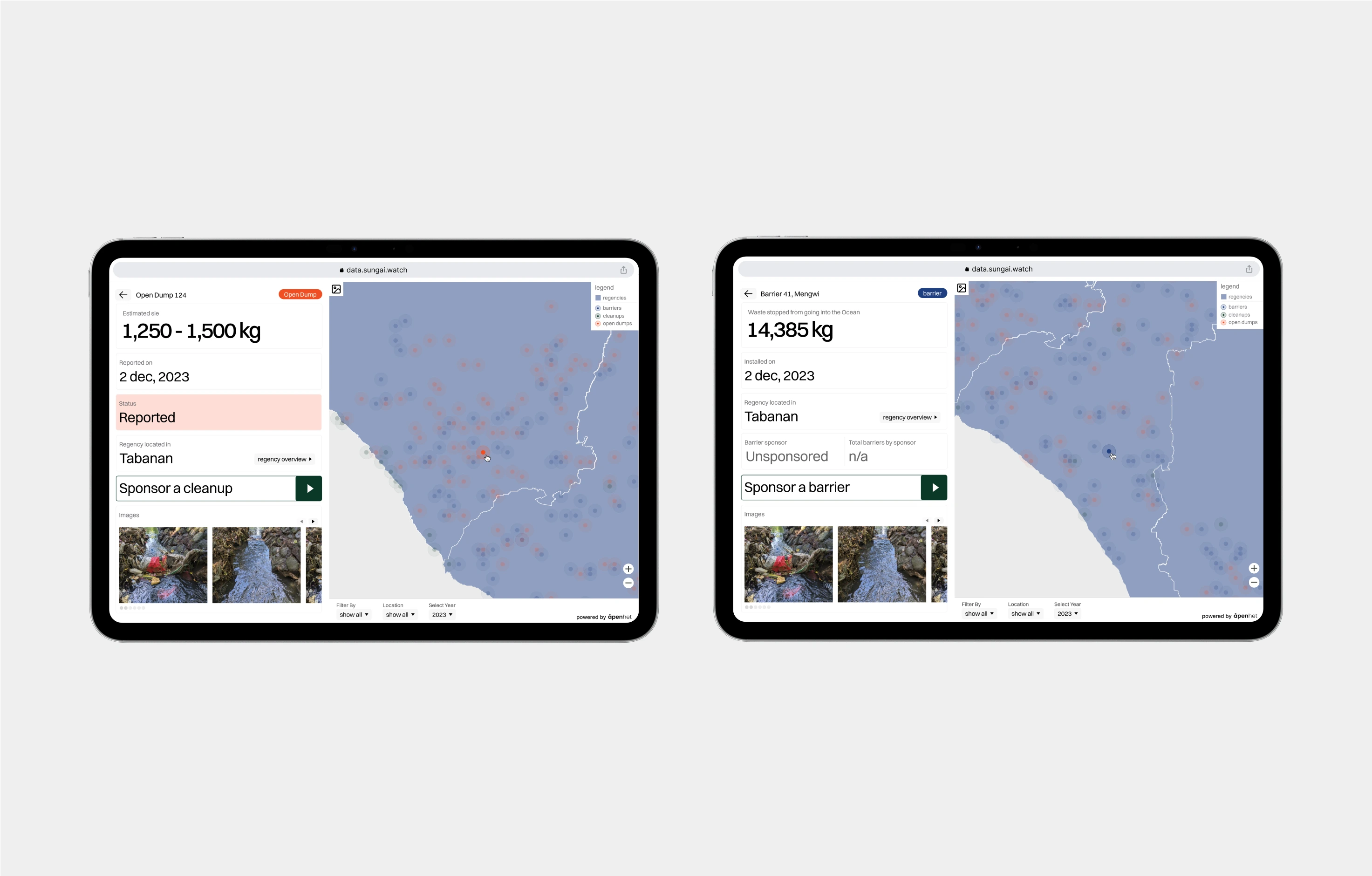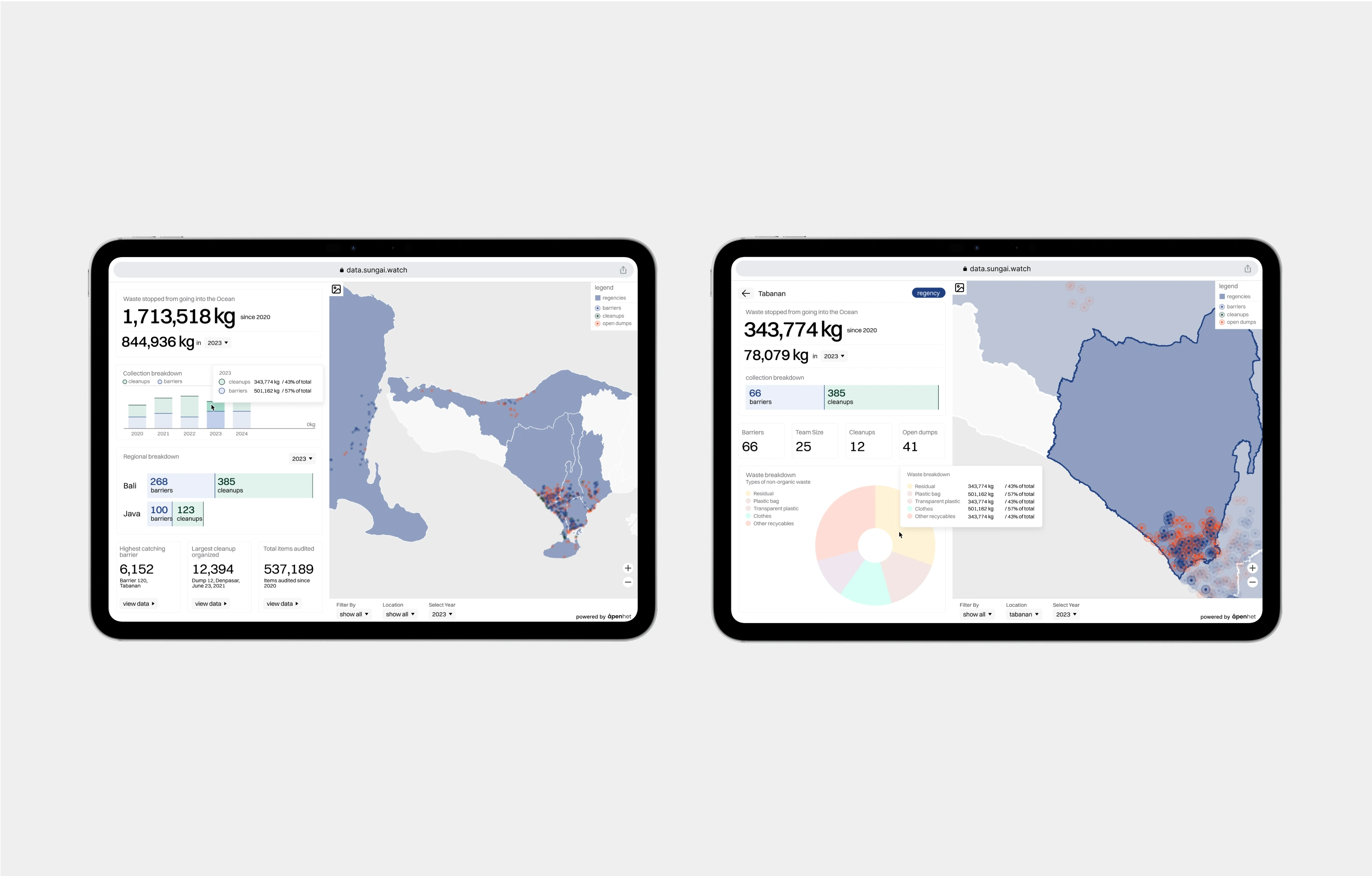 Sungai Watch is one of the most exciting new NGOs tackling ocean plastics in Indonesia. Since 2020, they’ve been intercepting waste in rivers before it reaches the sea, collecting it, and sending it to their centres. From the start, they’ve tracked the plastic products, brands, and locations of the waste — creating an incredibly valuable dataset. We brought this data to life in an interactive map, giving citizens, activists, and officials a clear view of where interventions are needed most, and providing Sungai Watch with a scalable tool to supercharge their impact.