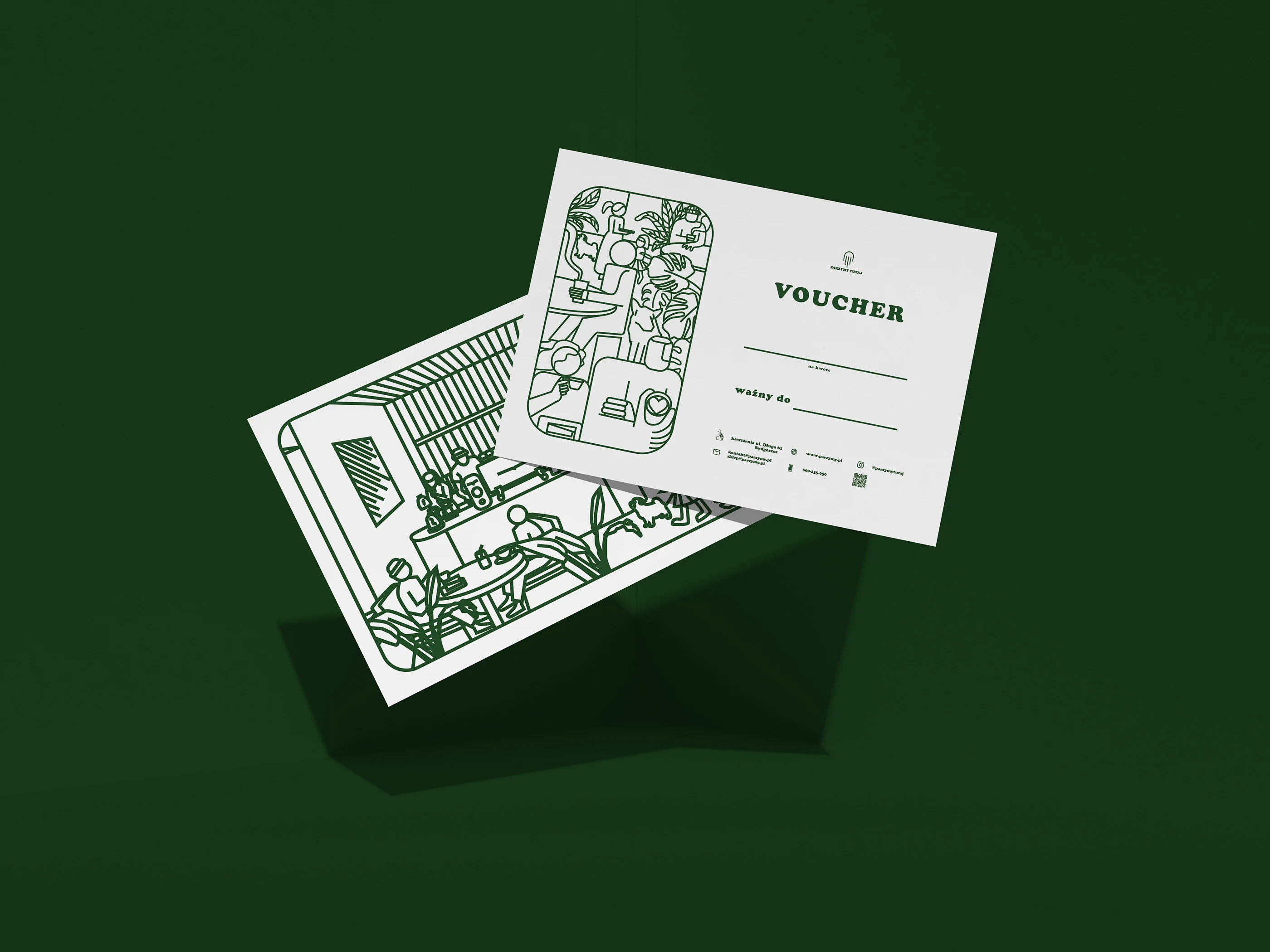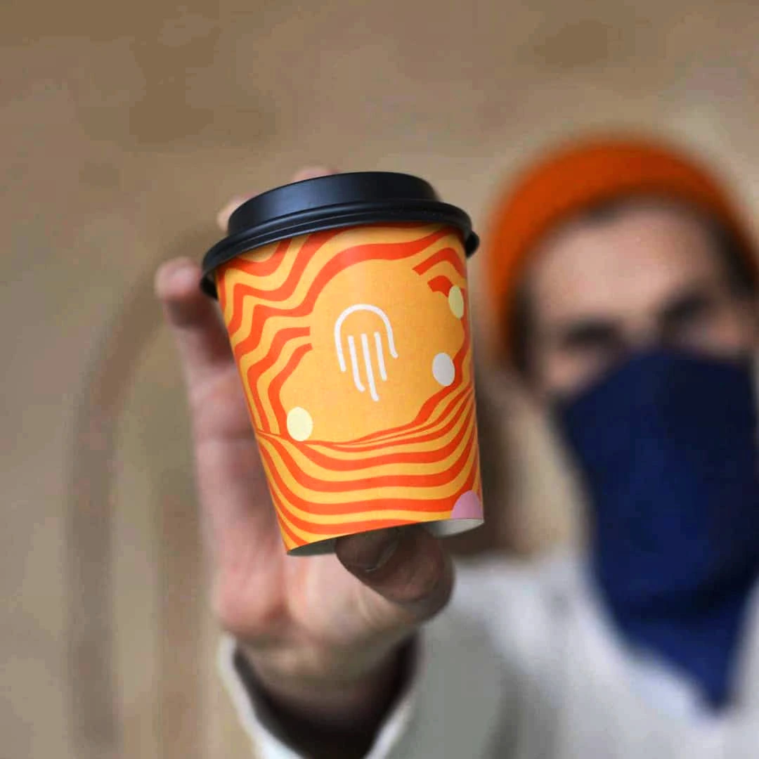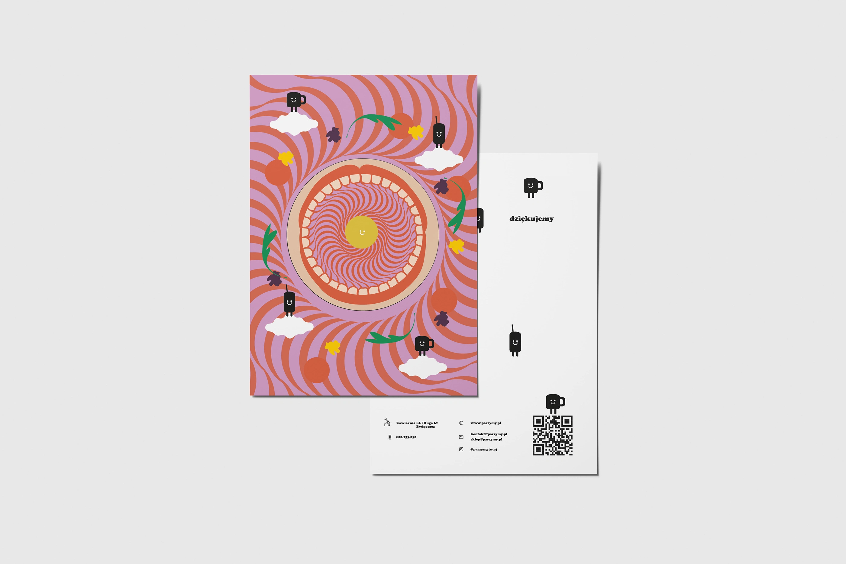Graphic materials for Parzymy Tutaj caffé. Menu, labels, vouchers, paper cup graphics, postcards, and social media graphics.
