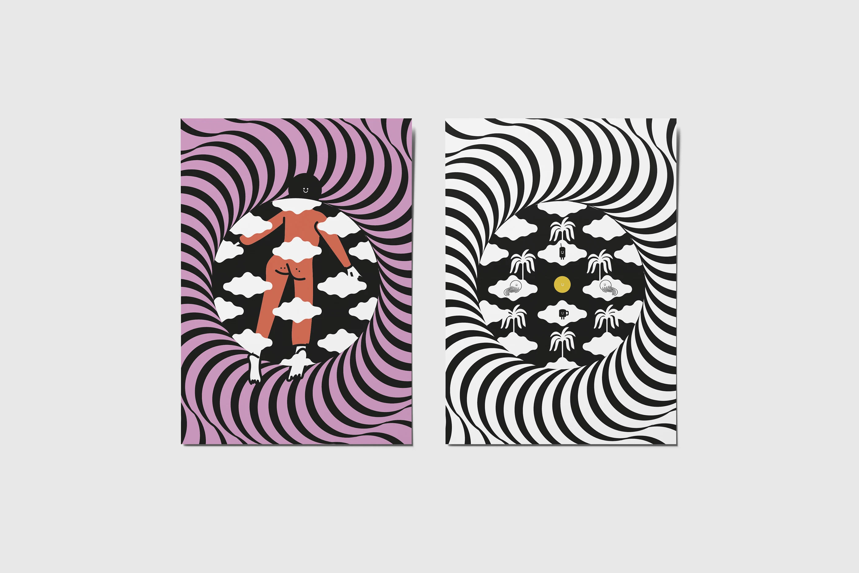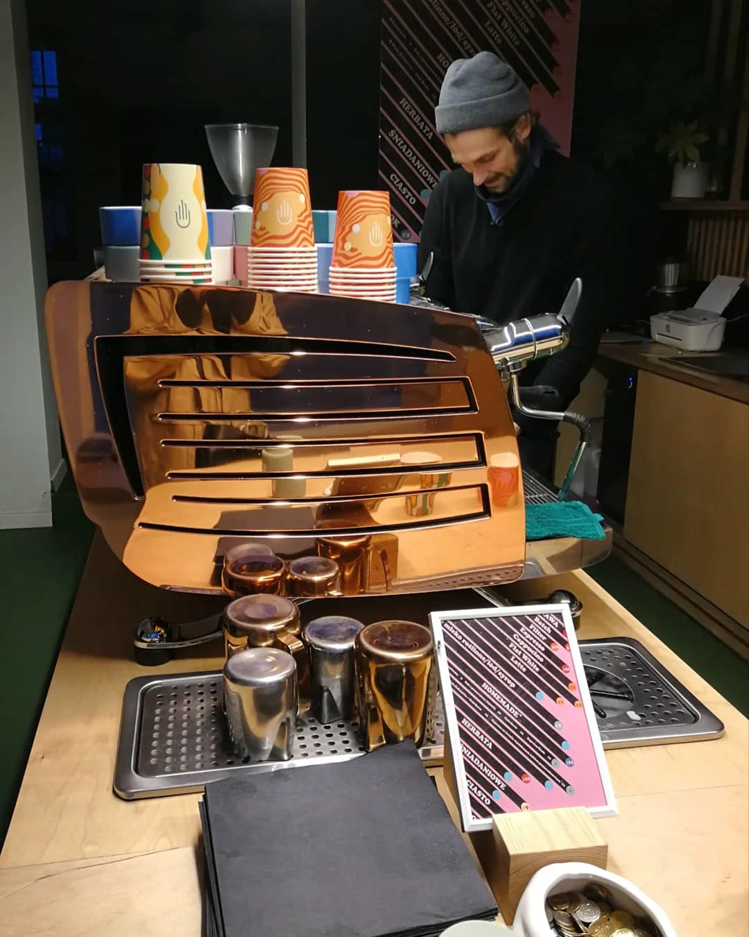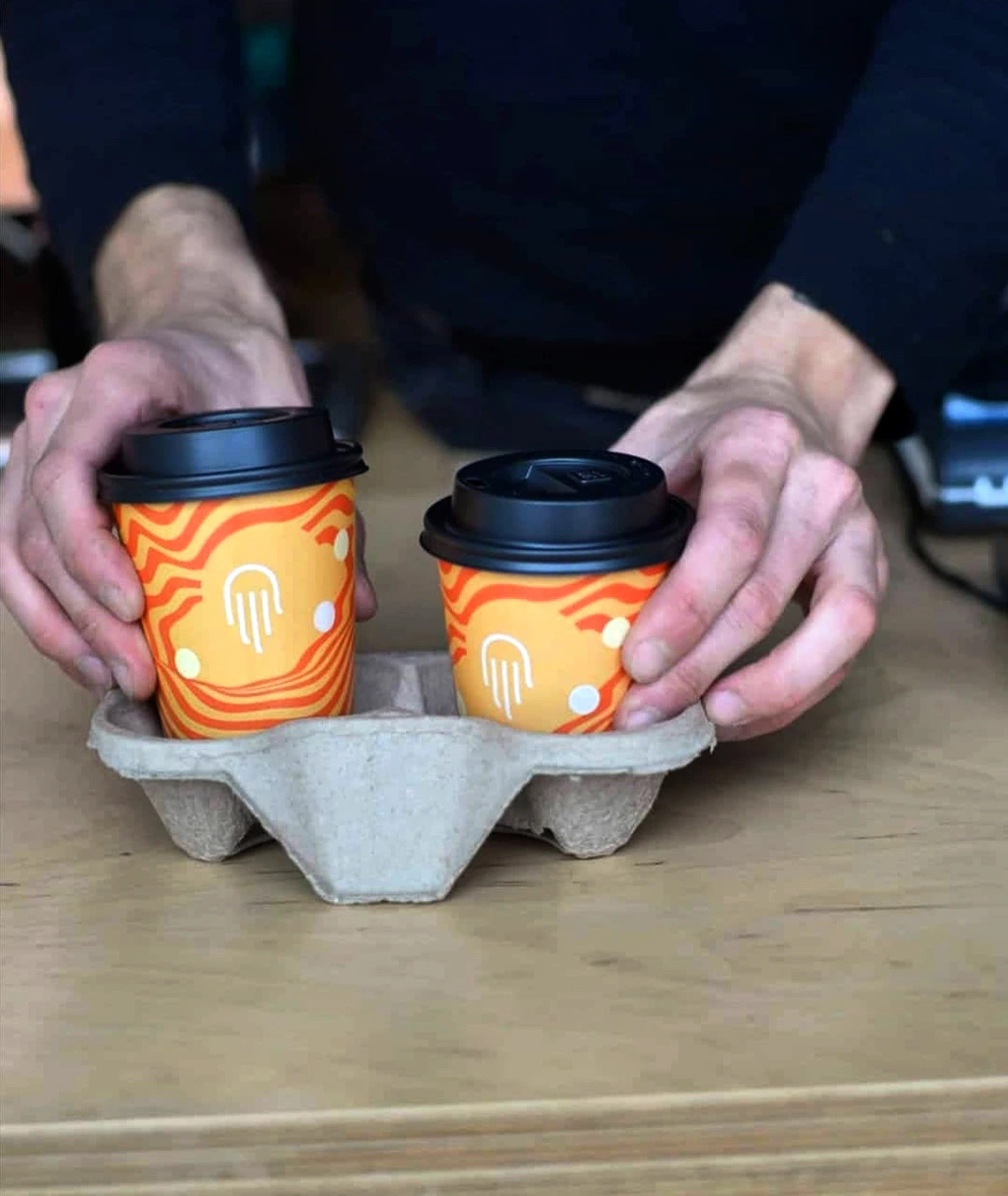 Graphic materials for Parzymy Tutaj caffé. Menu, labels, vouchers, paper cup graphics, postcards, and social media graphics.