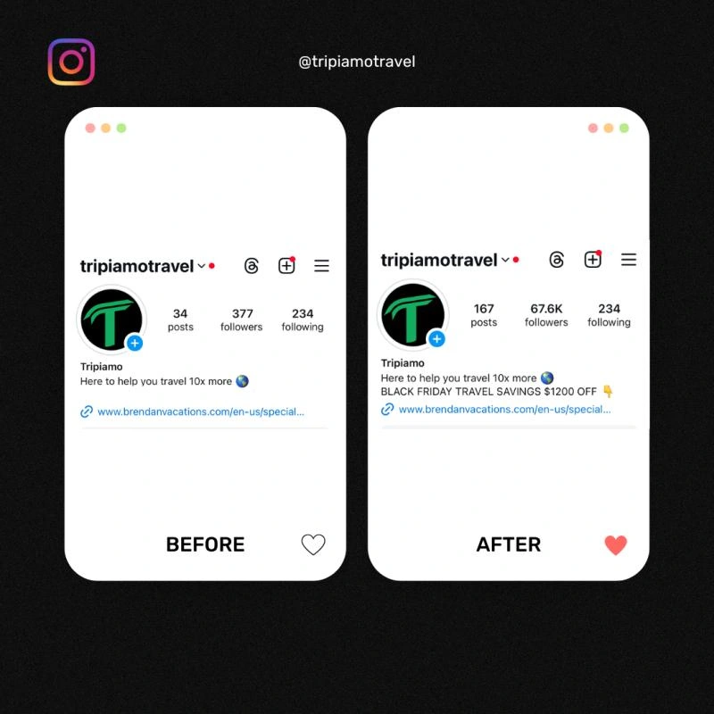 Grew @tripiamotravel's Instagram from 377 to 67.6K using viral content, bio optimization & Reels strategy to drive growth in under 3 months.