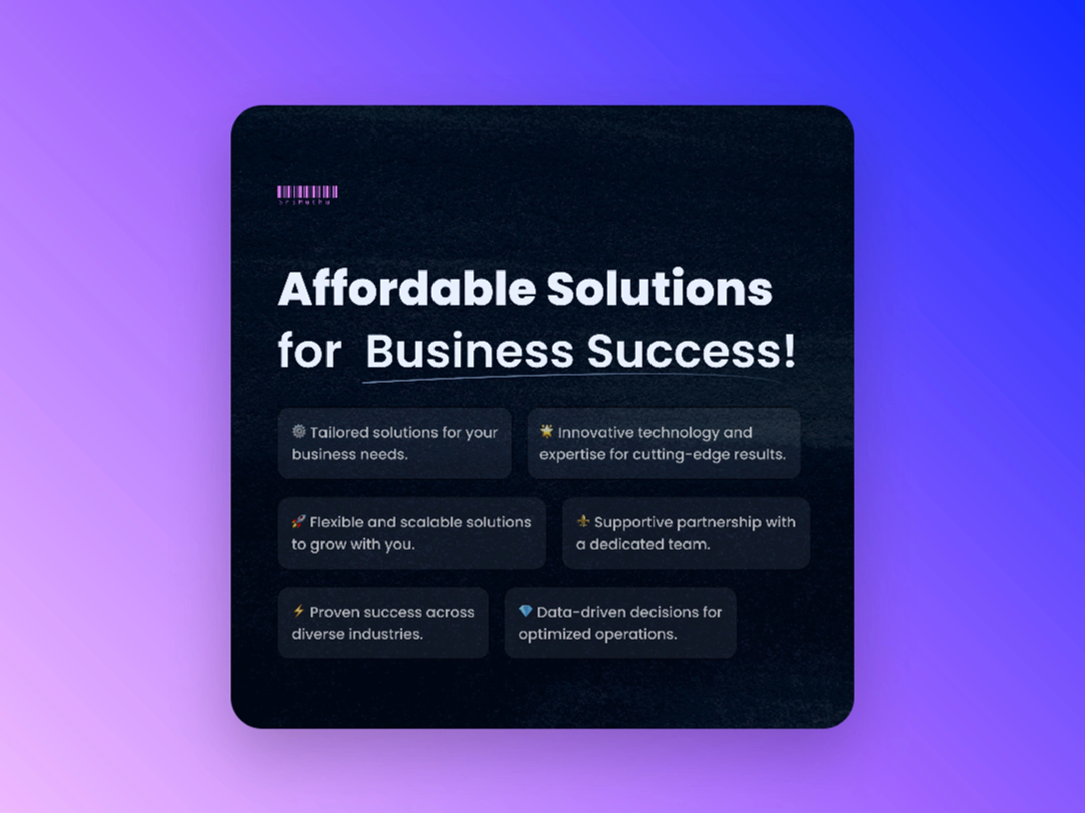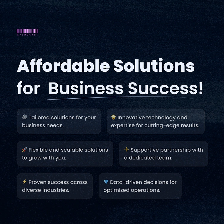 Promotional graphic highlighting affordable, scalable business solutions—clean layout with icons, bold typography, and value-driven messaging.
