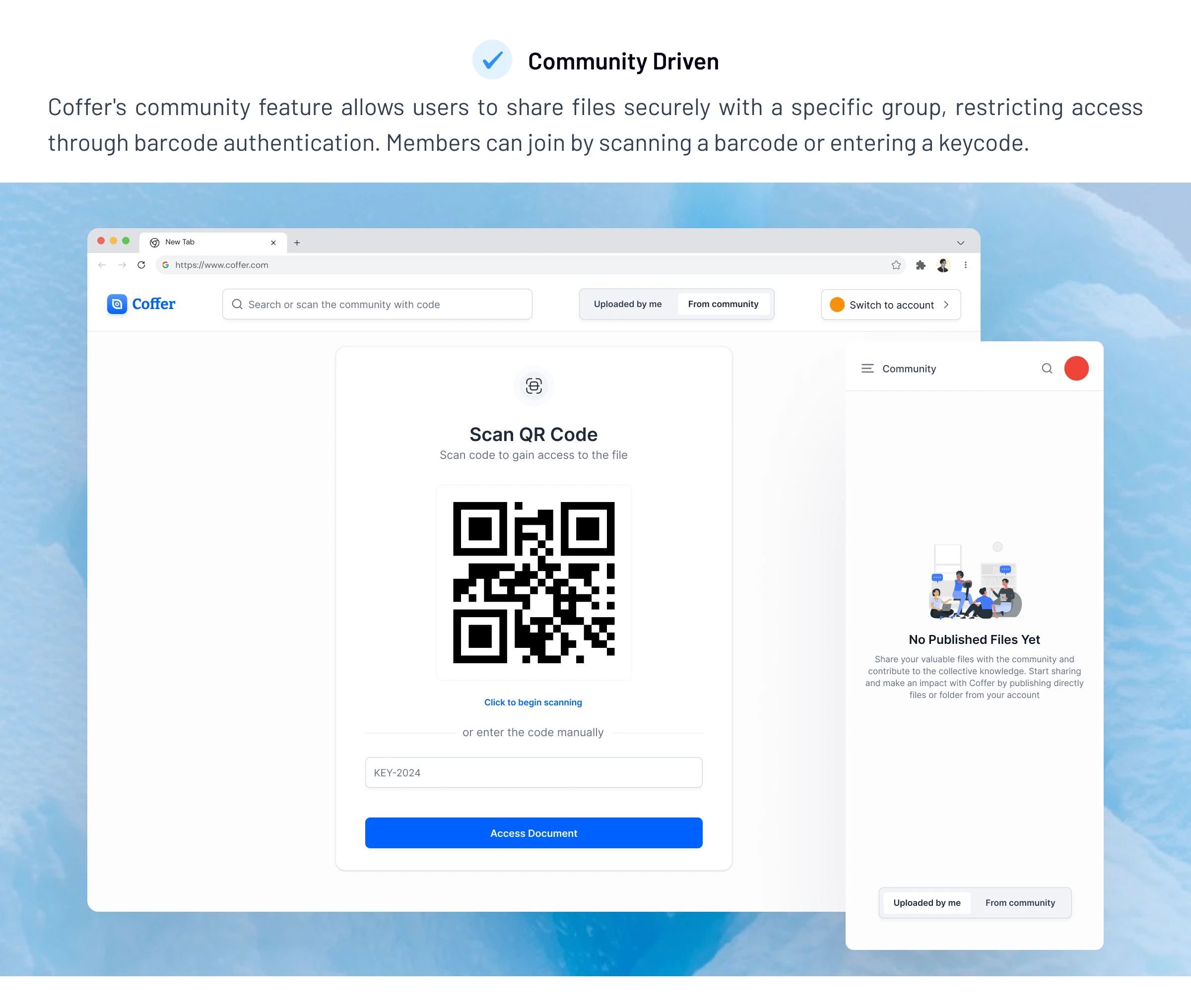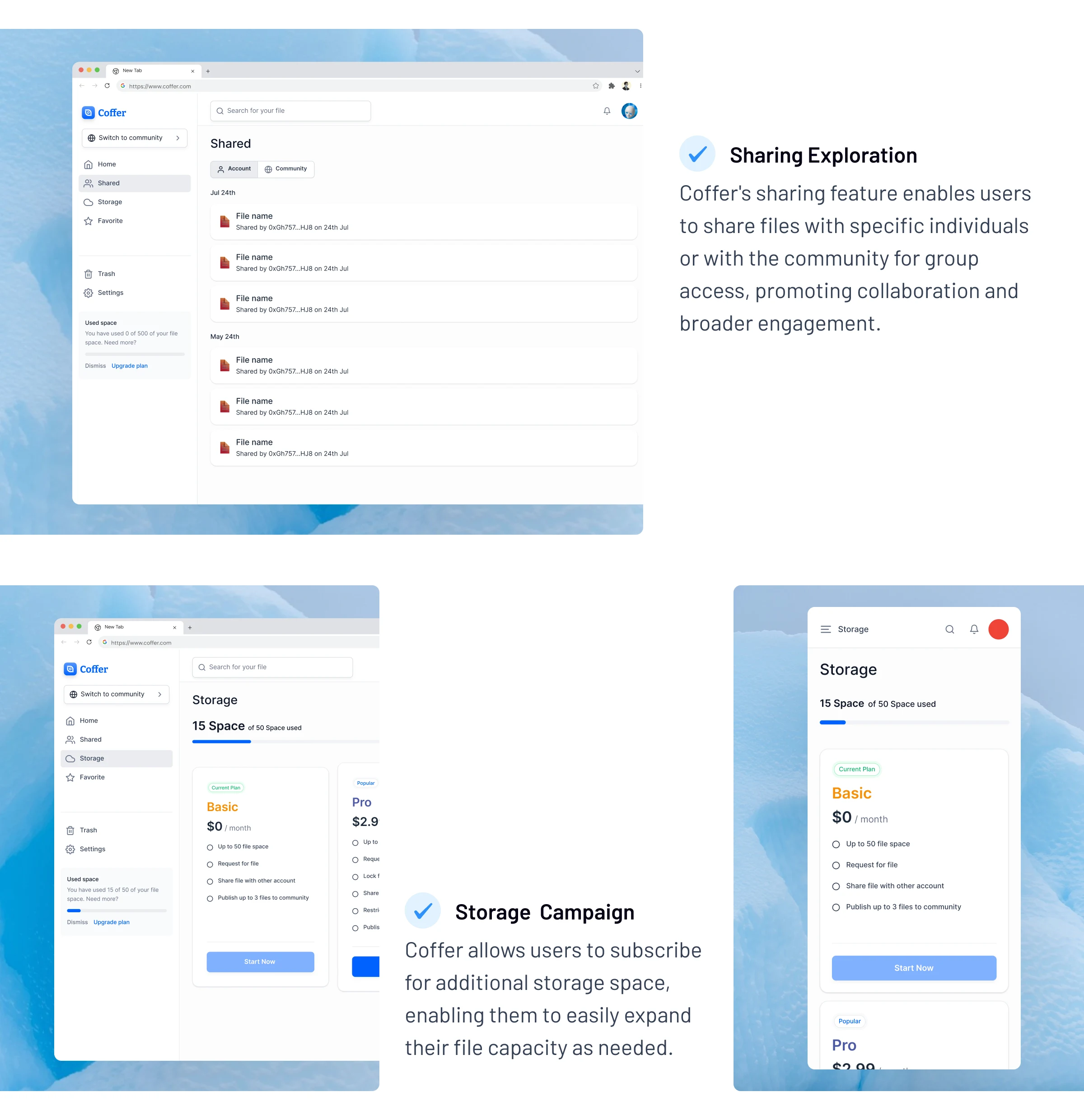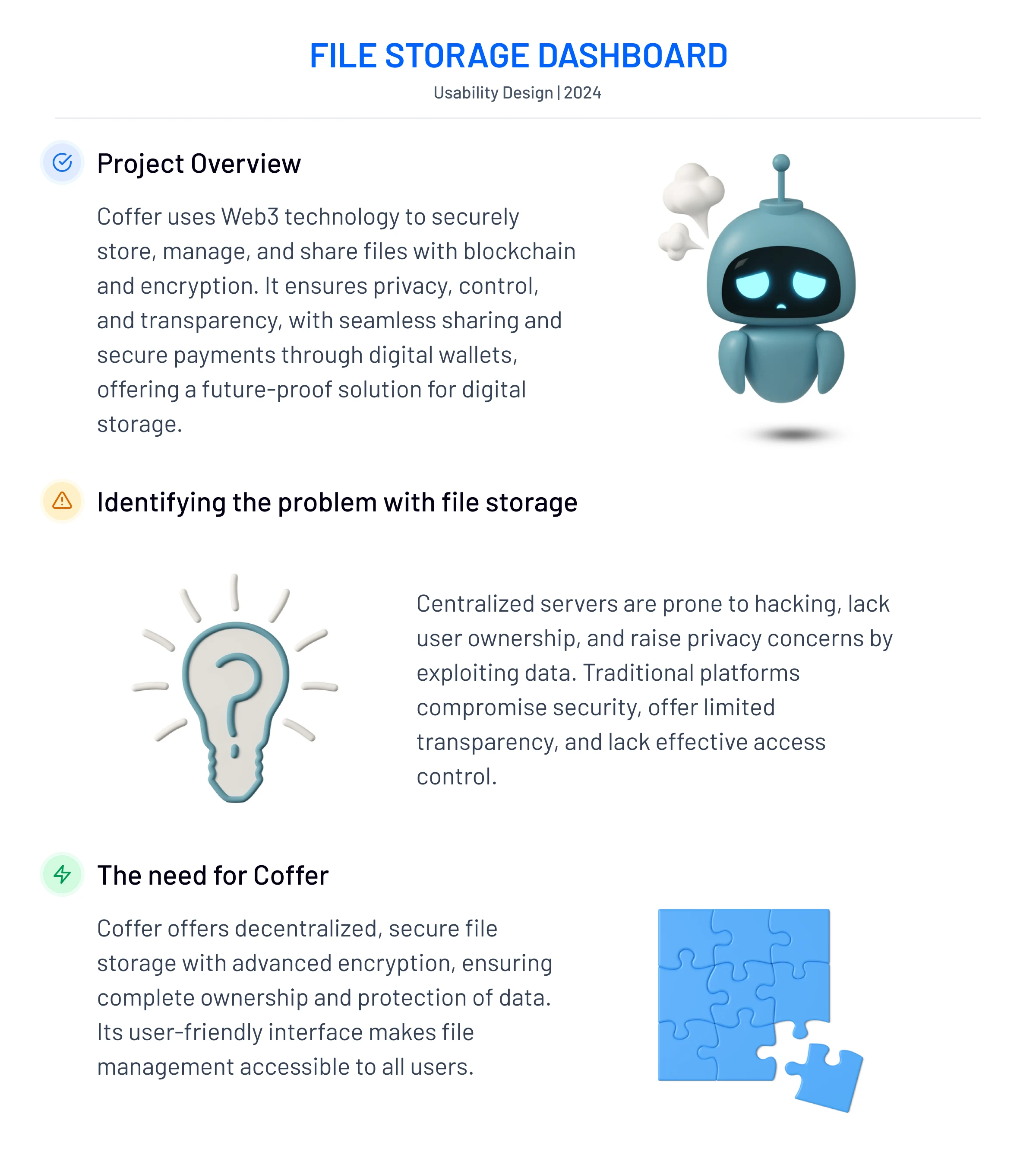 Coffer uses Web3 technology to securely store, manage, and share files with blockchain and encryption. It ensures privacy, control, and transparency, with seamless sharing and secure payments through digital wallets, offering a future-proof solution for digital storage