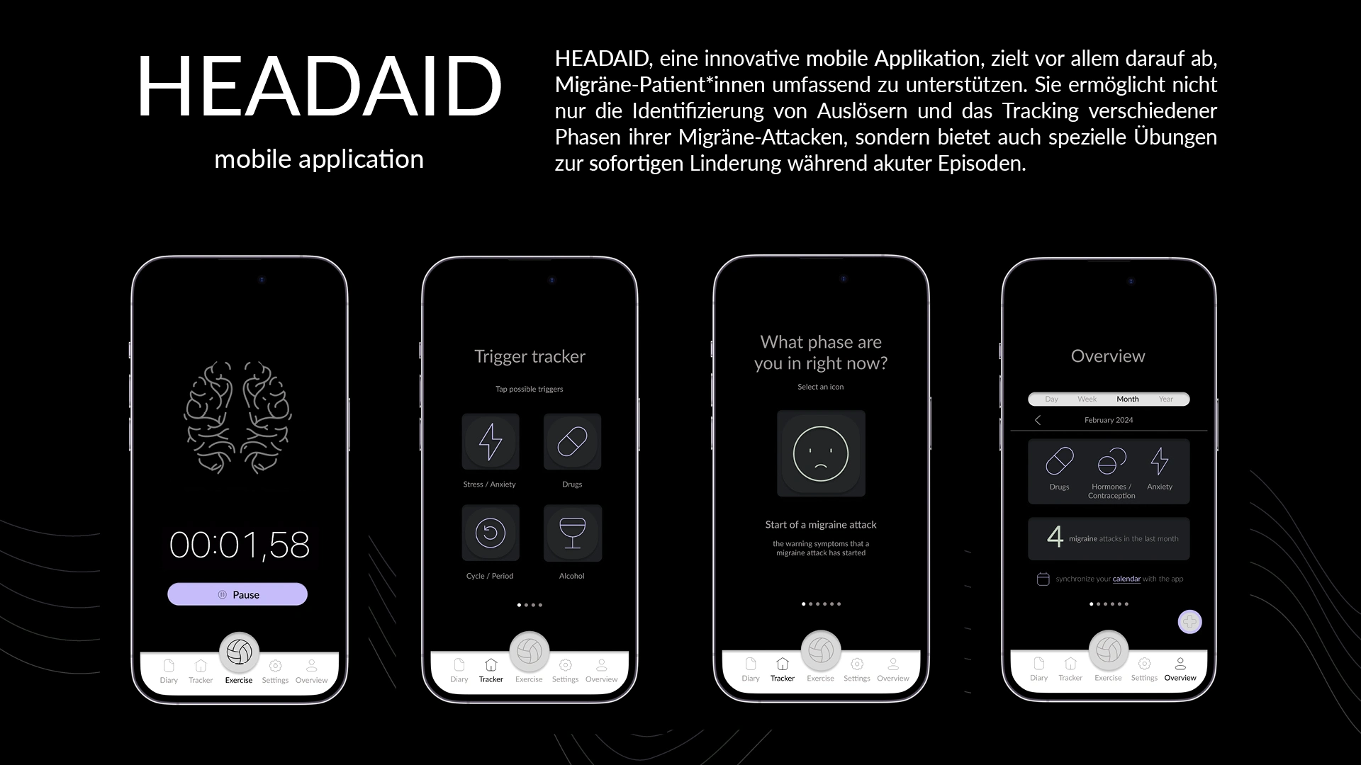 To design an intuitive and calming mobile app for Headaid, a migraine relief application aimed at providing immediate support during migraine attacks. The goal was to create an app that minimizes visual stimulation while offering effective, practical solutions for migraine sufferers, developed in close collaboration with both medical specialists and patients.
