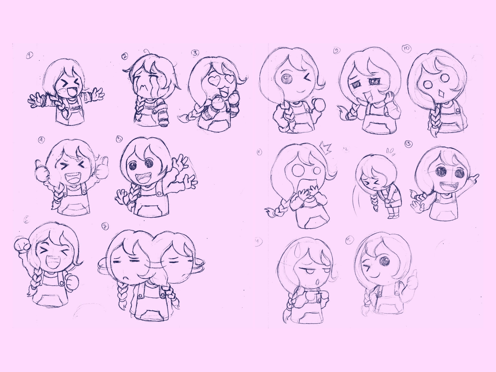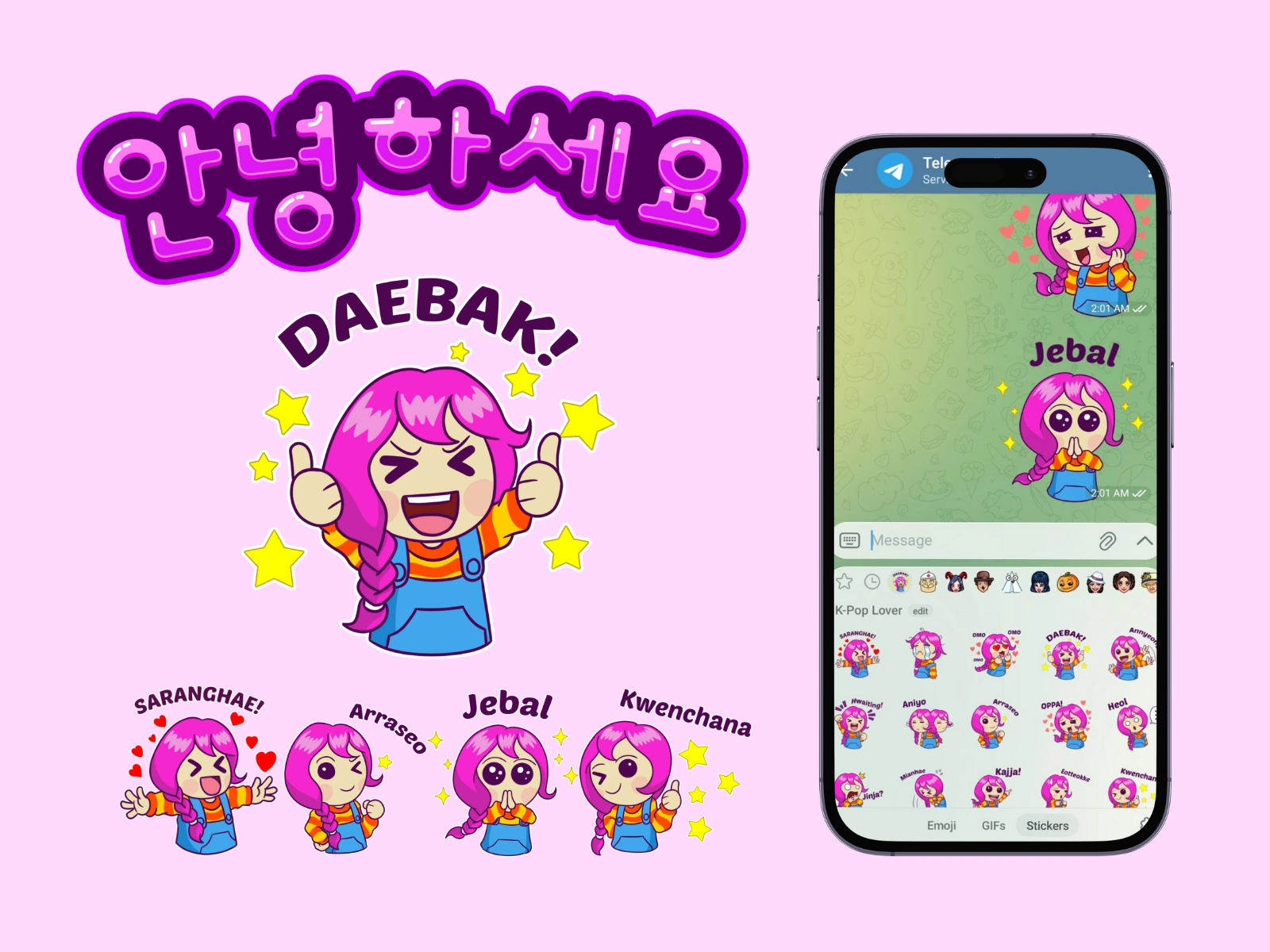 A K–pop–inspired girl character designed as a Telegram sticker pack. Each sticker uses Korean expressions and slang so users can express emotions naturally in everyday chats.