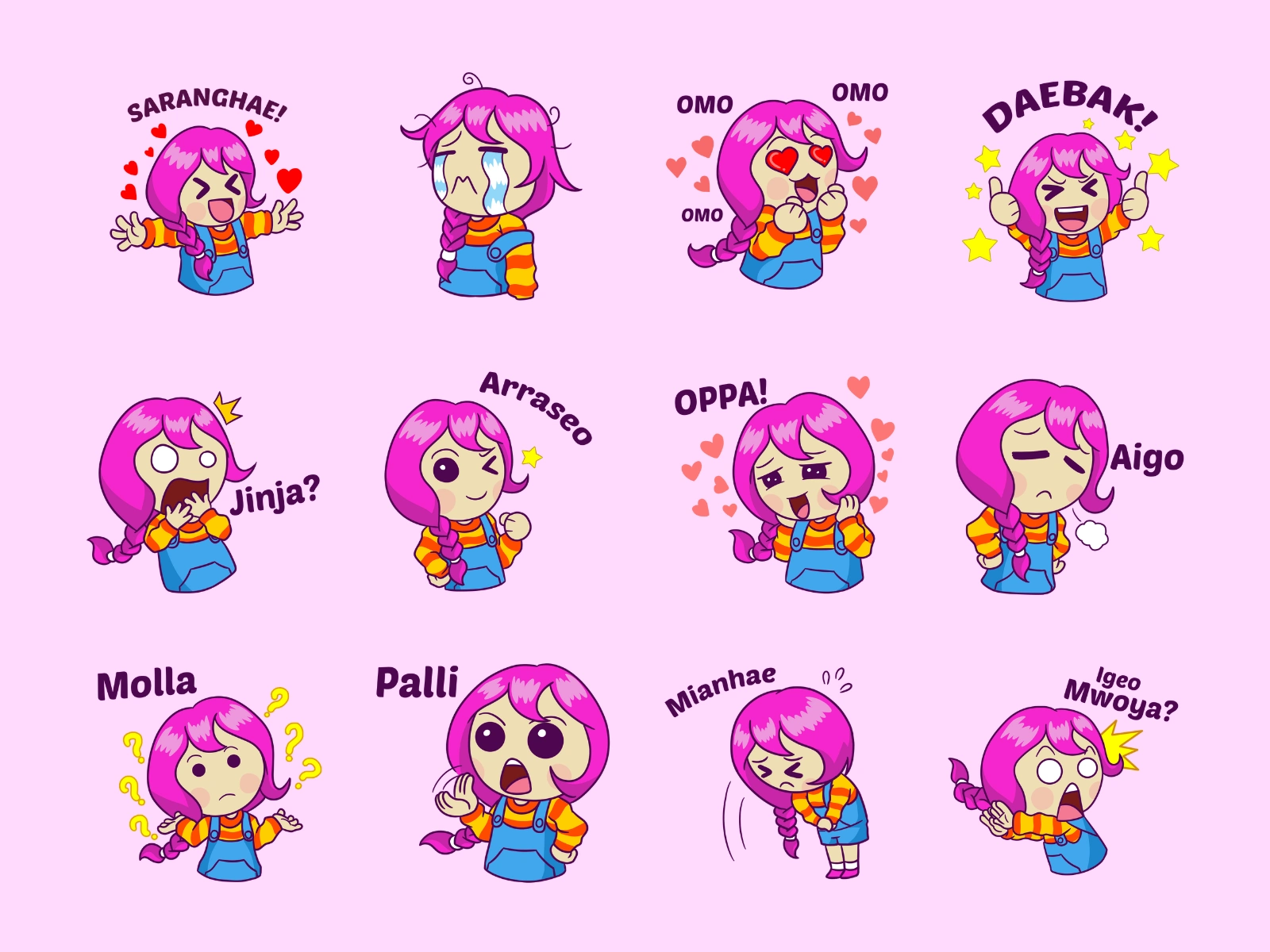 A K–pop–inspired girl character designed as a Telegram sticker pack. Each sticker uses Korean expressions and slang so users can express emotions naturally/