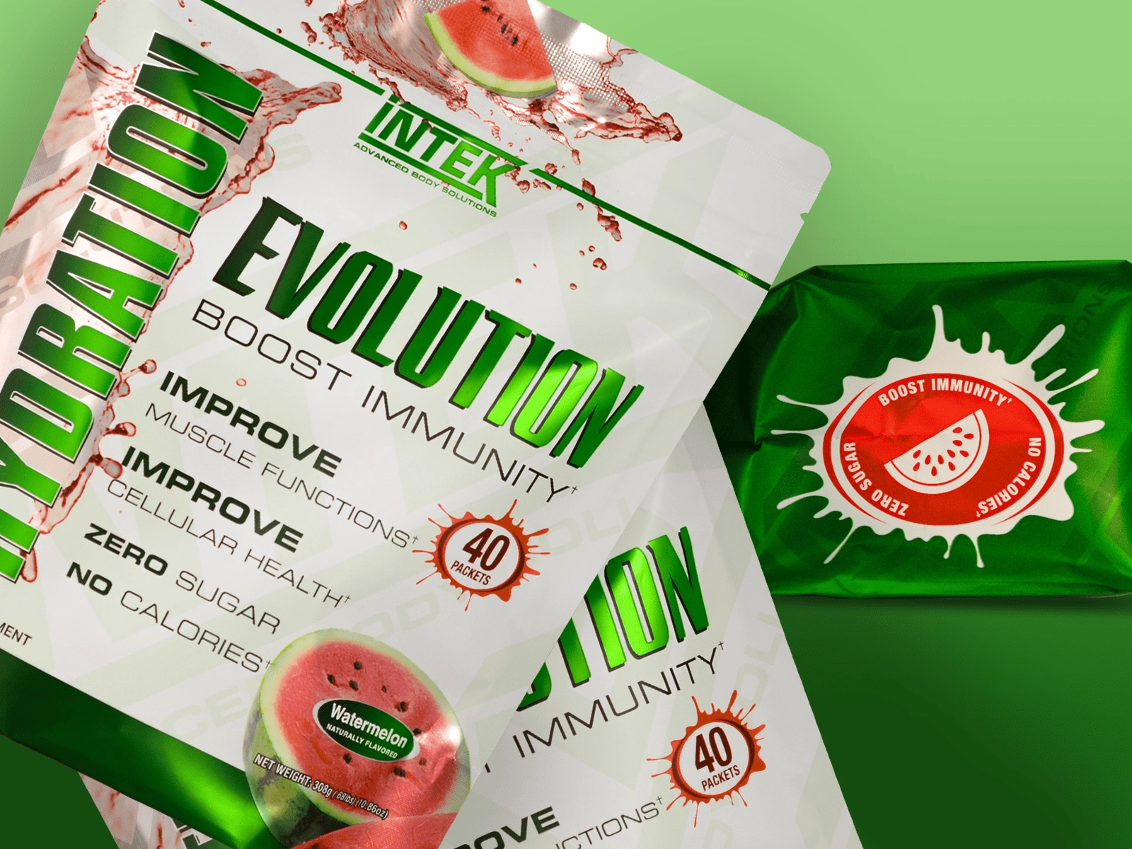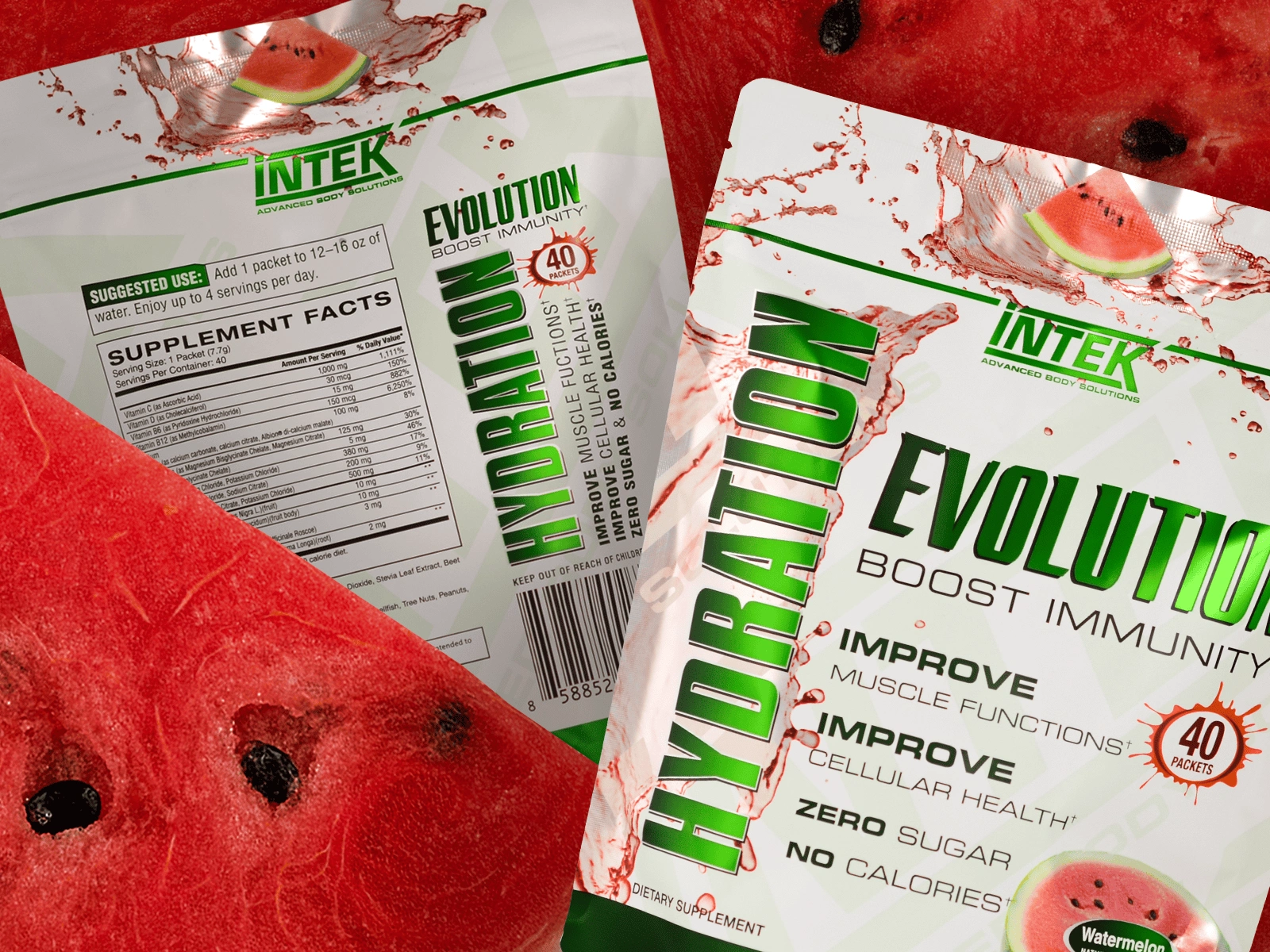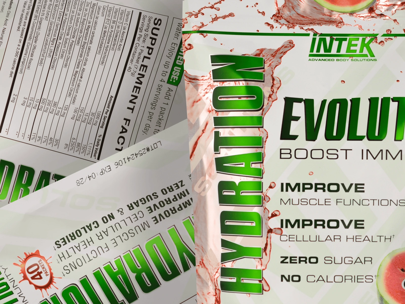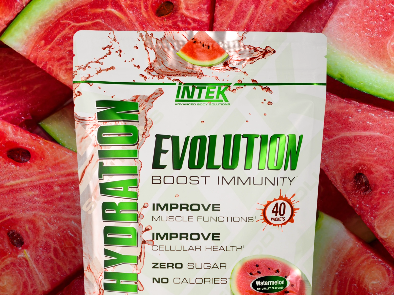 Kellen Design crafted the package design for Intek’s Hydration Evolution Watermelon flavor to harmonize with the established style of the brand’s other bagged products. The artwork incorporates a reflective silver film, custom white screens, and a soft touch matte laminate cover to provide a premium finish.