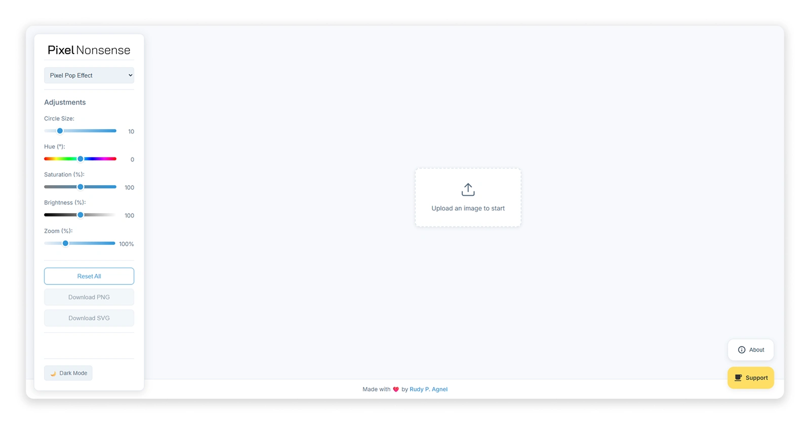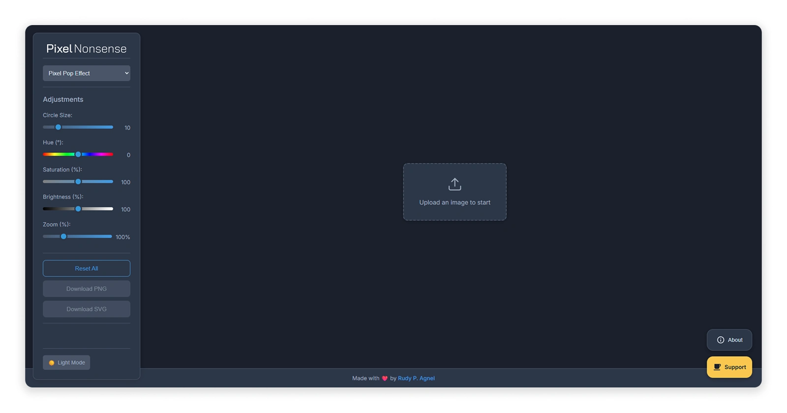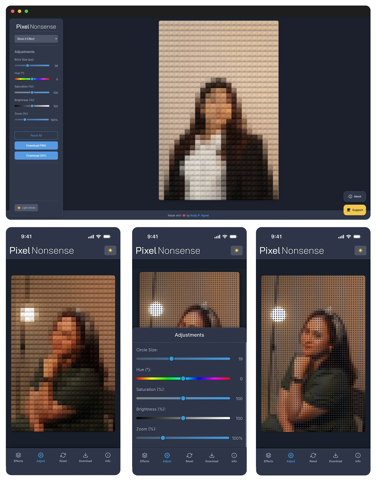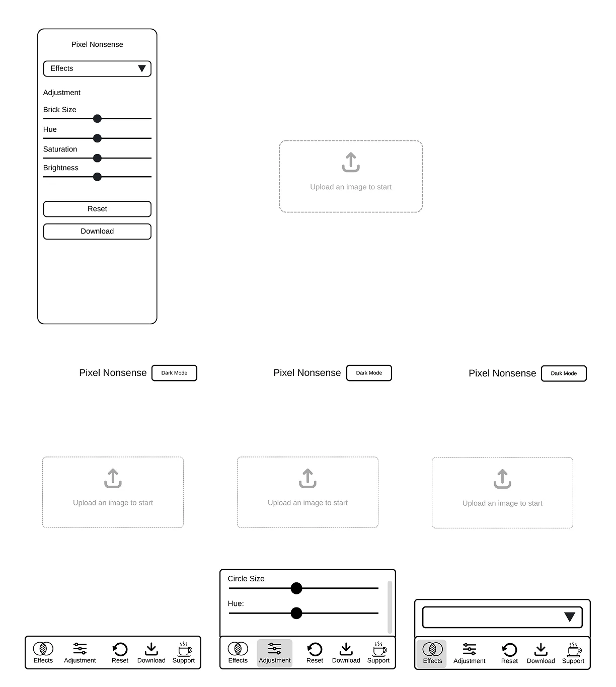 PixelNonsense, it lived as a barebones experiment called Brick It!. Brick It! was as minimal as it gets, an effect: a circle pixelation filter. Light mode only (sorry, night owls).No mobile version.A flat “brick” look that felt more like a placeholder than a finished effect. Basically, it was the MVP of nonsense. Functional, funny, but not much more. Then I did something ridiculous: I wireframed the whole thing. Yes, a wireframe for a joke app. That was my way of saying, “Okay, this might be stupid, but let’s at least make it good stupid.”From there, I pushed it through Google Gemini 2.5 Pro and vibe-coded my way into version two: PixelNonsense.This time, it came with upgrade effects instead of one, including a Lego-brick-ish mode with drop shadows and a 3D look. A smoother mobile and desktop experience. Dark mode, because who are we kidding, we all live in dark mode.