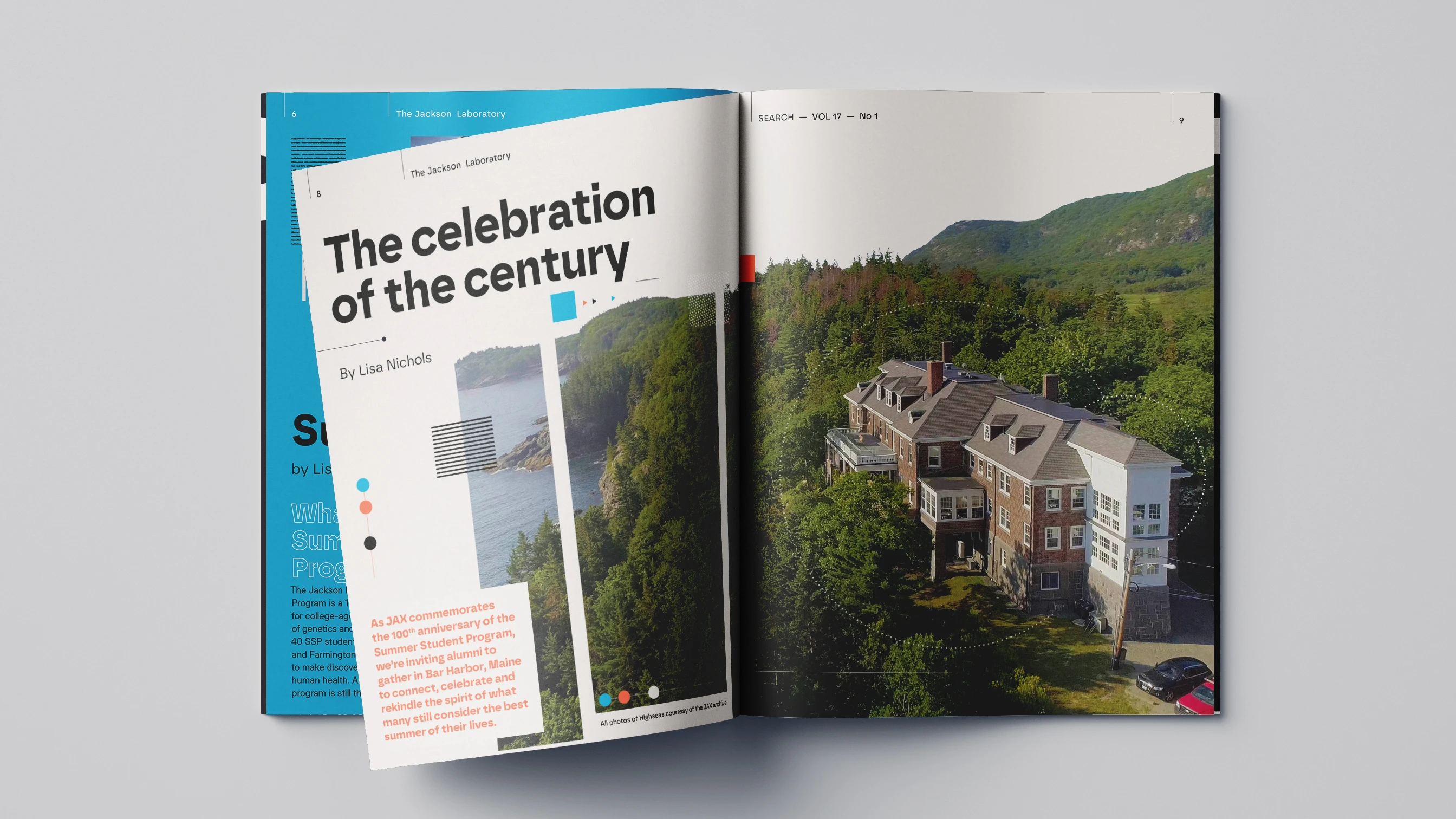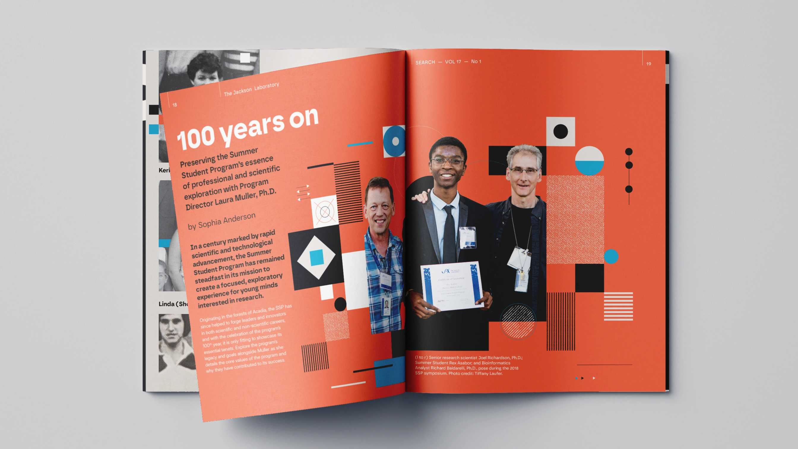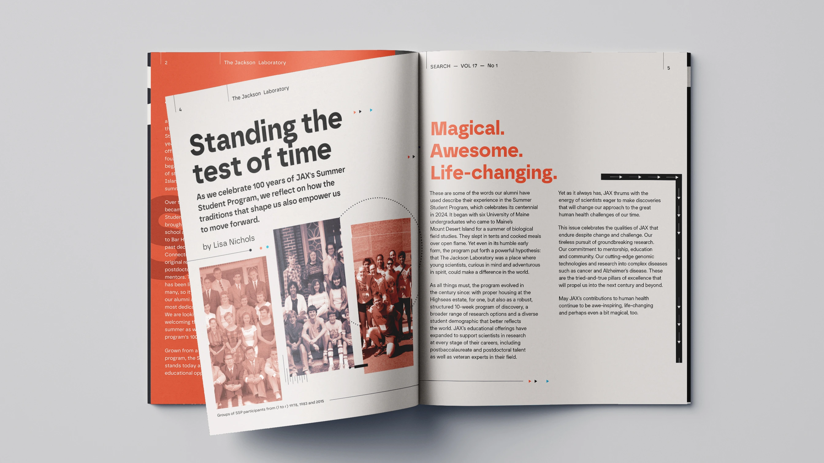 Editorial redesign for Jackson Laboratory's Search Magazine centennial issue, celebrating 100 years of the Summer Student Program. The challenge: making complex genetic research accessible to diverse audiences—scientists, donors, policy makers—without compromising technical accuracy or the publication's established credibility.