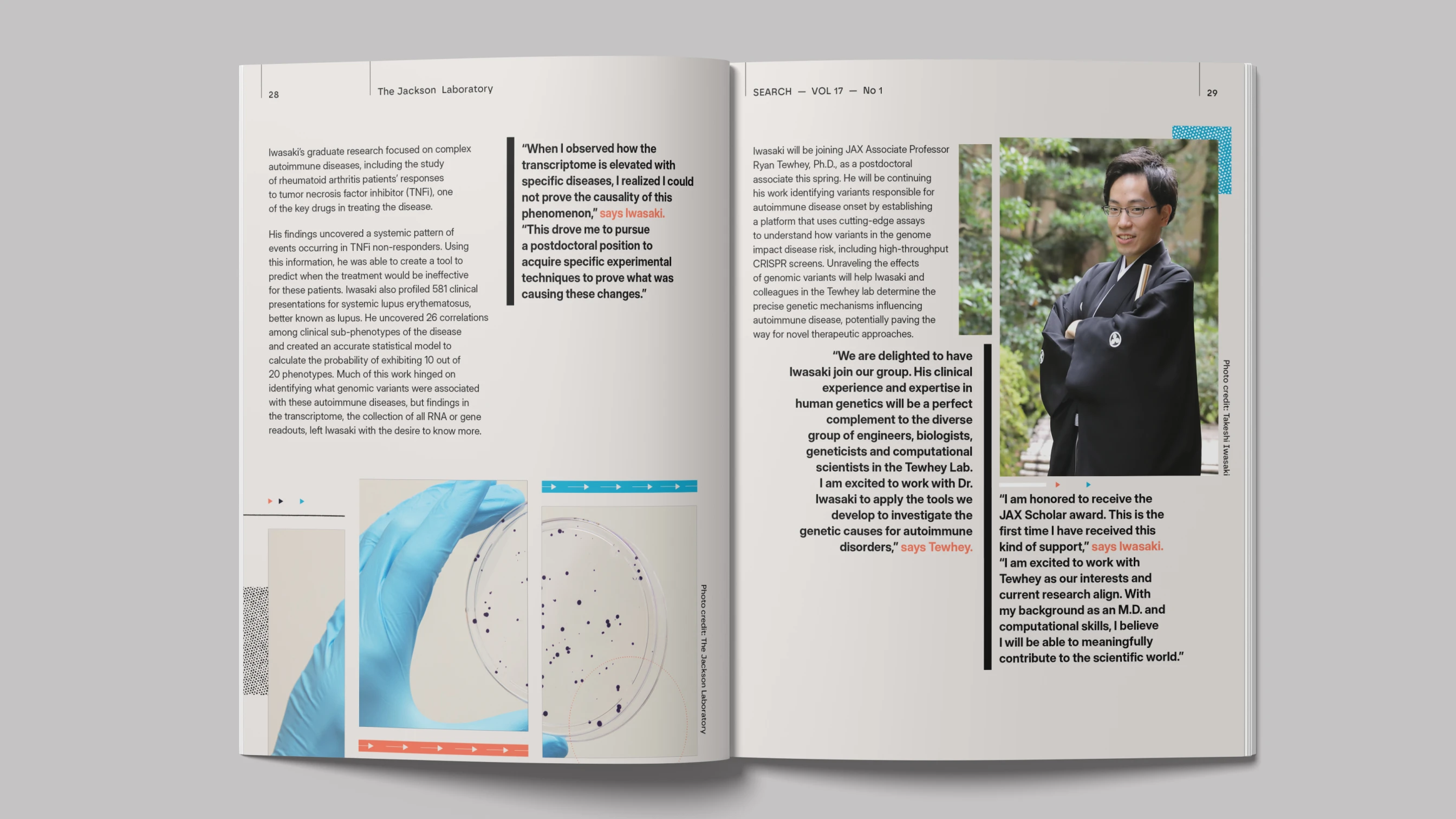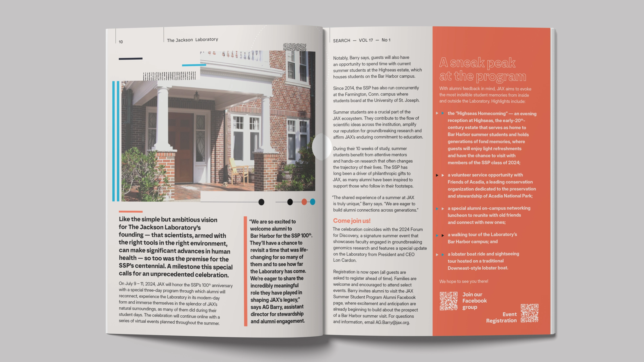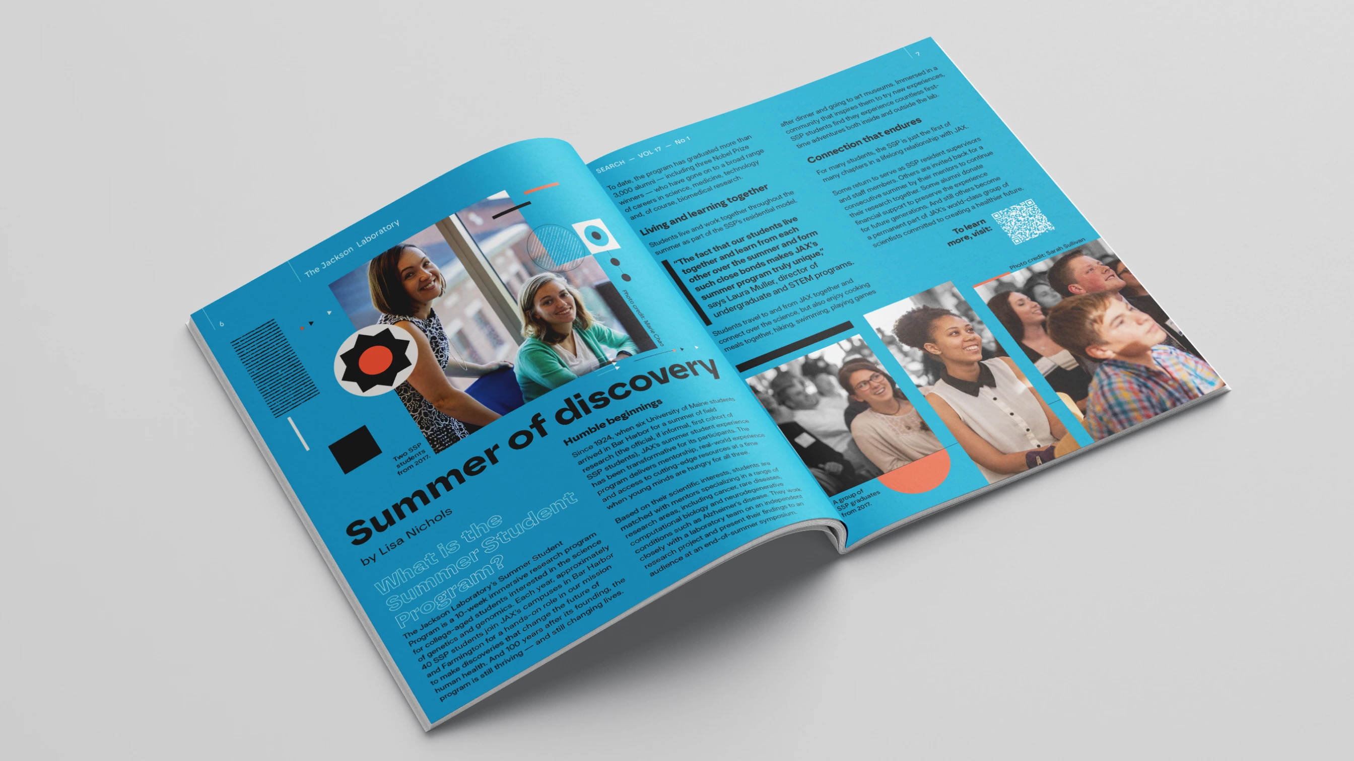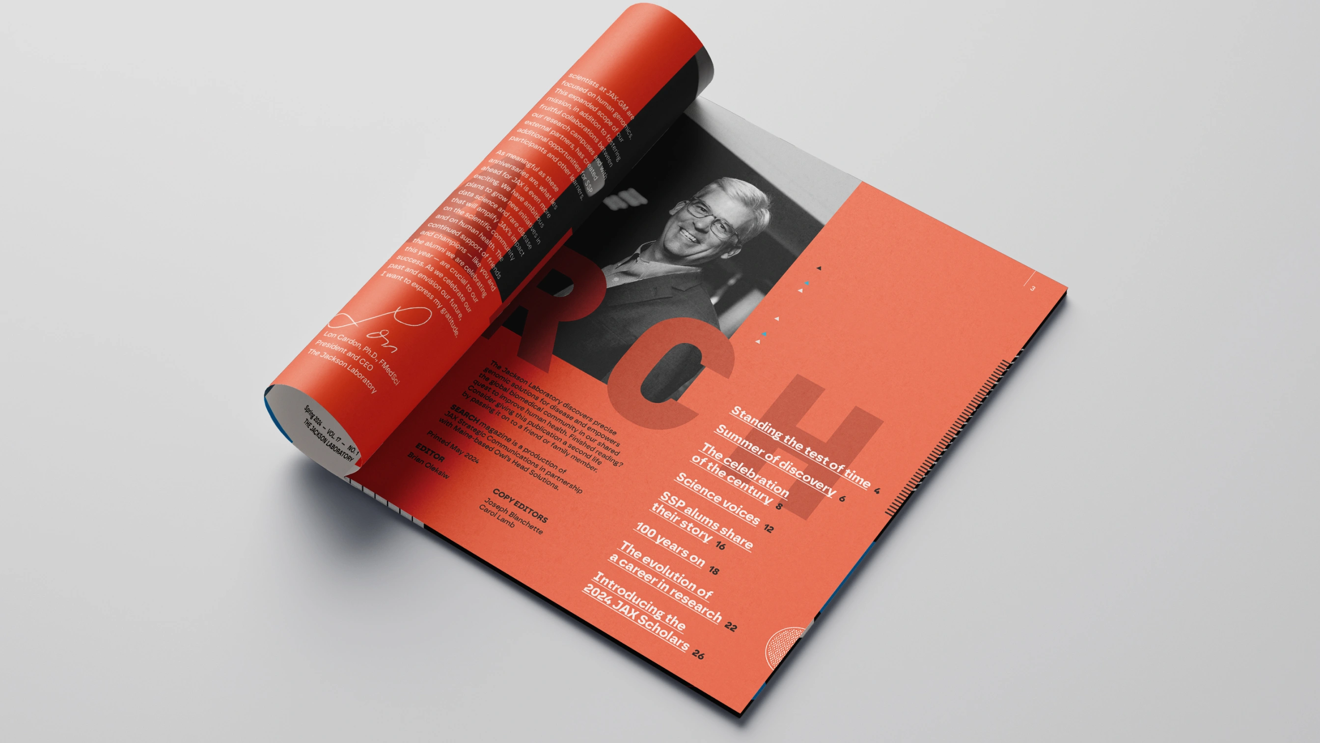 Editorial redesign for Jackson Laboratory's Search Magazine centennial issue, celebrating 100 years of the Summer Student Program. The challenge: making complex genetic research accessible to diverse audiences—scientists, donors, policy makers—without compromising technical accuracy or the publication's established credibility.