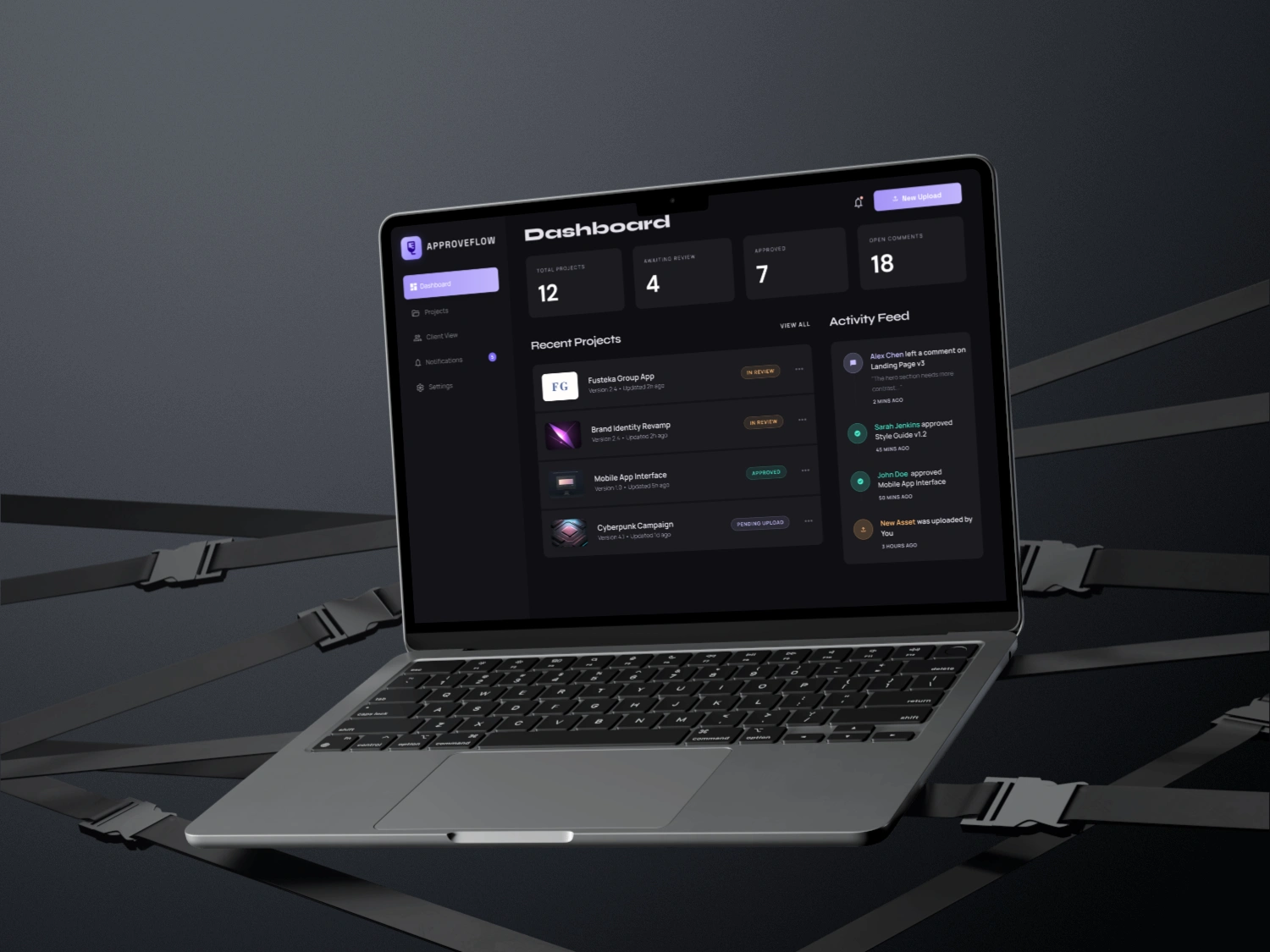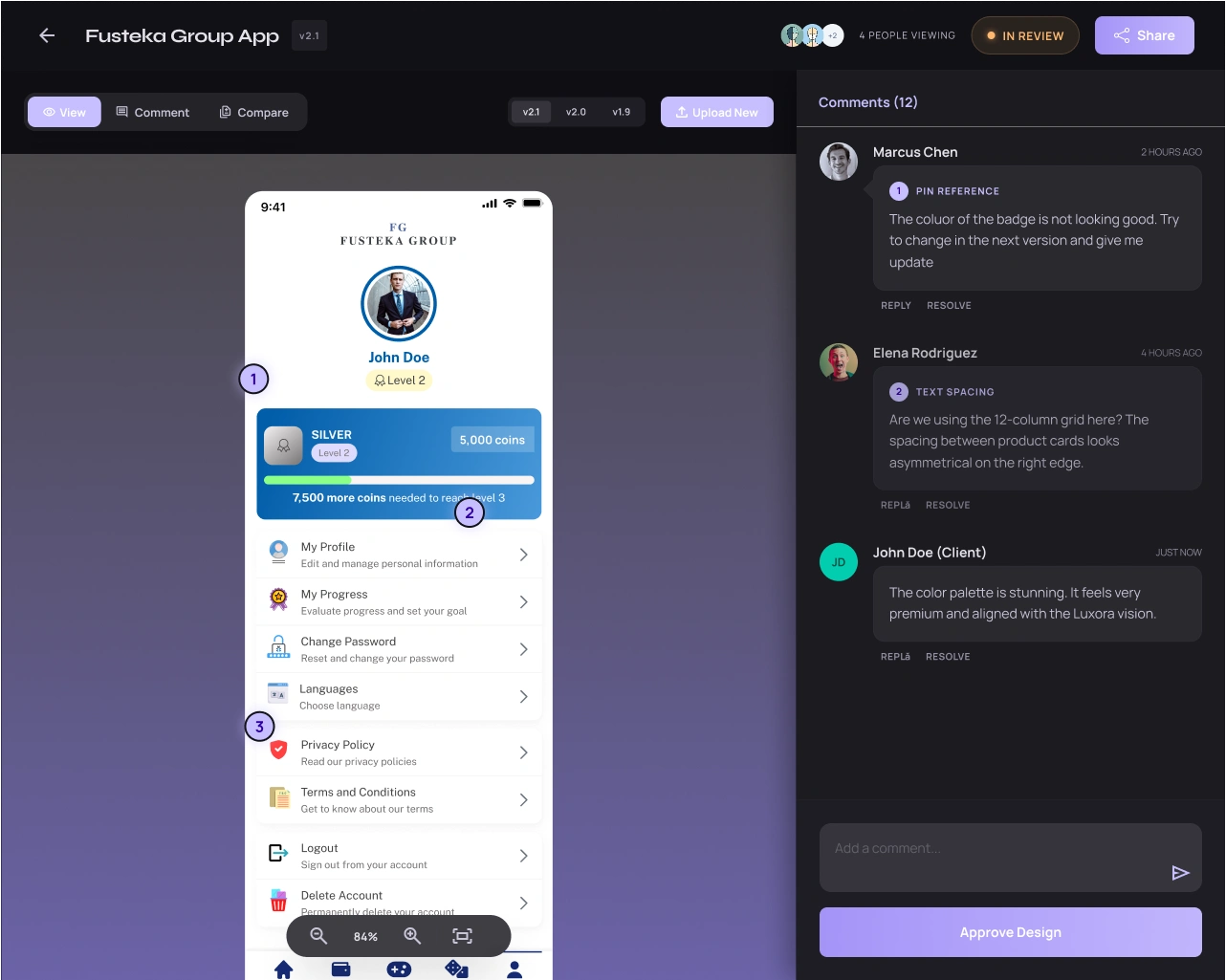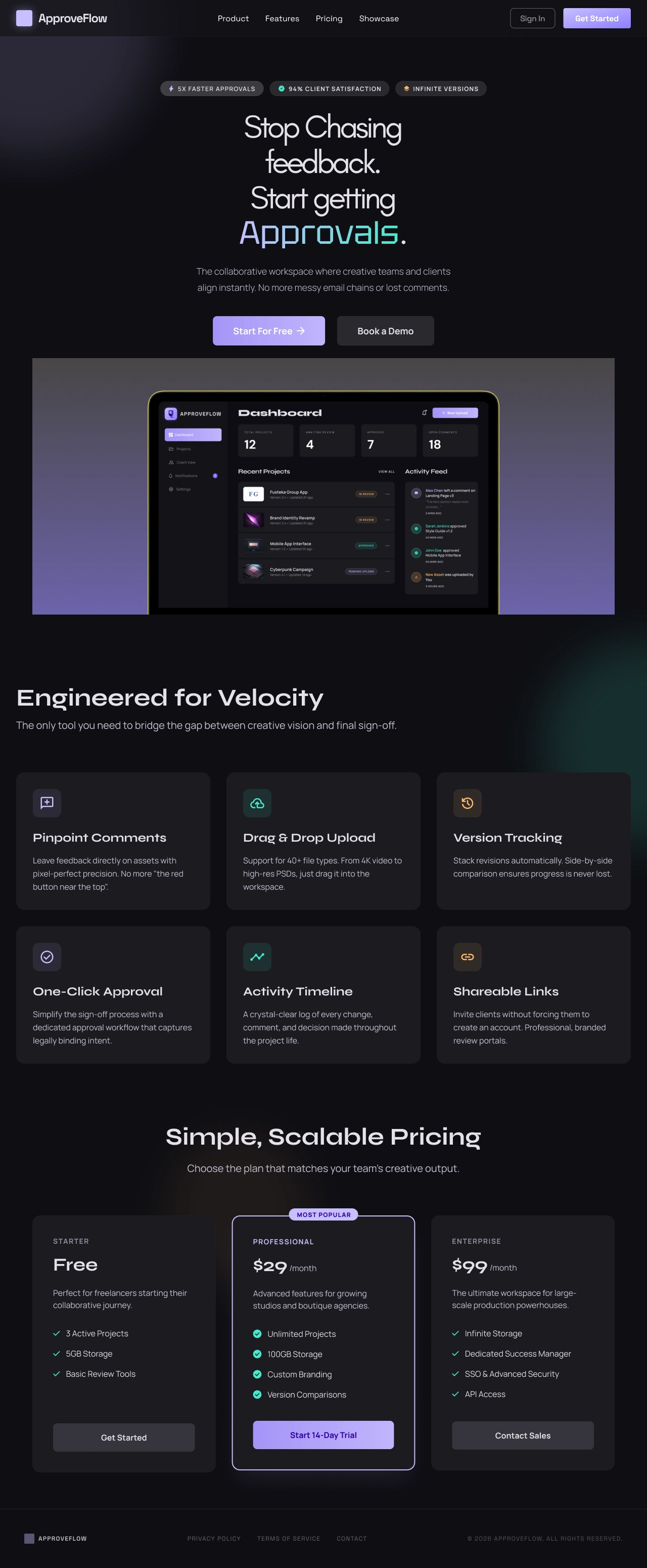 The product covers the full end-to-end workflow across 8 screens — a marketing landing page, authentication, a designer dashboard, project detail view with annotated comment pins, file upload modal, a no-login client review mode, notifications panel, and settings. Every screen was designed with two users in mind: the designer who needs clarity and control, and the client who needs simplicity and zero friction.