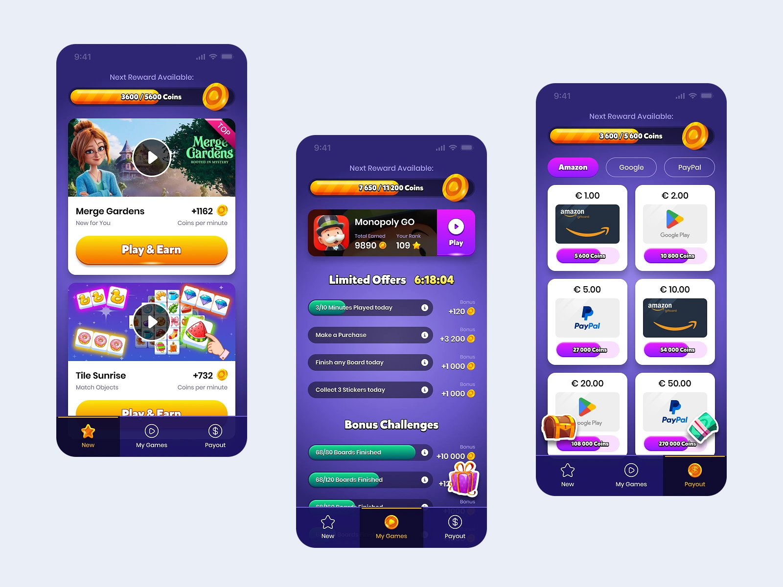An app with game recommendations that allows users to discover new mobile games and earn virtual currency for reaching certain milestones in downloaded games.
