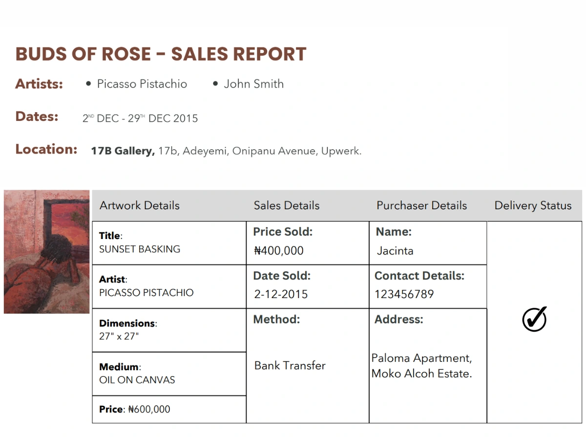 Sales report showing buyer details, purchase date, and quantity for a single product.