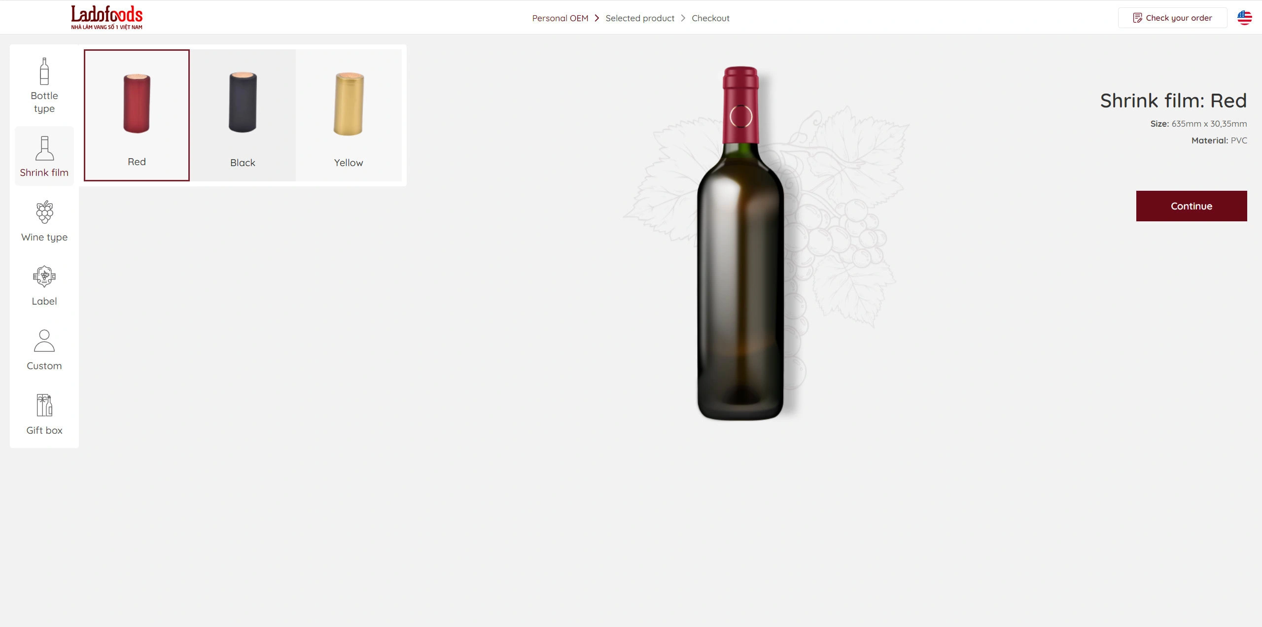 Use local storage to save the selected item (Bottle type, shrink film, label,...) and load it in the preview / Selected product page / Checkout page,...