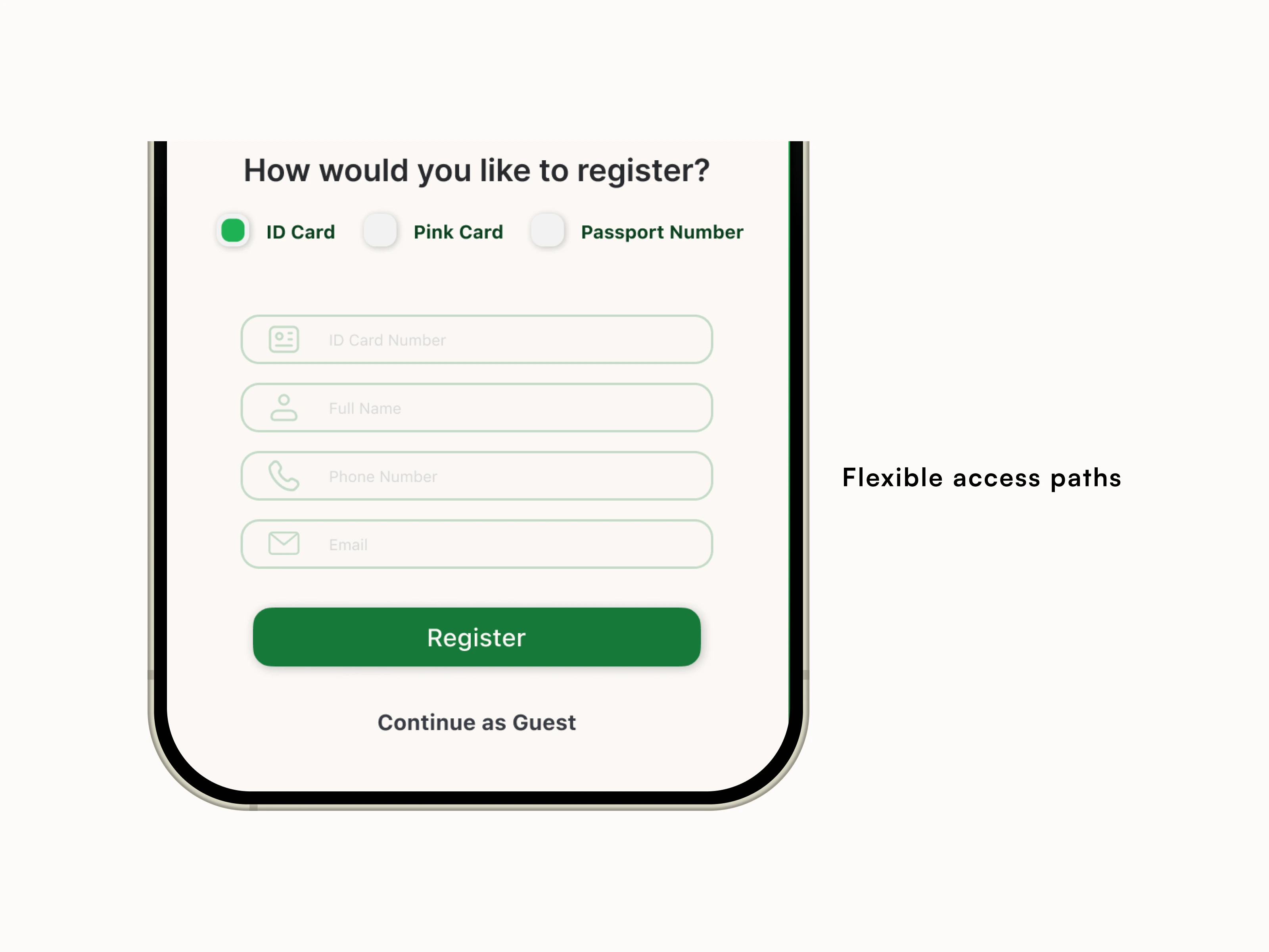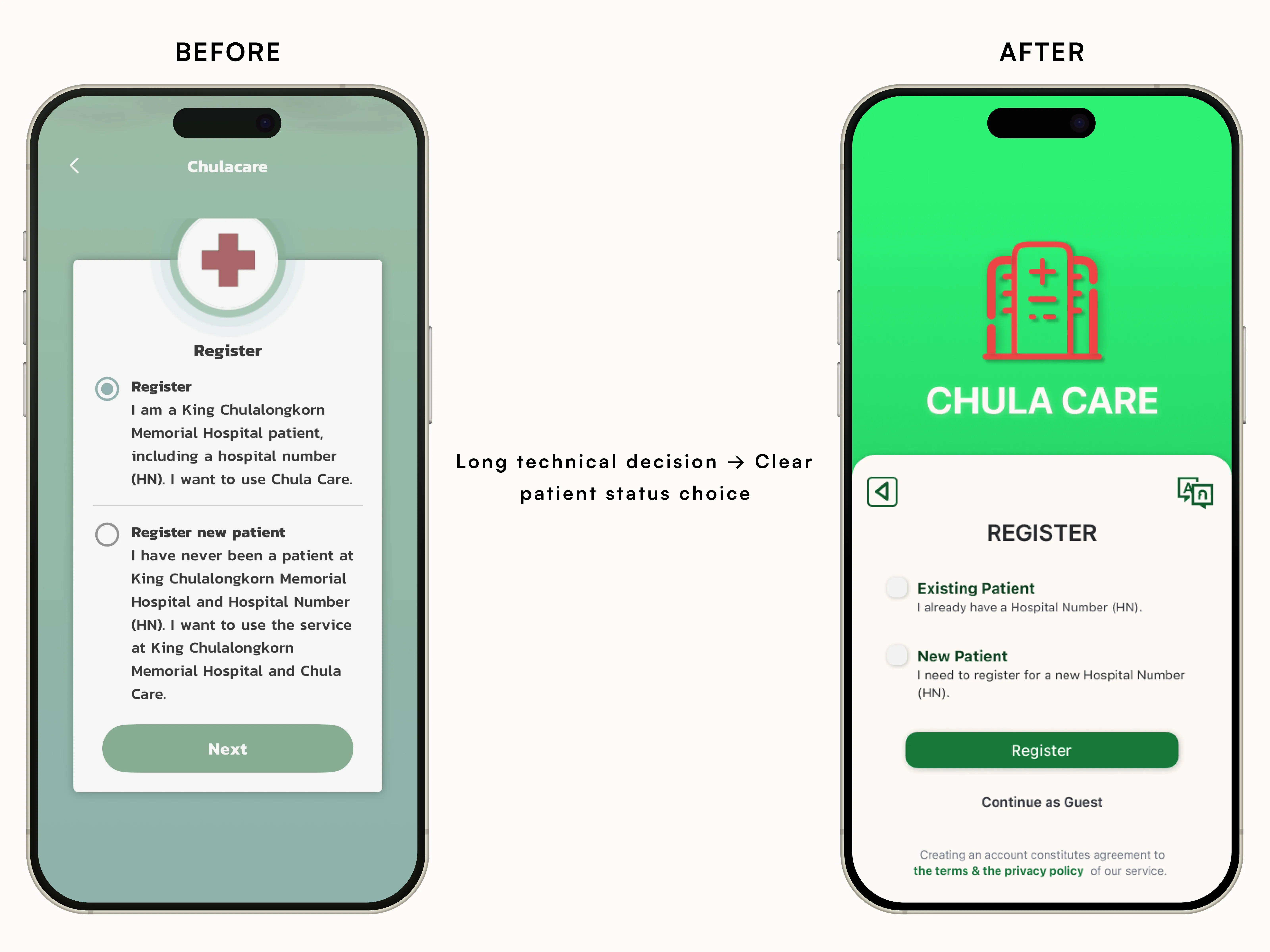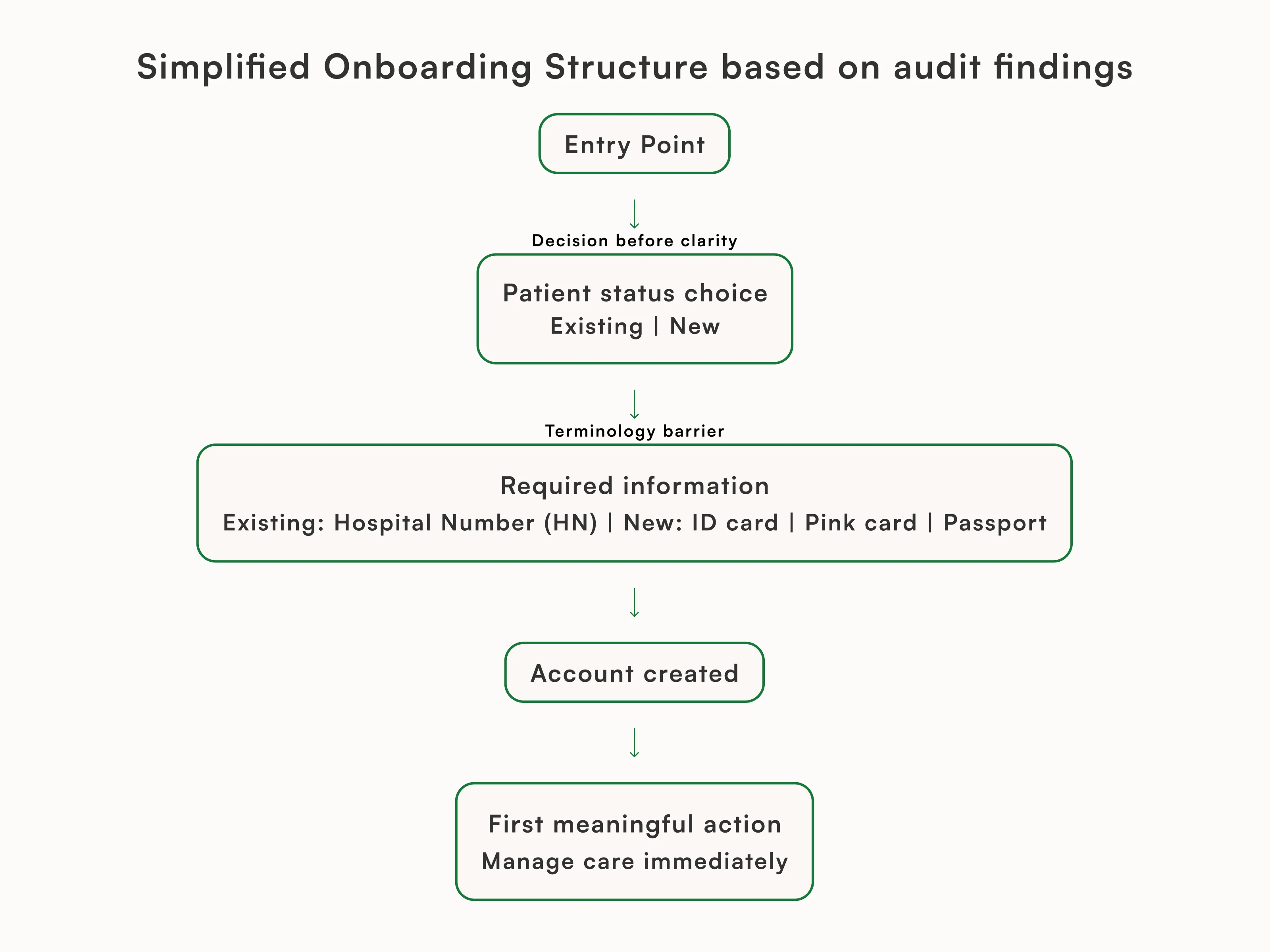 Audited a live hospital app and redesigned onboarding to reduce cognitive load, clarify patient paths, and support multiple ID types and guest access.